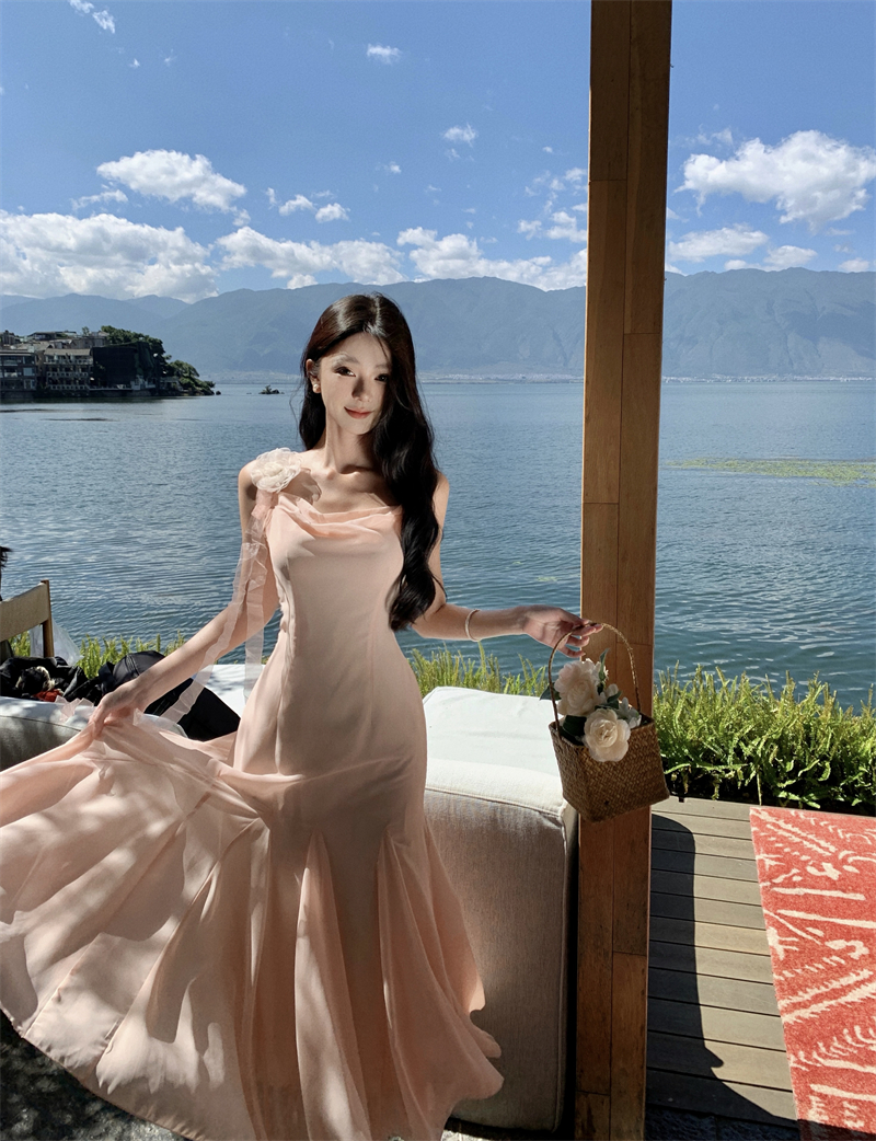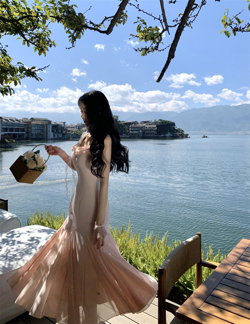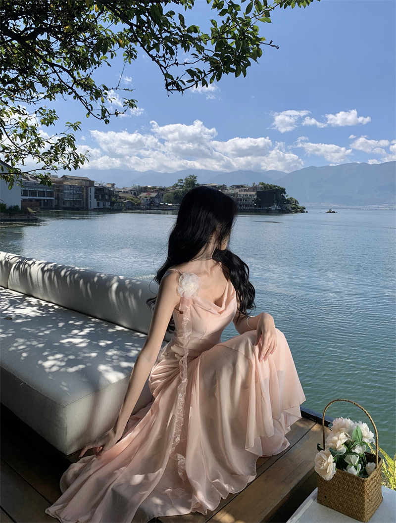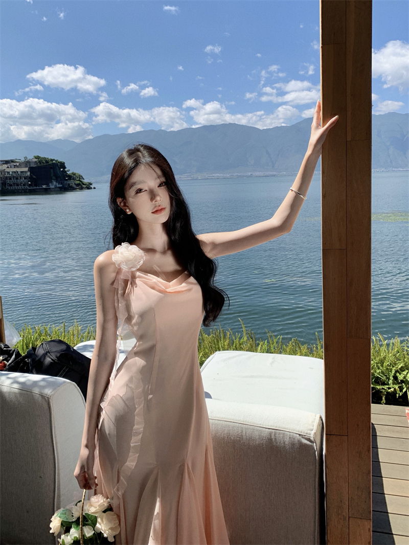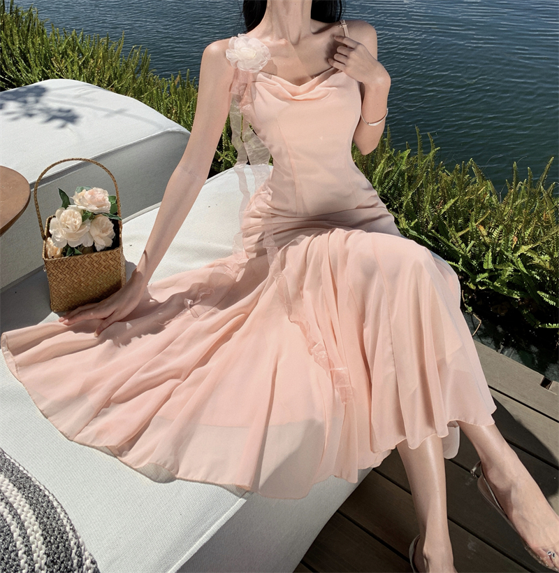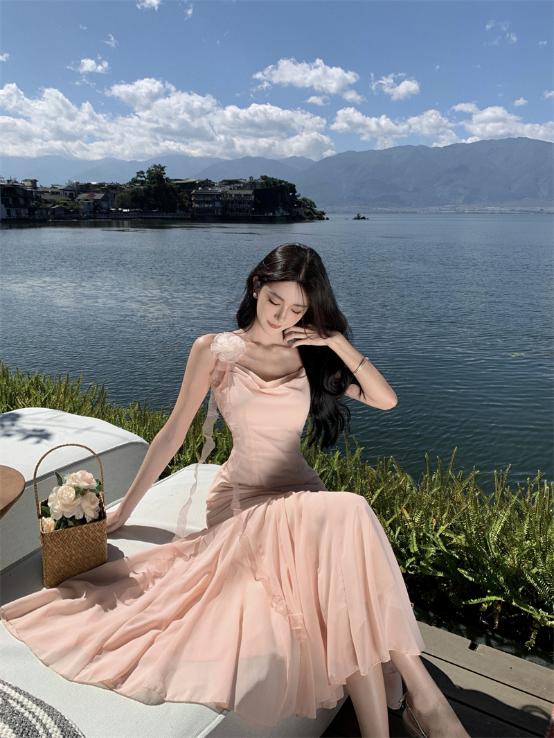 MY16923# 草木葱茏的凉意仙气飘飘气质大露背粉色吊带裙女夏季收腰显瘦长裙女裝貨源服裝批發