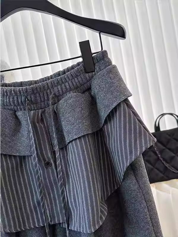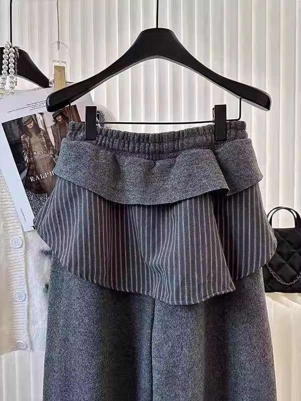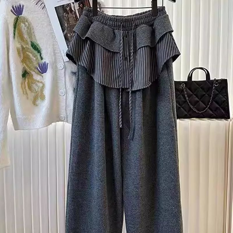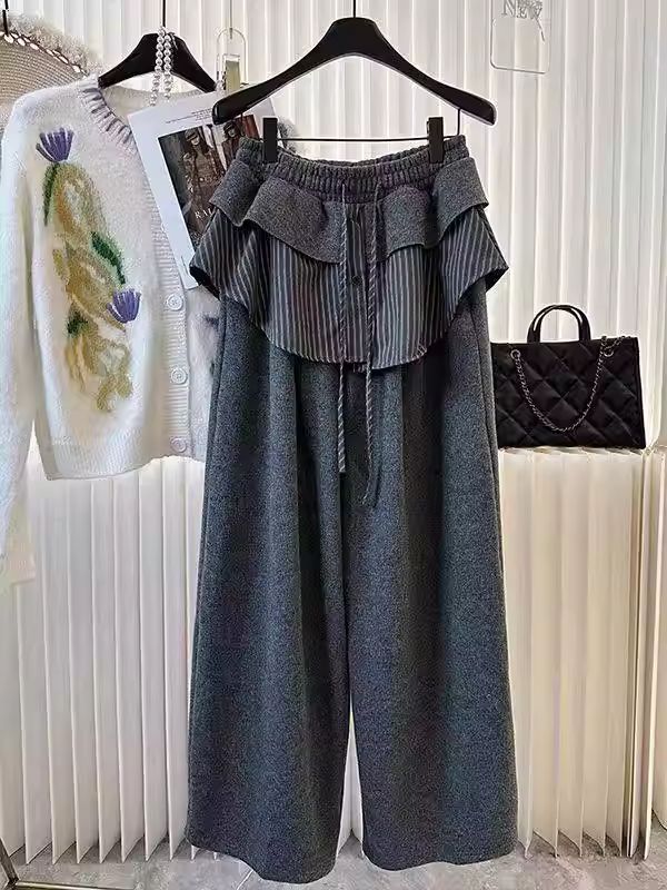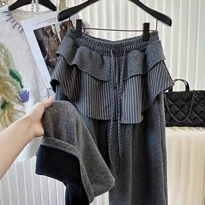 MY16963# 大码胖mm假两件条纹荷叶边加厚加绒裤子女装新款宽松阔腿裤潮女裝貨源服裝批發