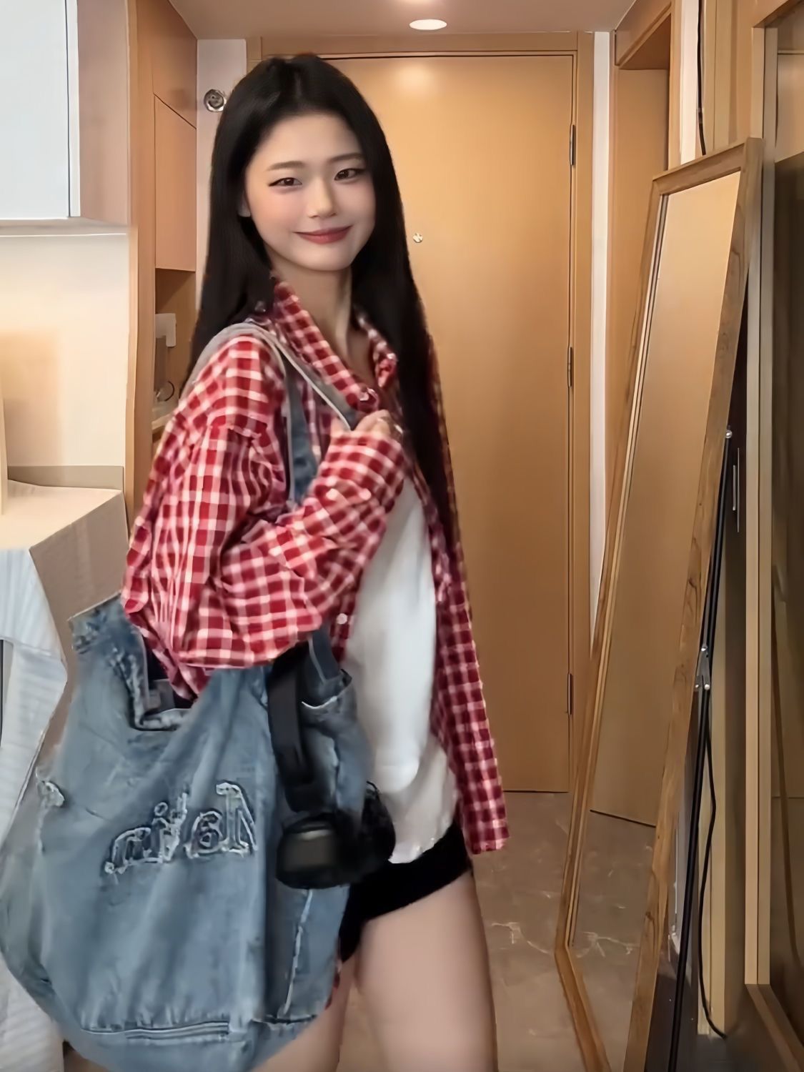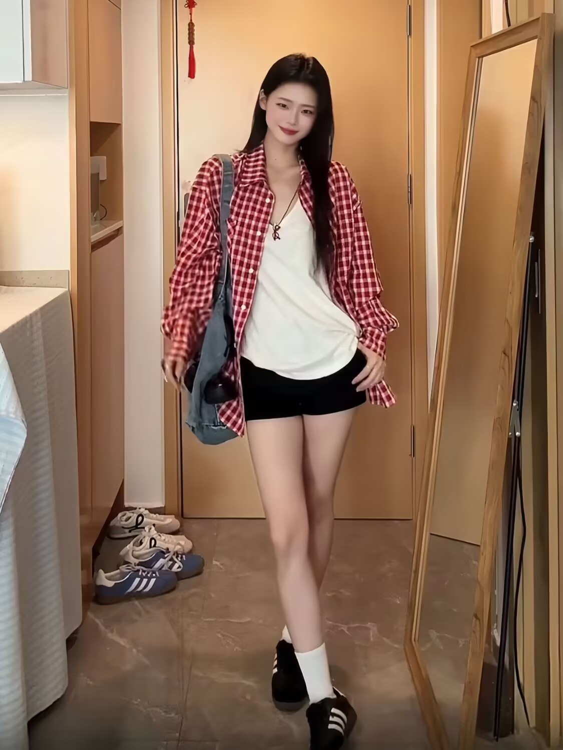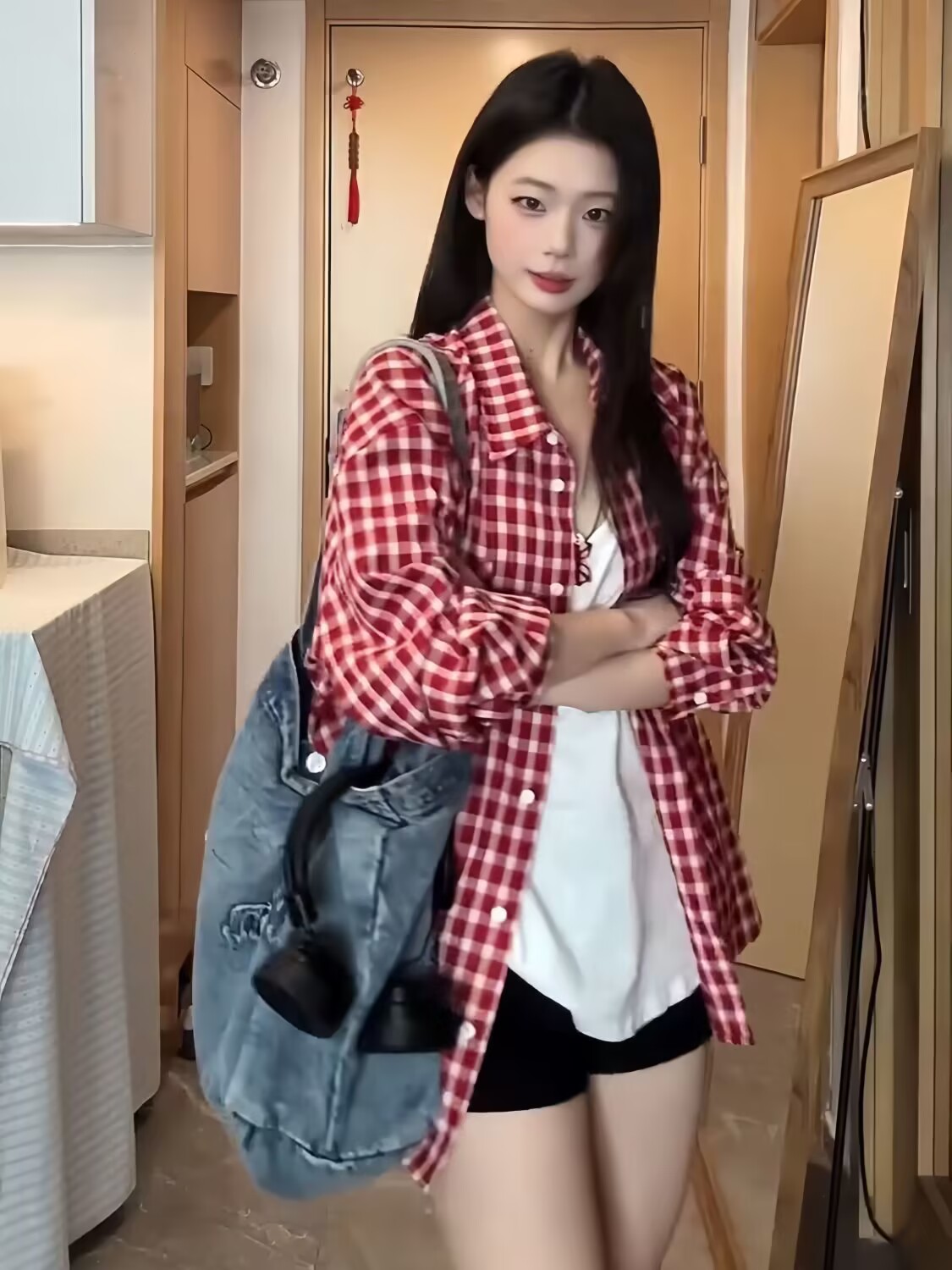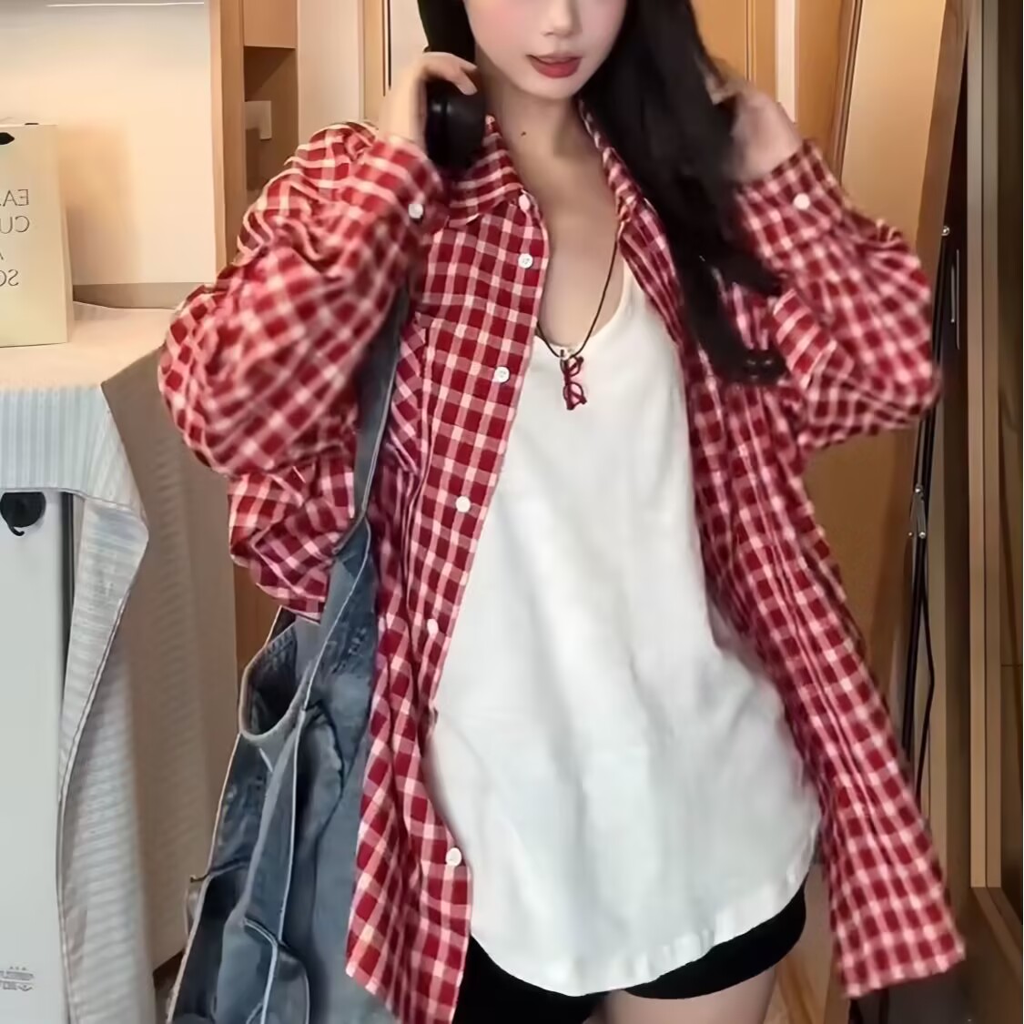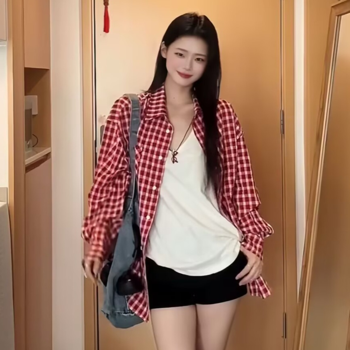 MY16988# 日系复古红色格子衬衫外套女夏季vintage松弛感休闲防晒衬衣外套女裝貨源服裝批發