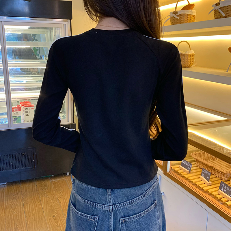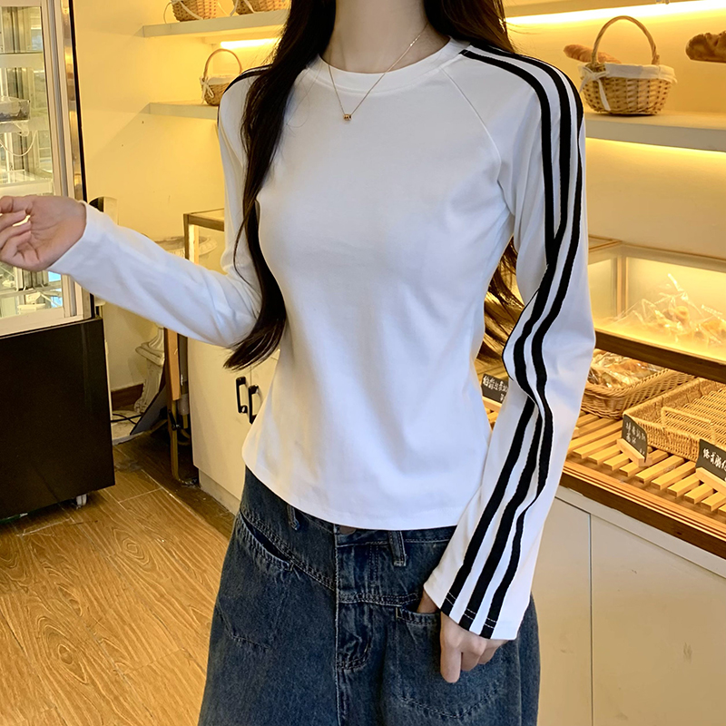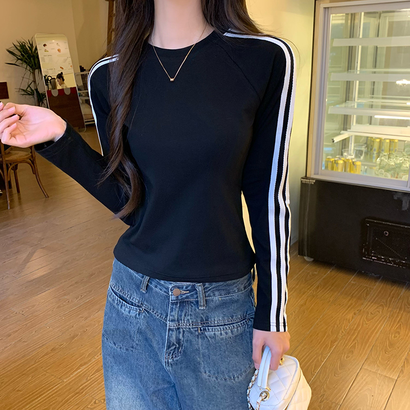 MY17010# 美式辣妹撞色插肩圆领三条杠长袖T恤女秋季修身短上衣内搭打底衫女裝貨源服裝批發