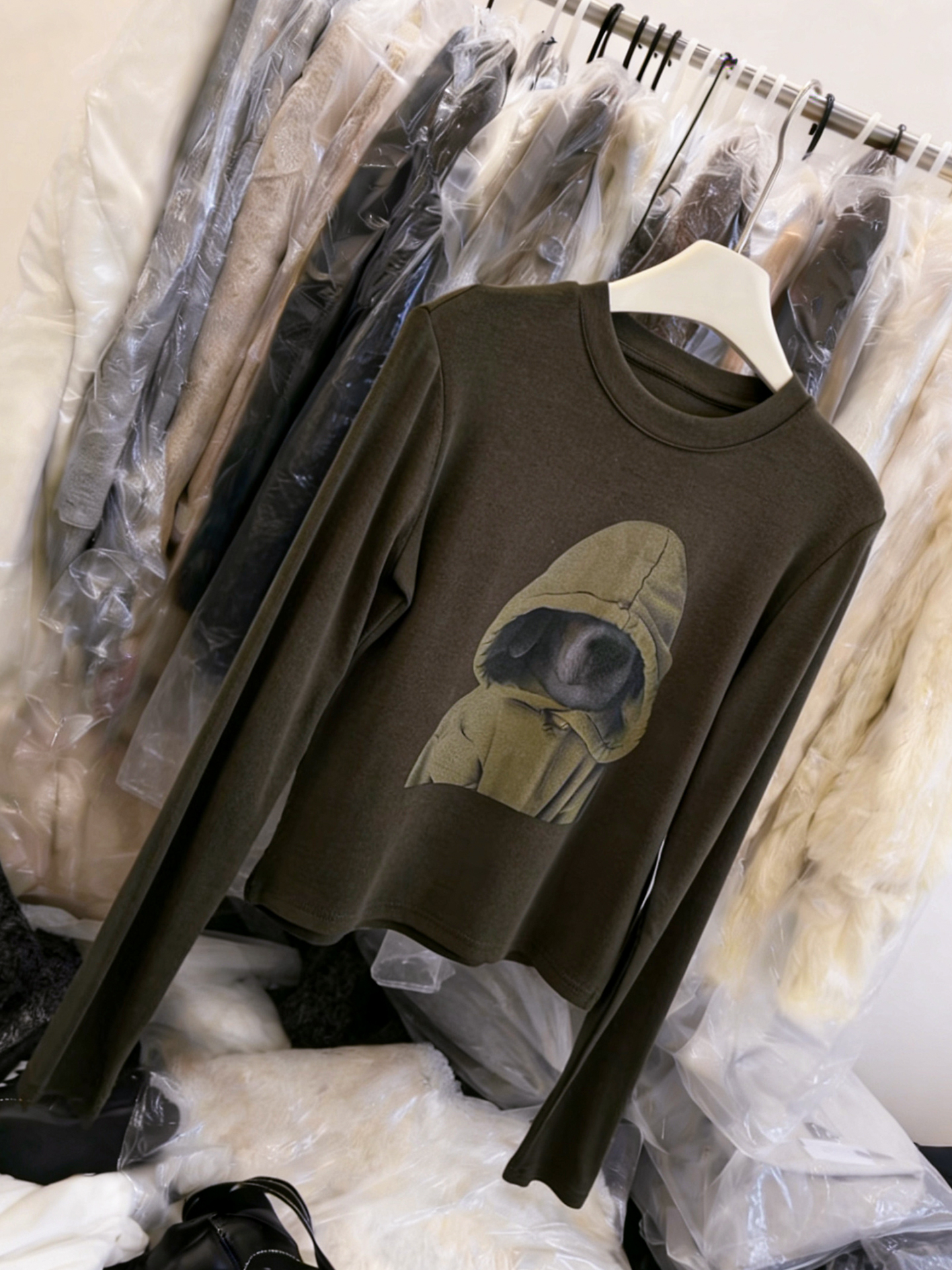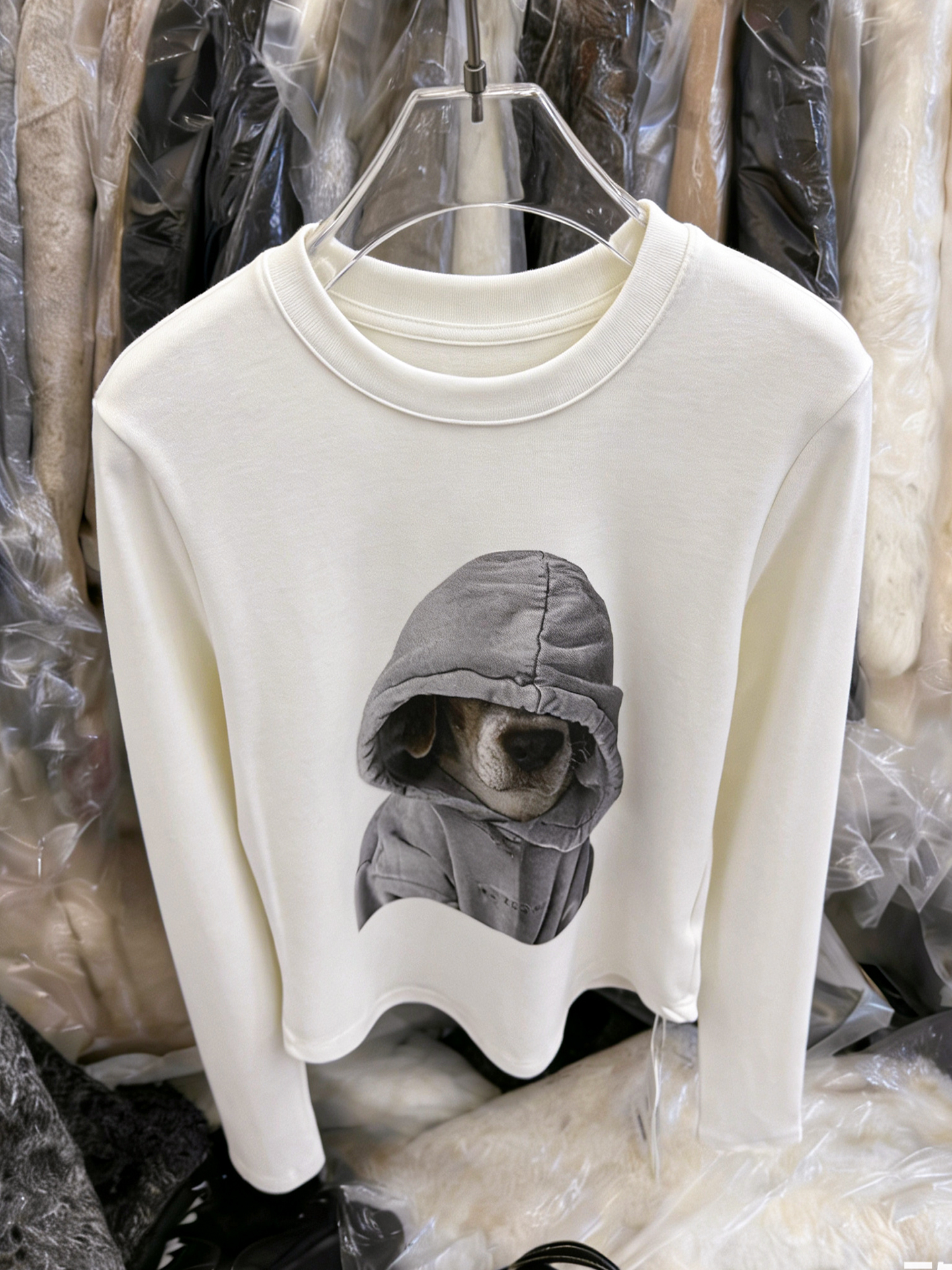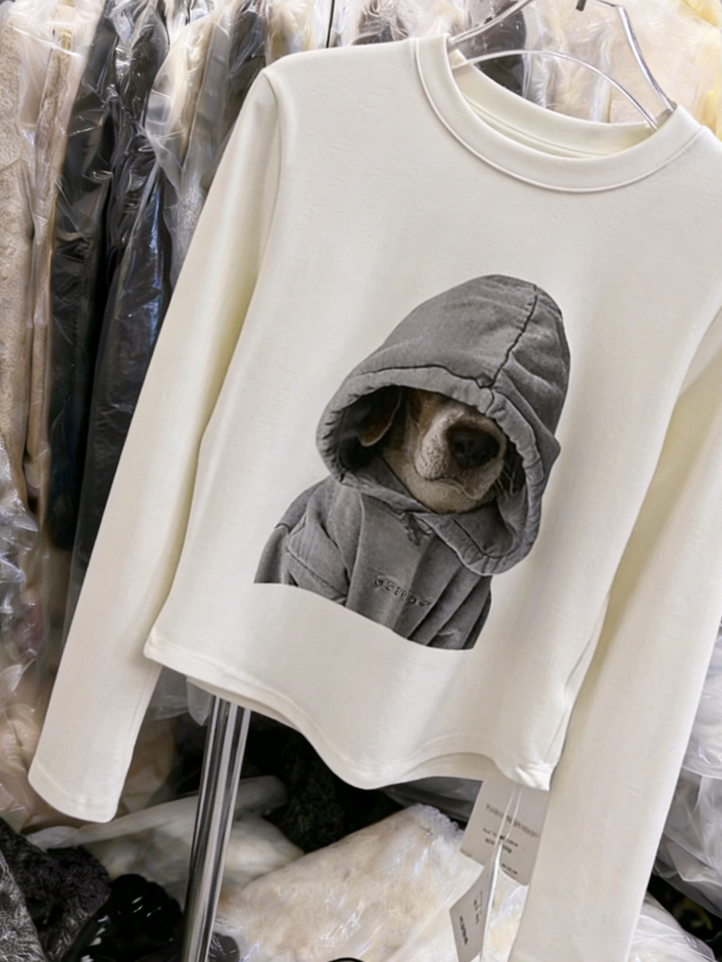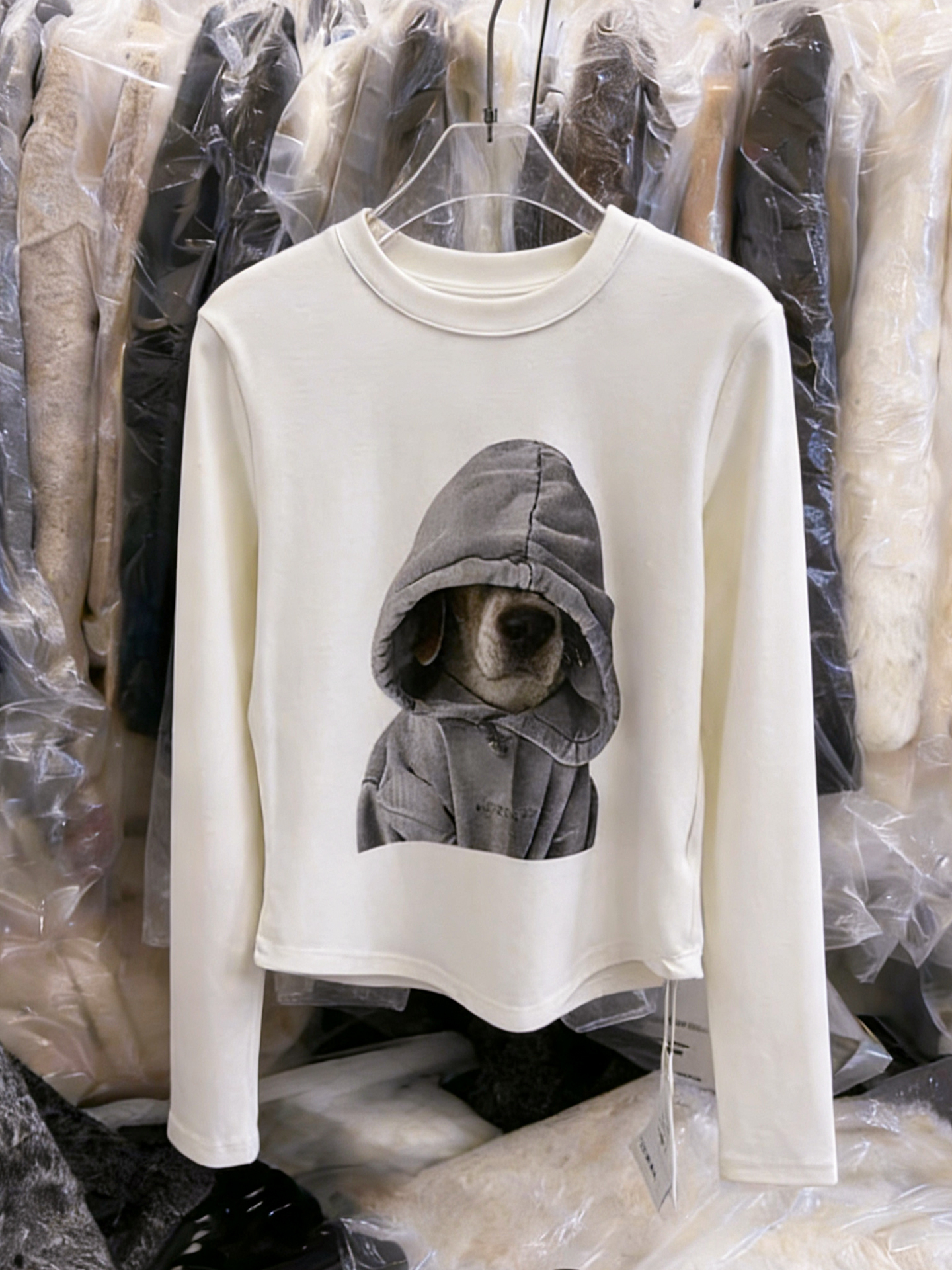 MY17019# 加绒磨毛美式小狗印花圆领长袖T恤女辣妹时髦打底衫修身显瘦上衣女裝貨源服裝批發