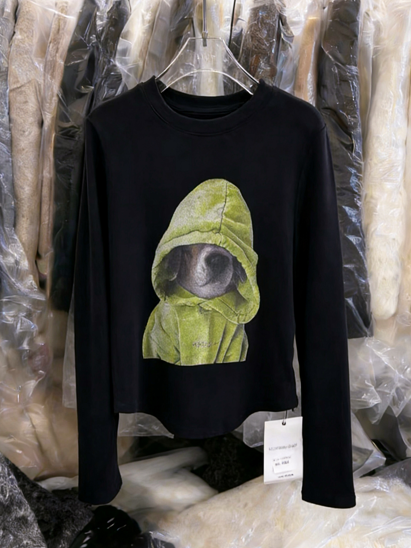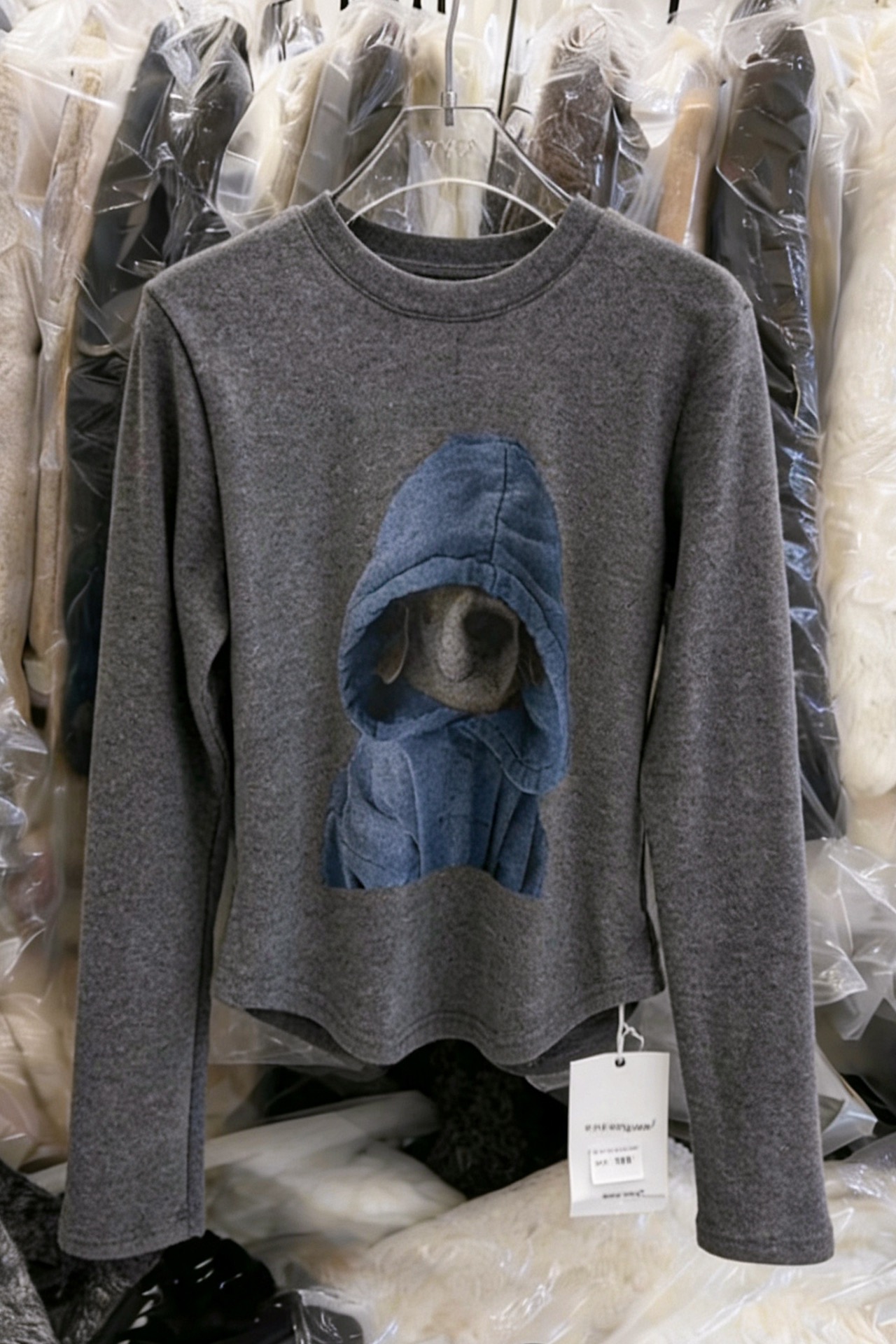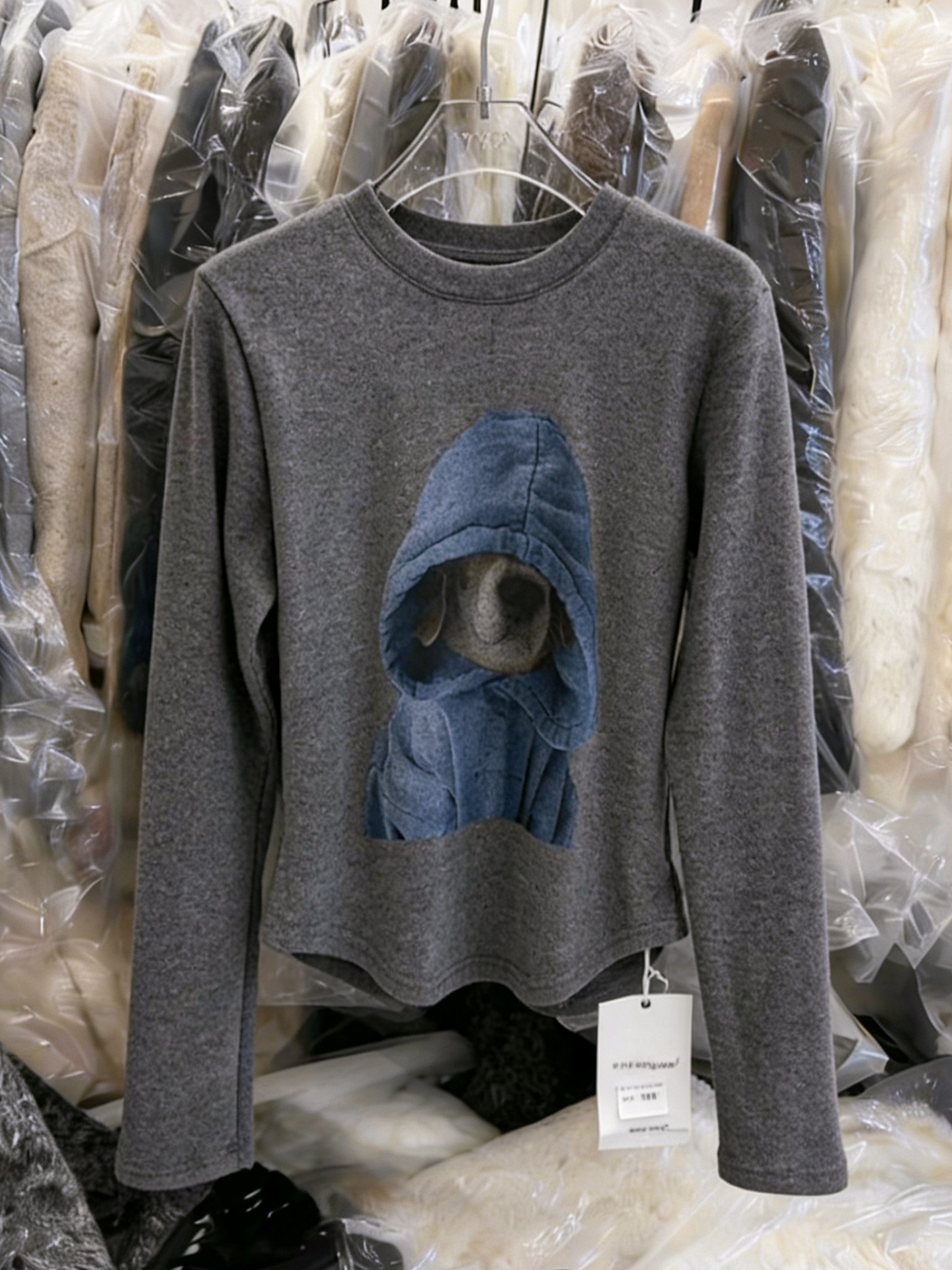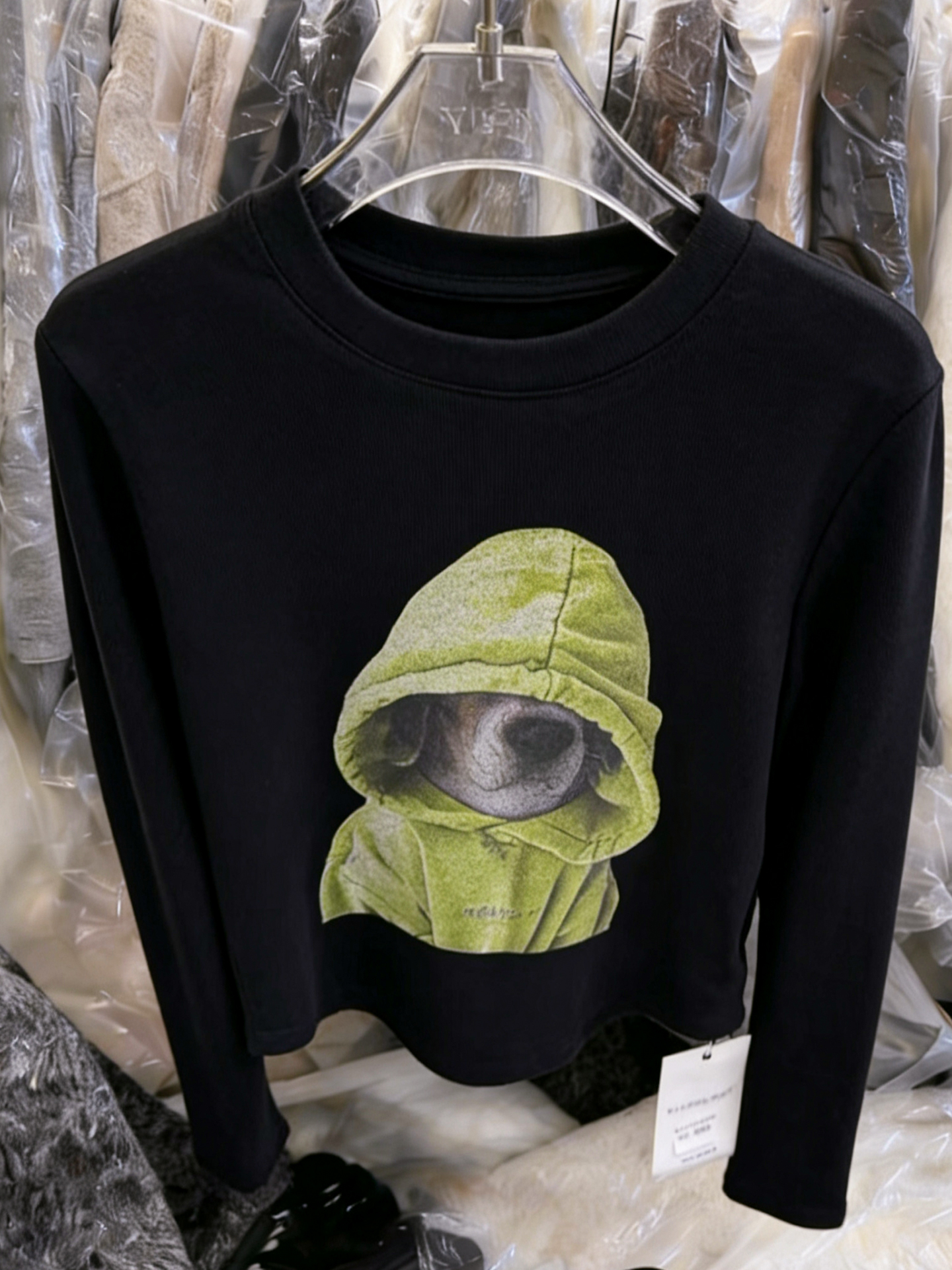 MY17019# 加绒磨毛美式小狗印花圆领长袖T恤女辣妹时髦打底衫修身显瘦上衣女裝貨源服裝批發