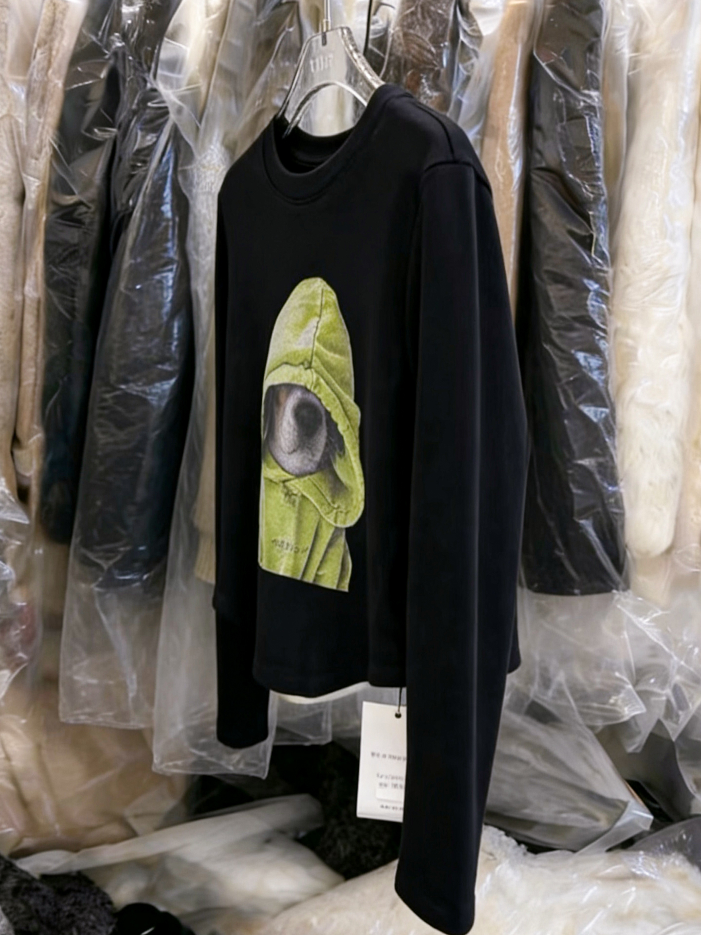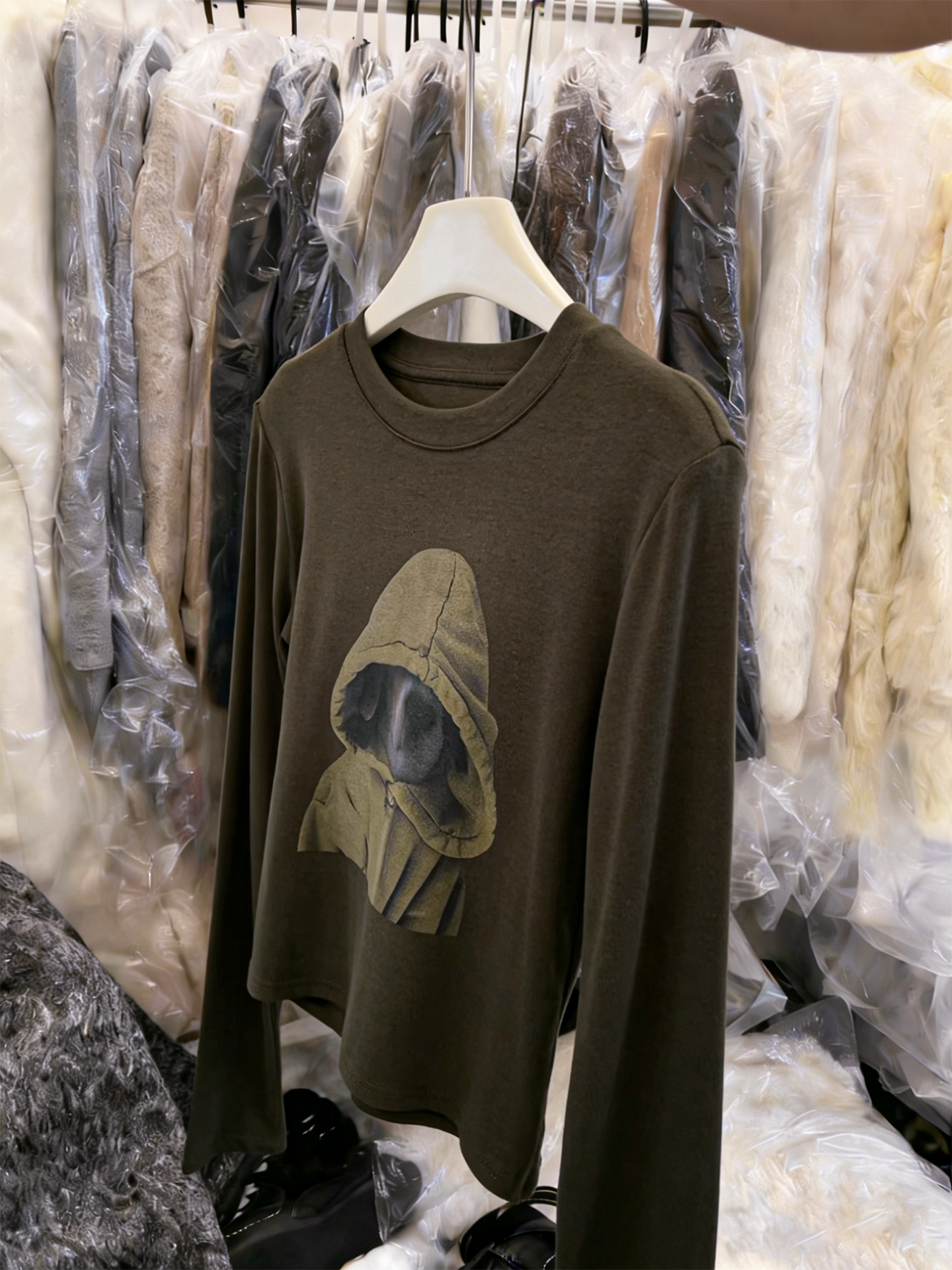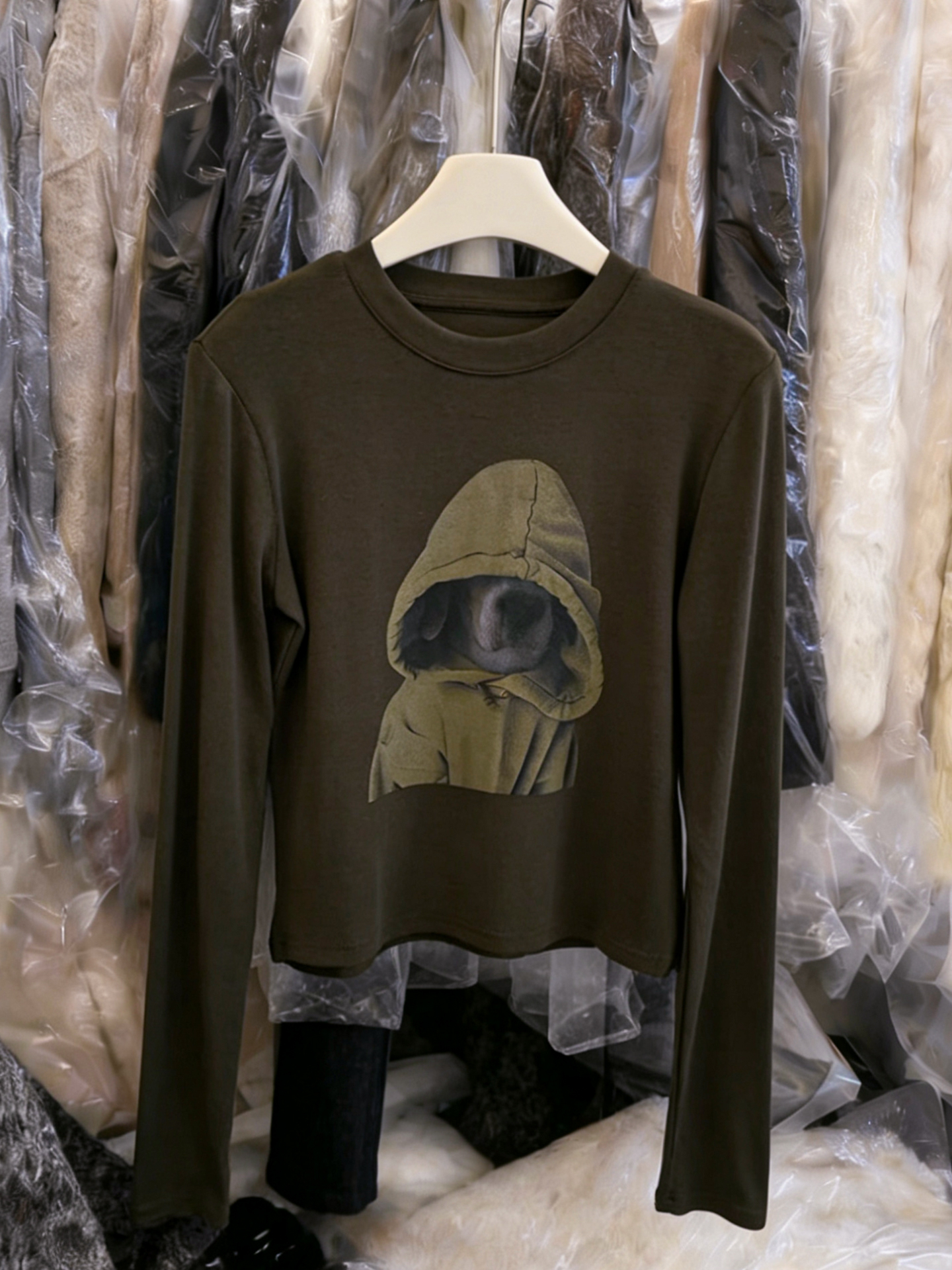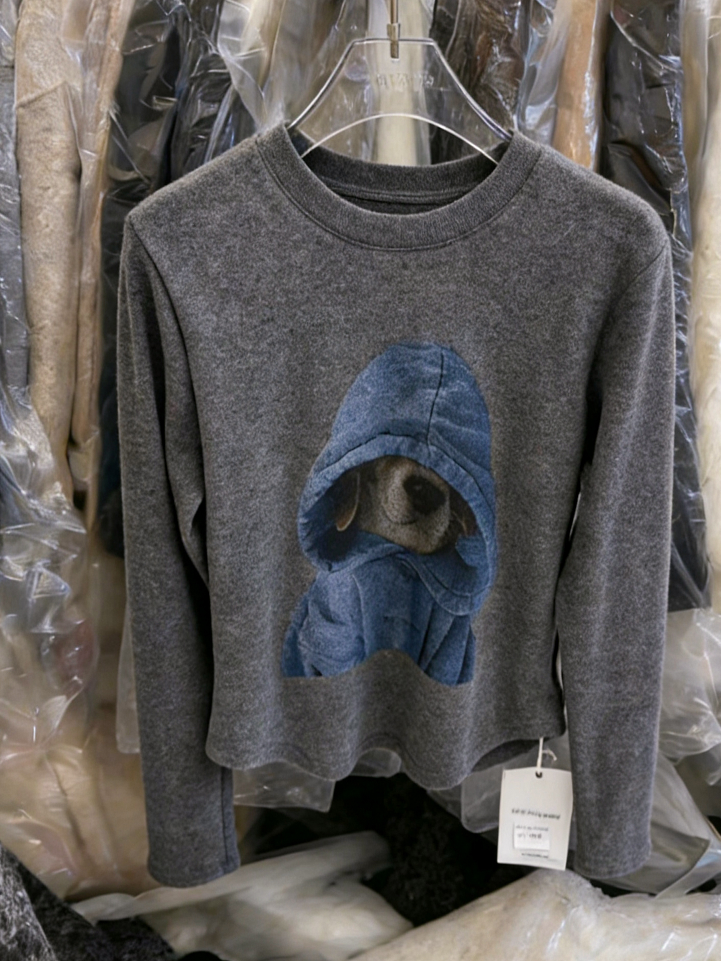 MY17019# 加绒磨毛美式小狗印花圆领长袖T恤女辣妹时髦打底衫修身显瘦上衣女裝貨源服裝批發