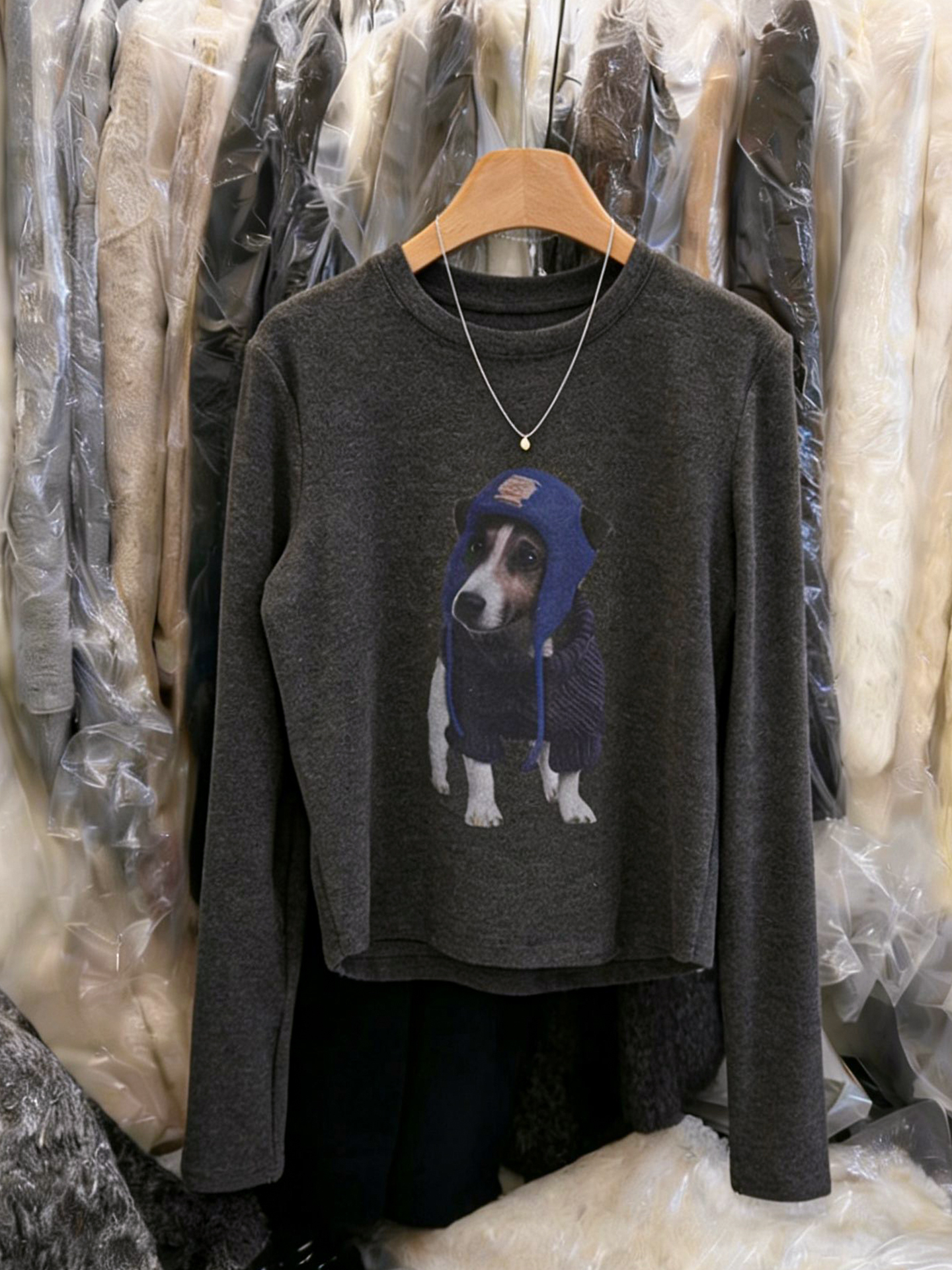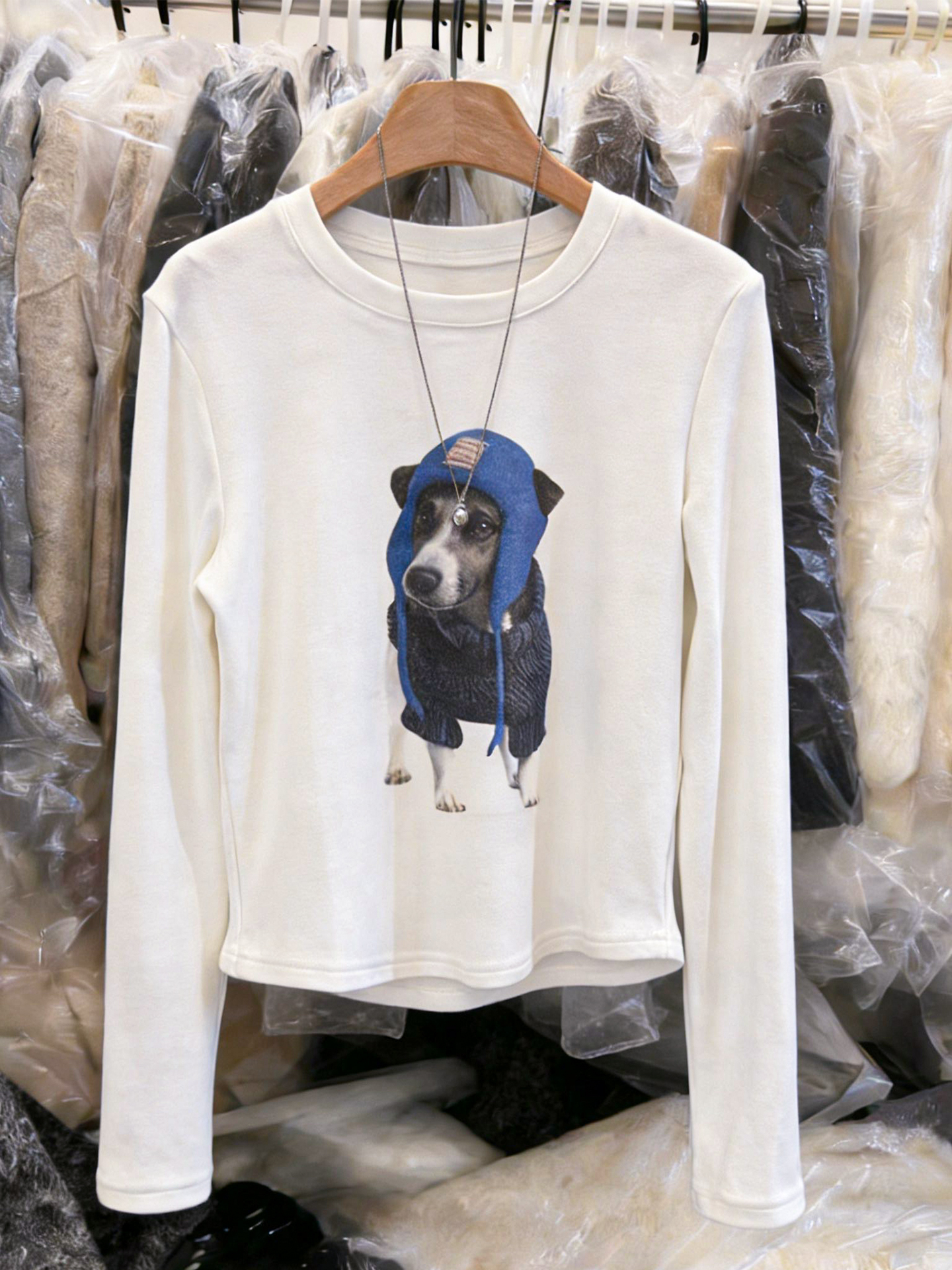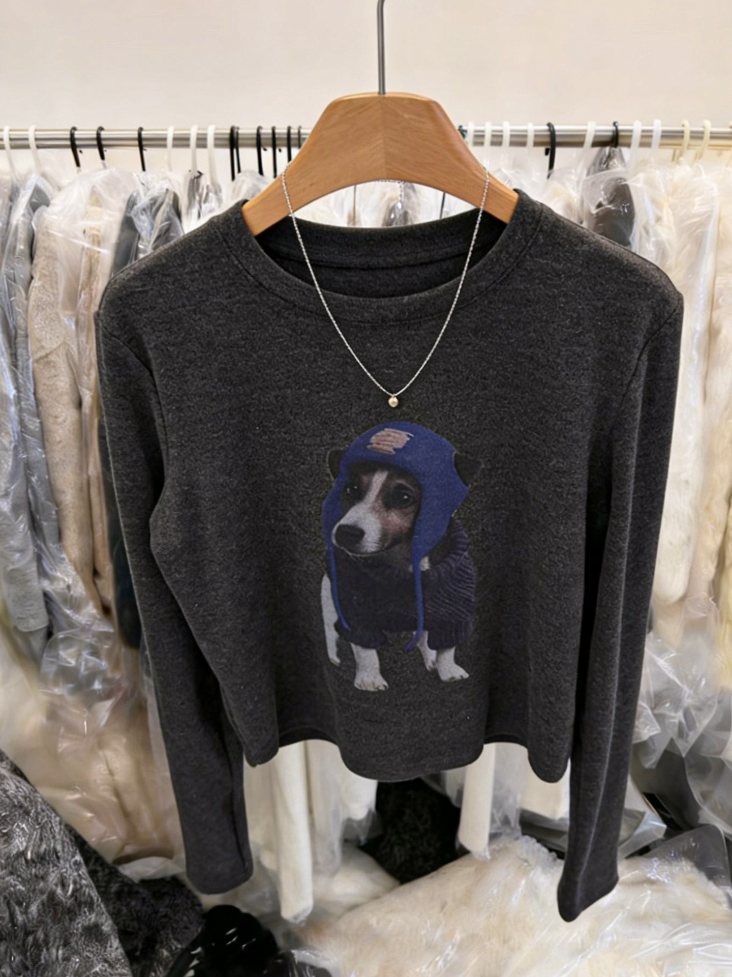 MY17020# 磨毛加绒印花卡通小狗显瘦小众长袖T恤女秋季新款软糯百搭打底衫女裝貨源服裝批發