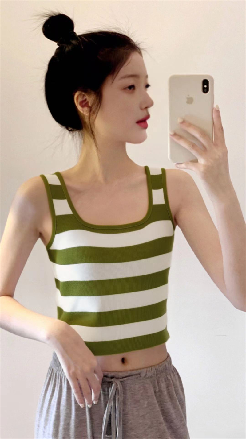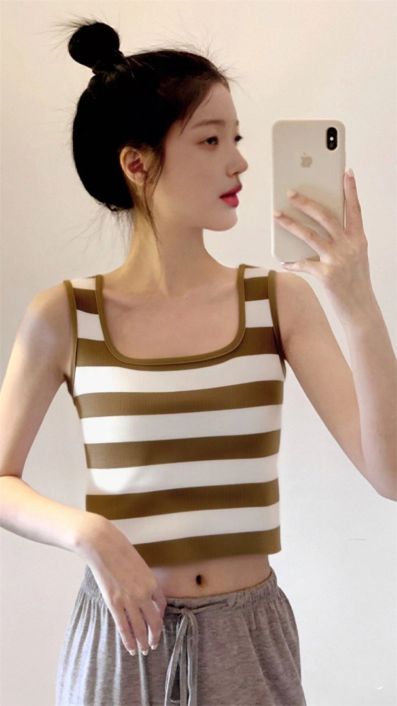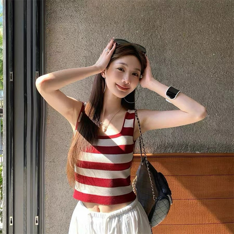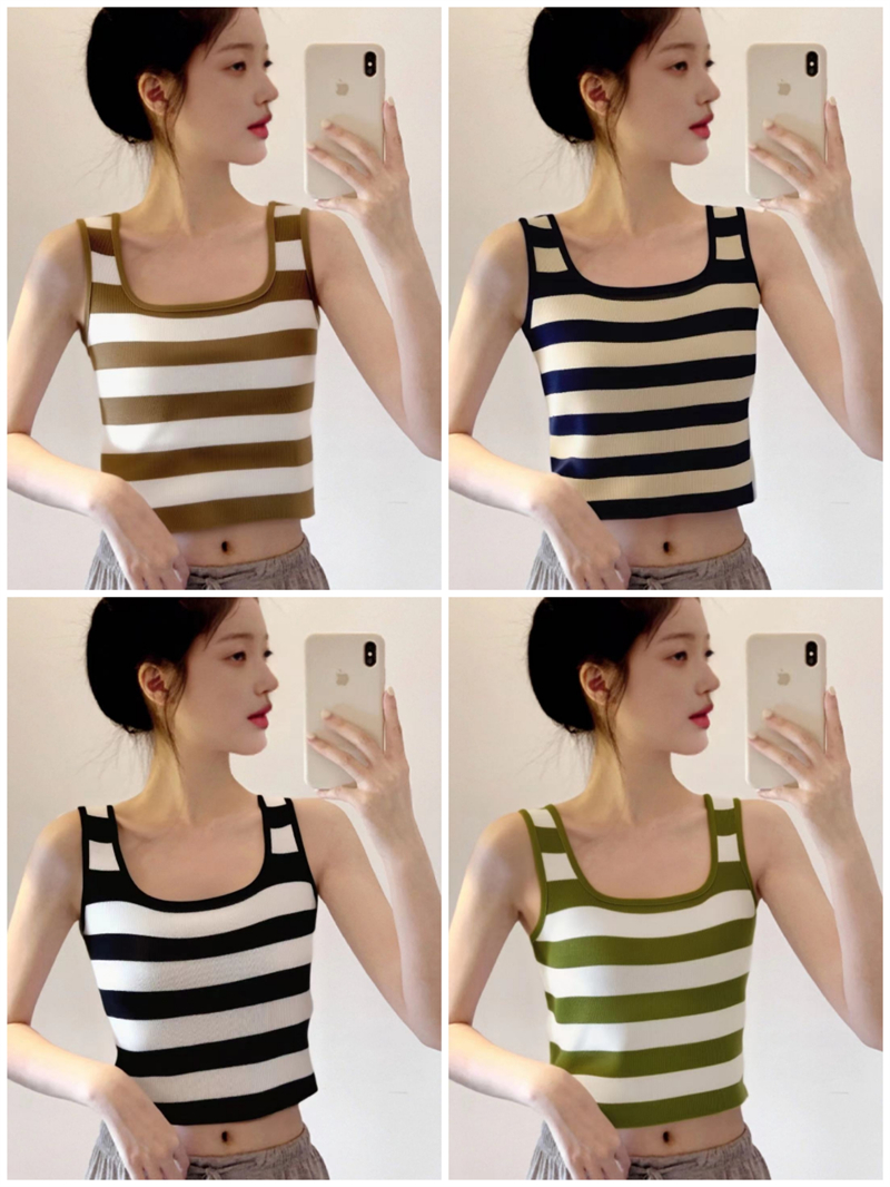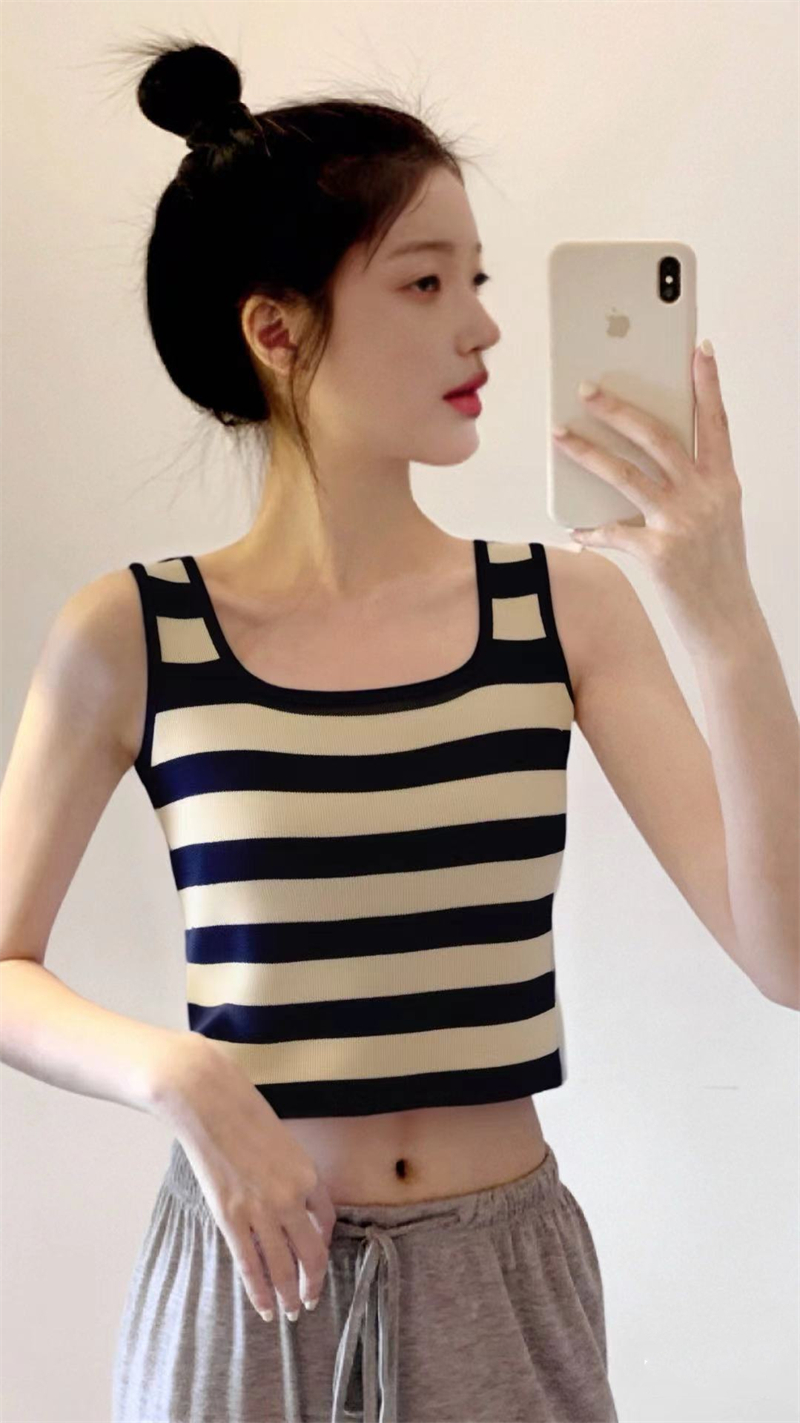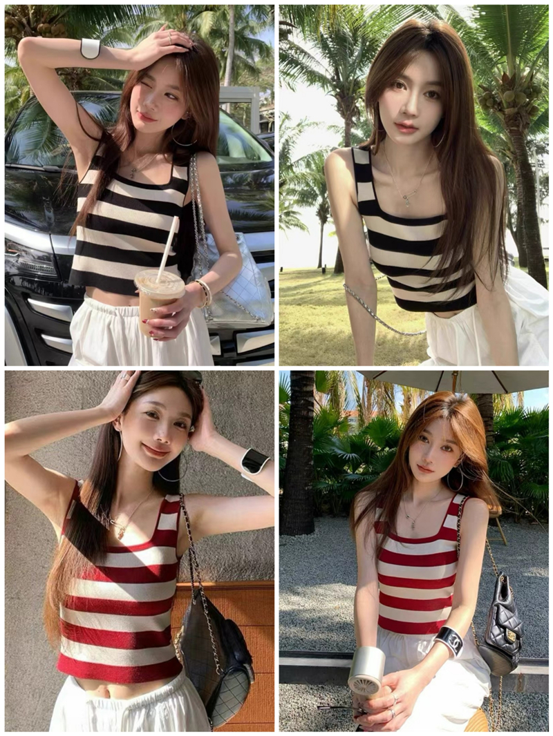 MY17034# 夏季新款韩版甜美方领撞色条纹无袖修身显瘦短款背心上衣女裝貨源服裝批發
