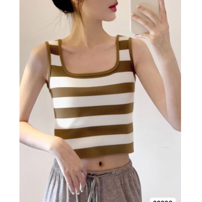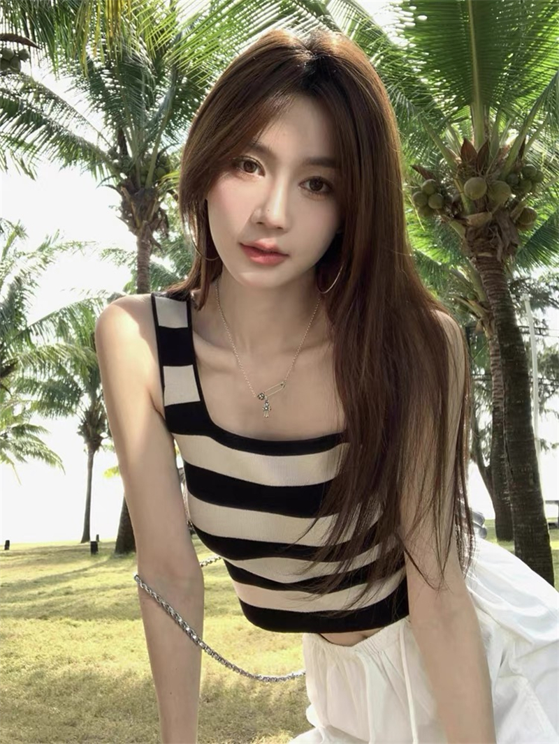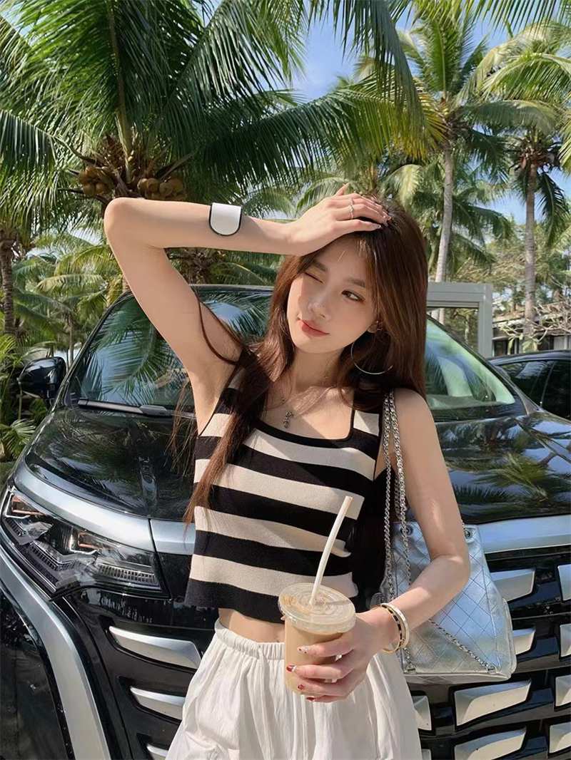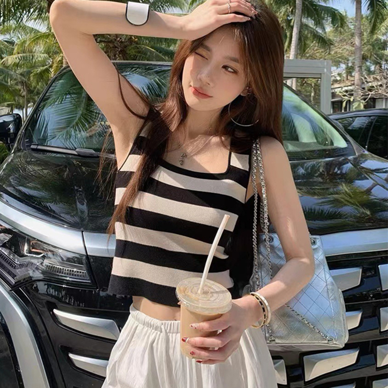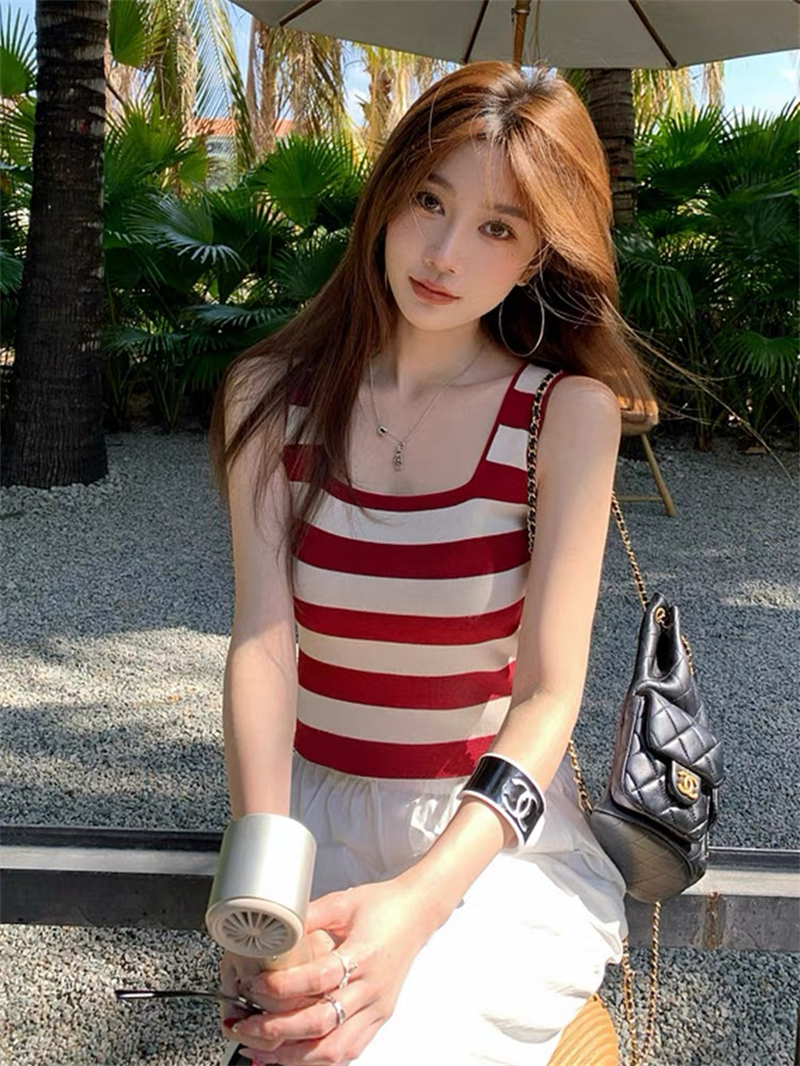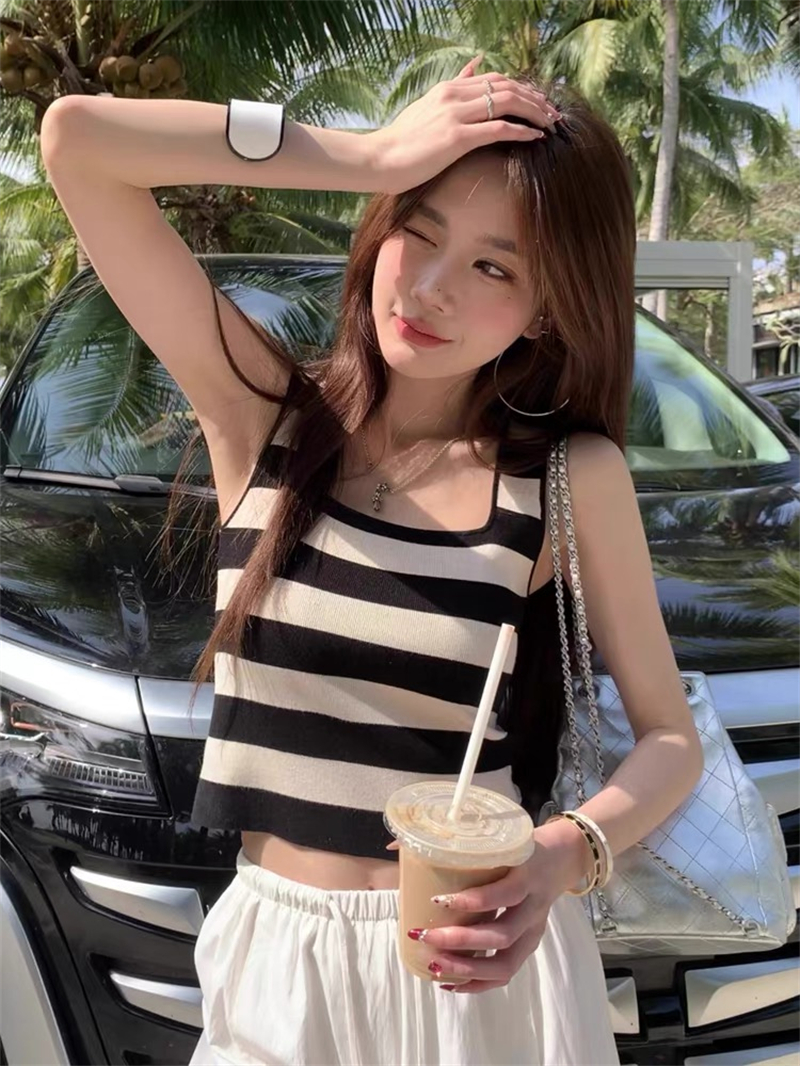 MY17034# 夏季新款韩版甜美方领撞色条纹无袖修身显瘦短款背心上衣女裝貨源服裝批發