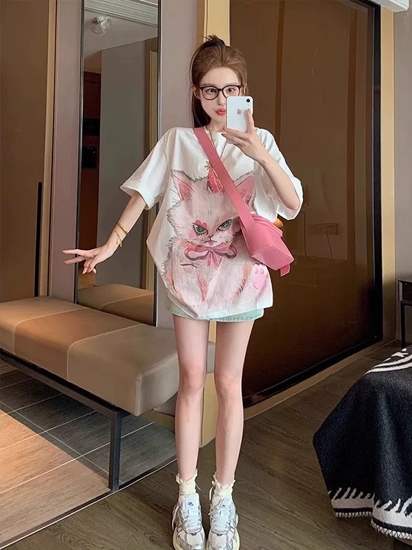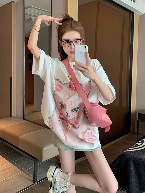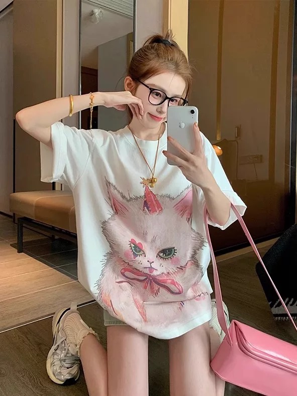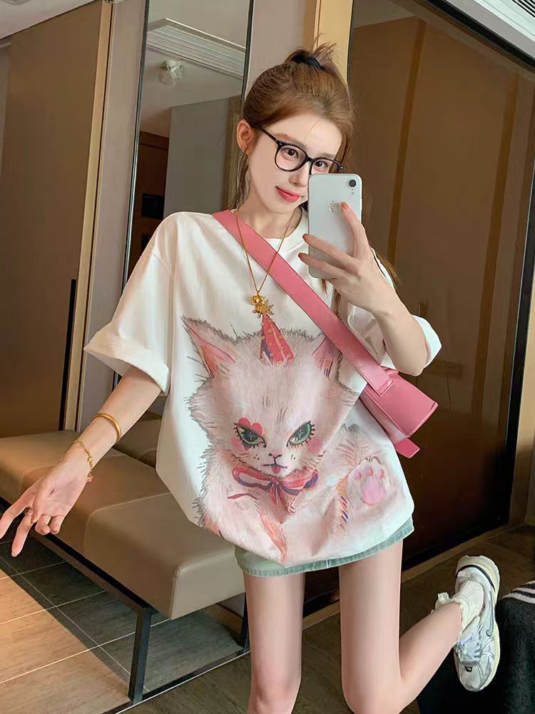 MY17044# 韩系甜美猫咪印花T恤女新款设计感晕染宽松百搭短袖上衣女裝貨源服裝批發