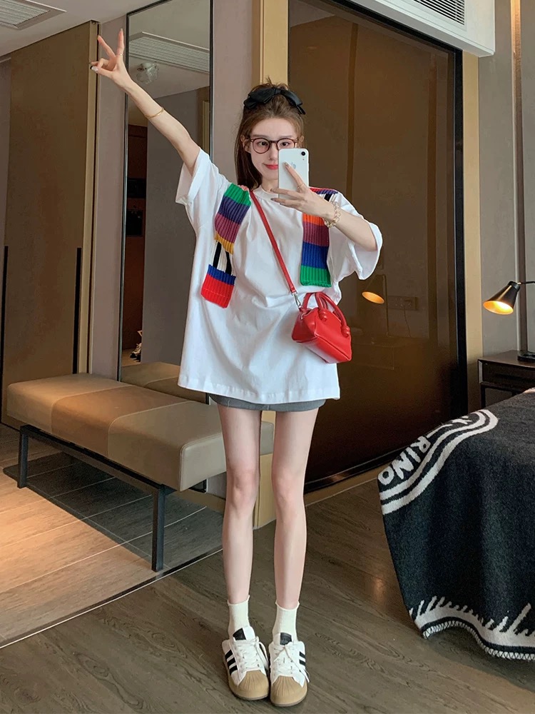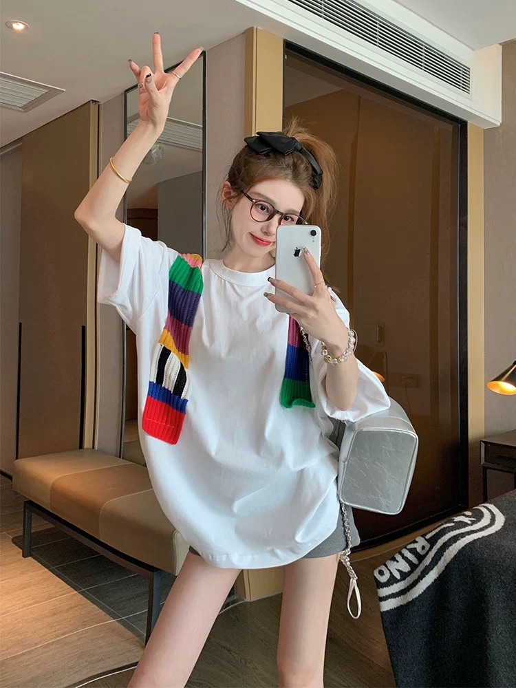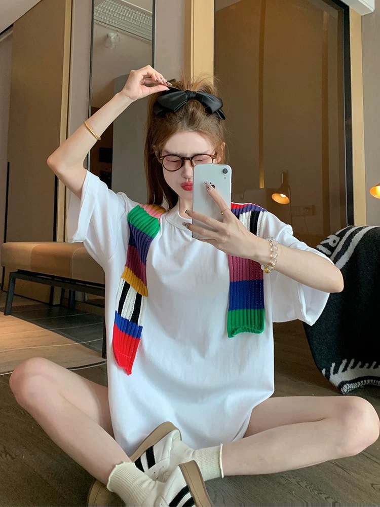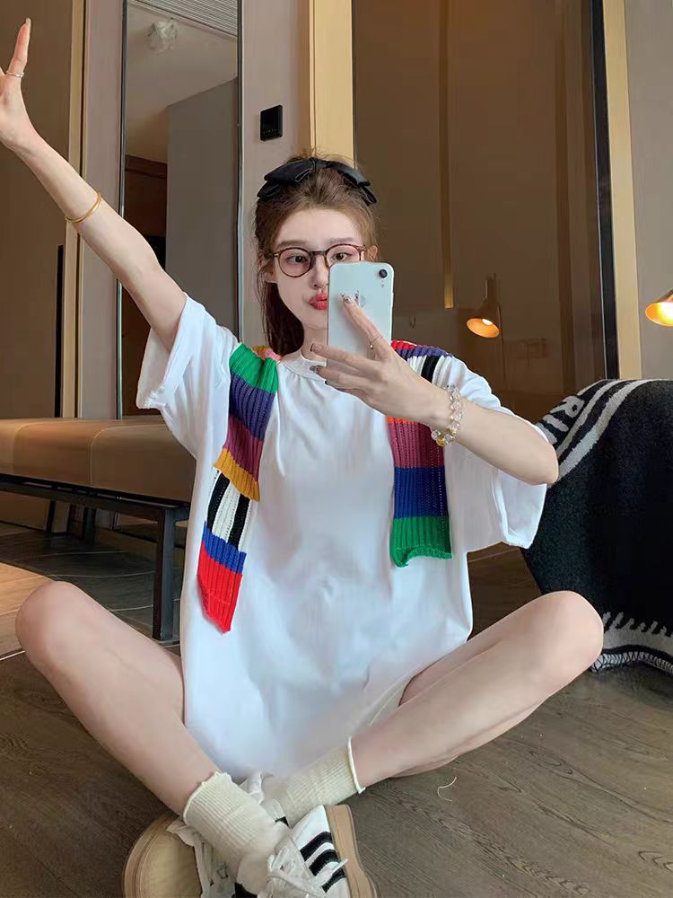 MY17045# 白色拼接披肩纯棉短袖t恤女夏季2026设计感小众欧货大版体恤上衣女裝貨源服裝批發