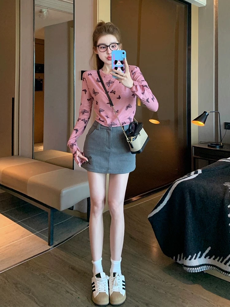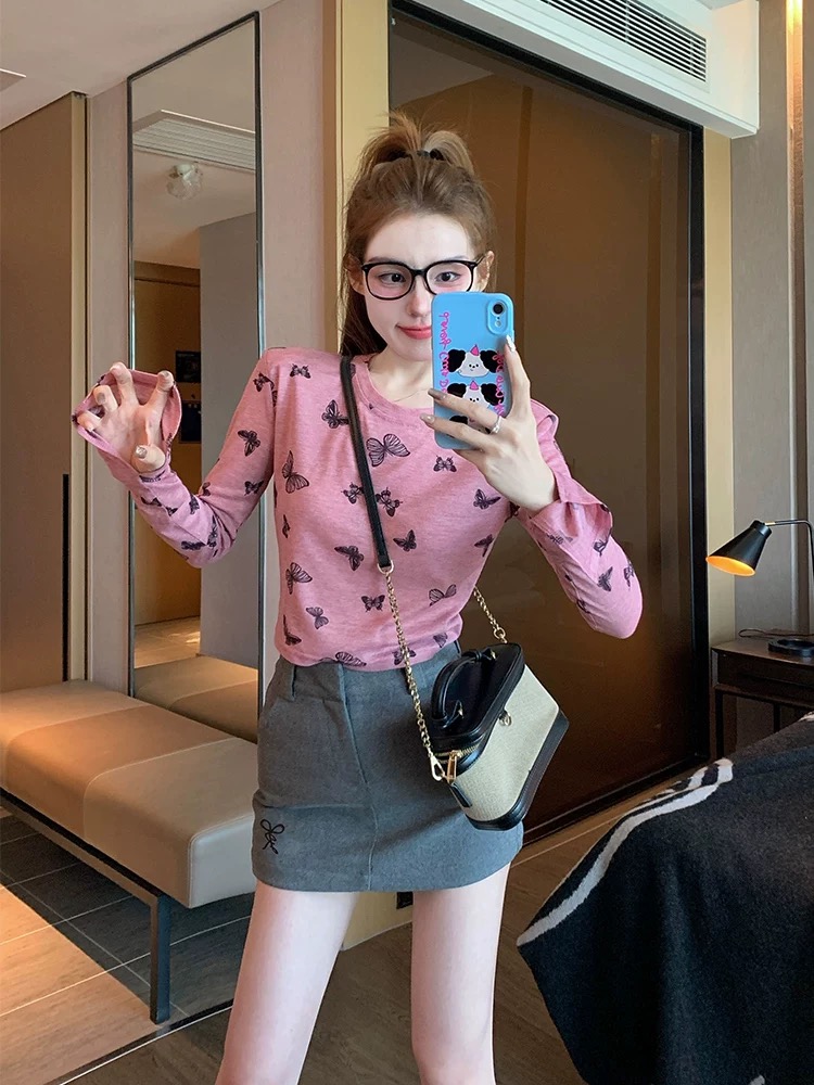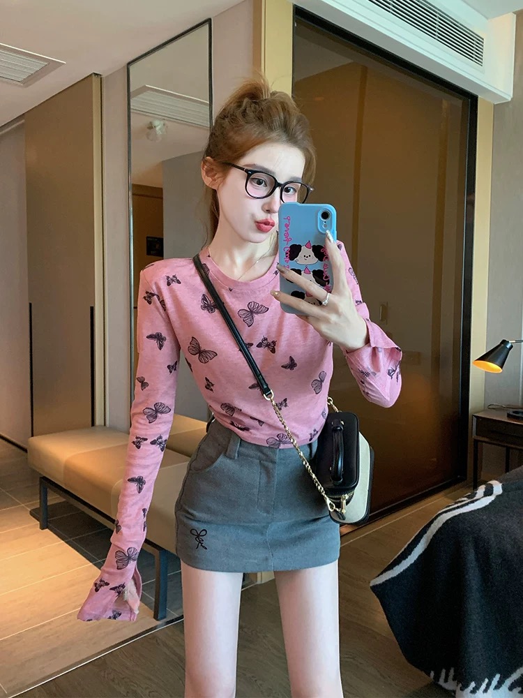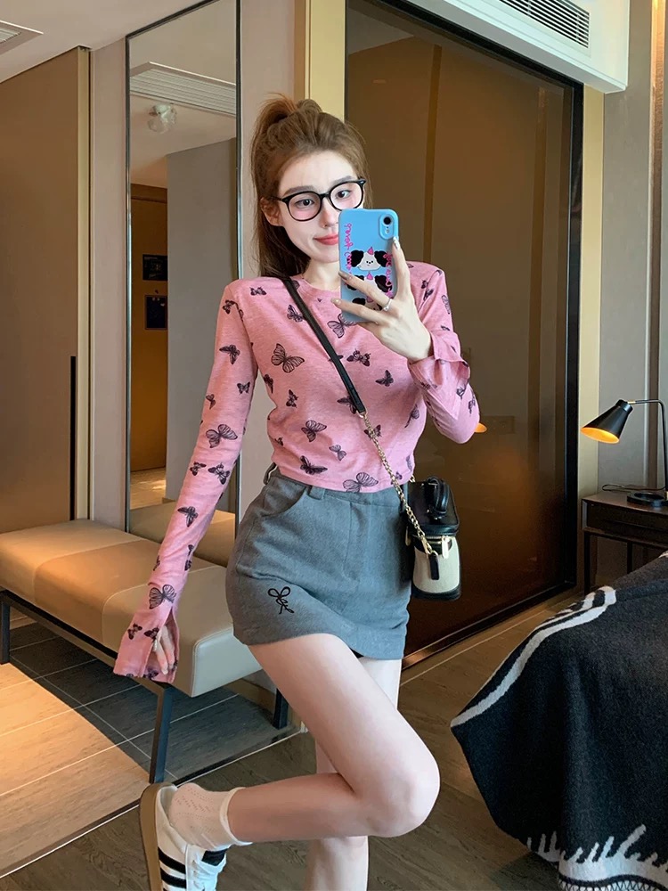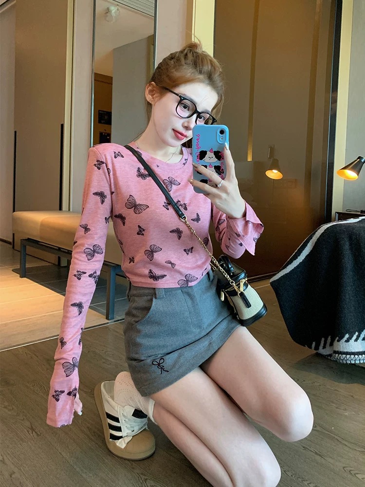MY17052# 蝴蝶正肩长袖t恤女夏季薄款2026新款港味复古修身打底衫上衣春秋女裝貨源服裝批發
