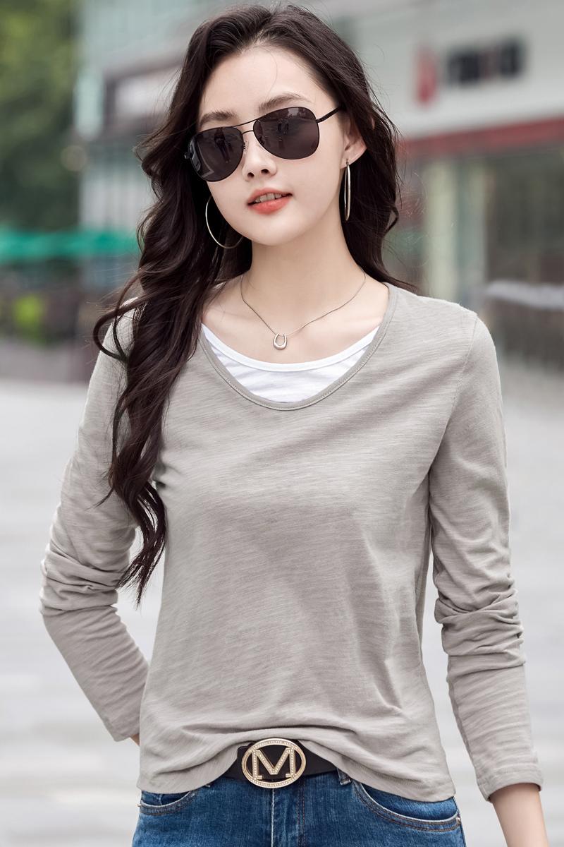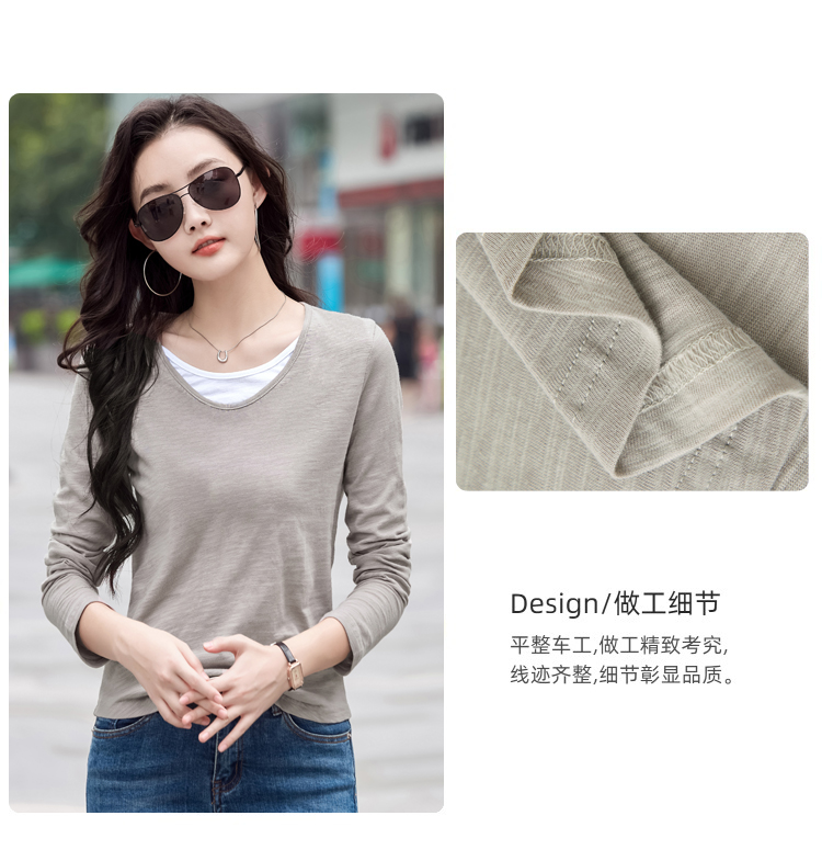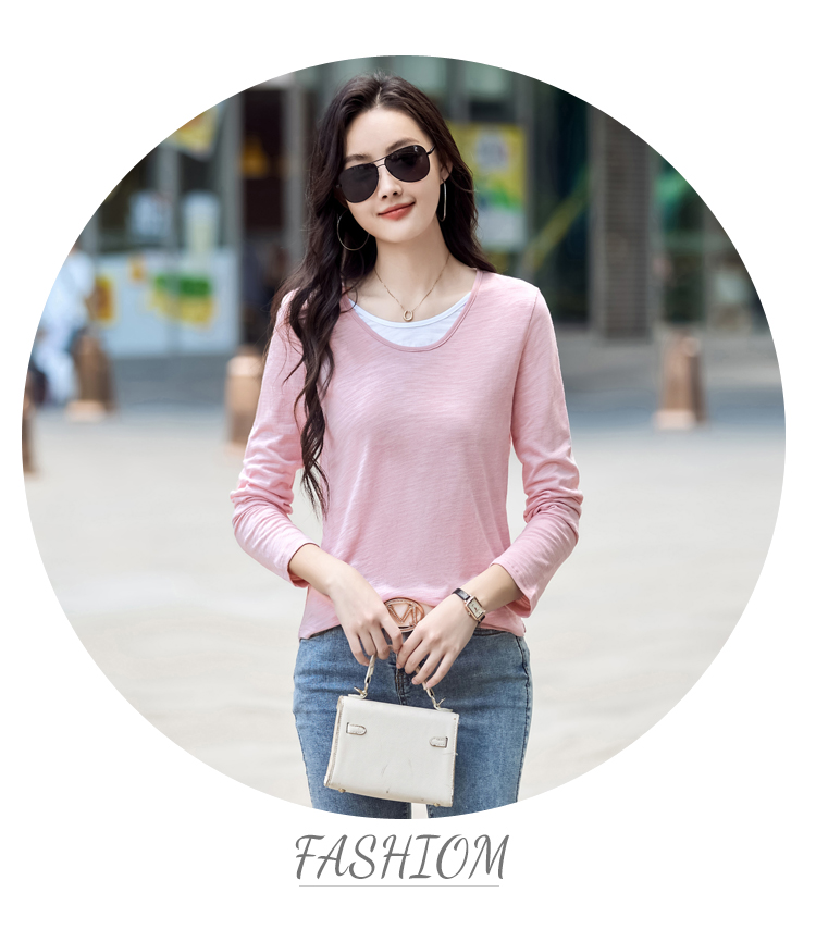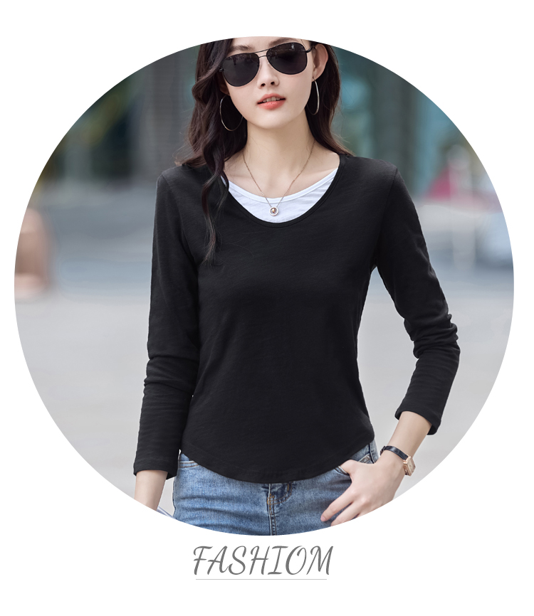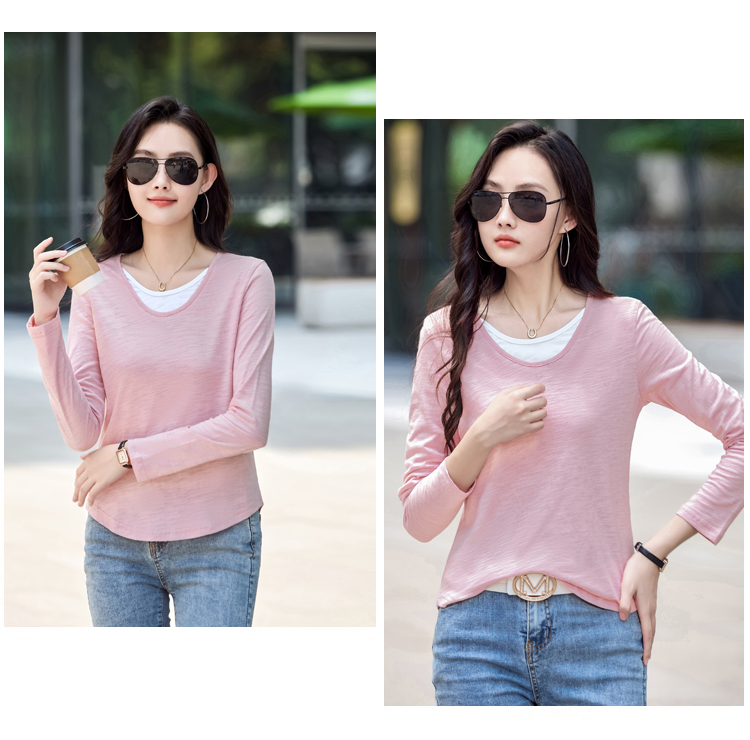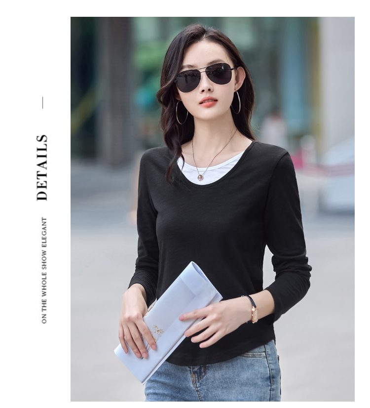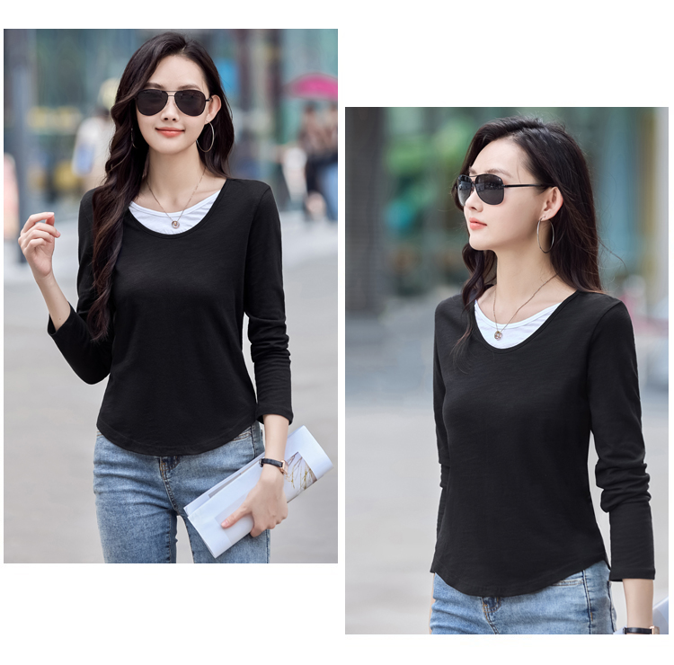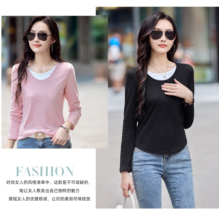 MY17126# 大码洋气显瘦宽松V领假两件长袖T恤新款纯棉宽松上衣打底衫女裝貨源服裝批發