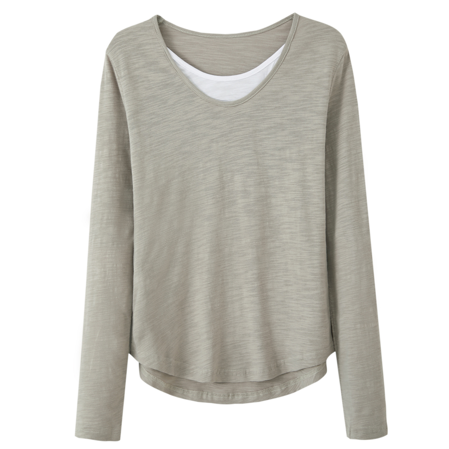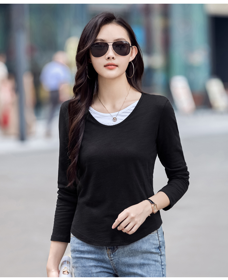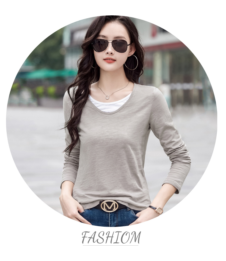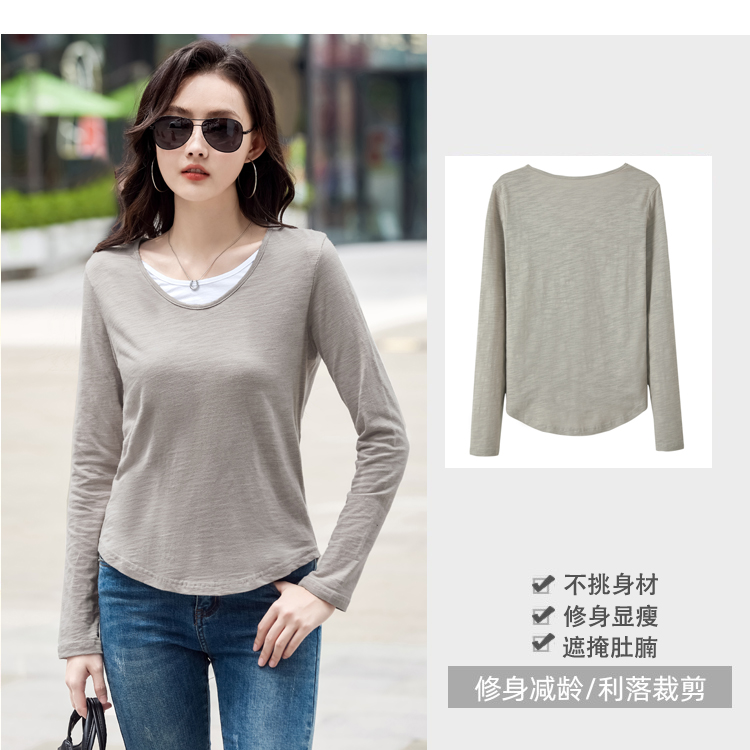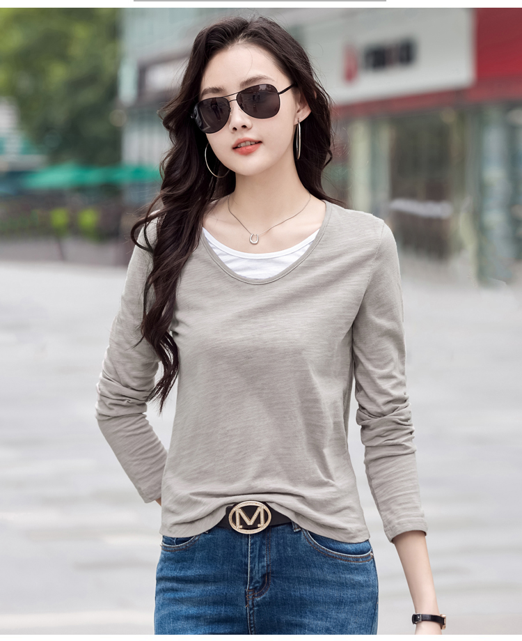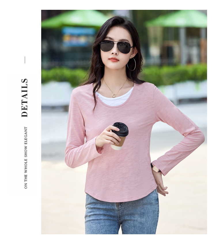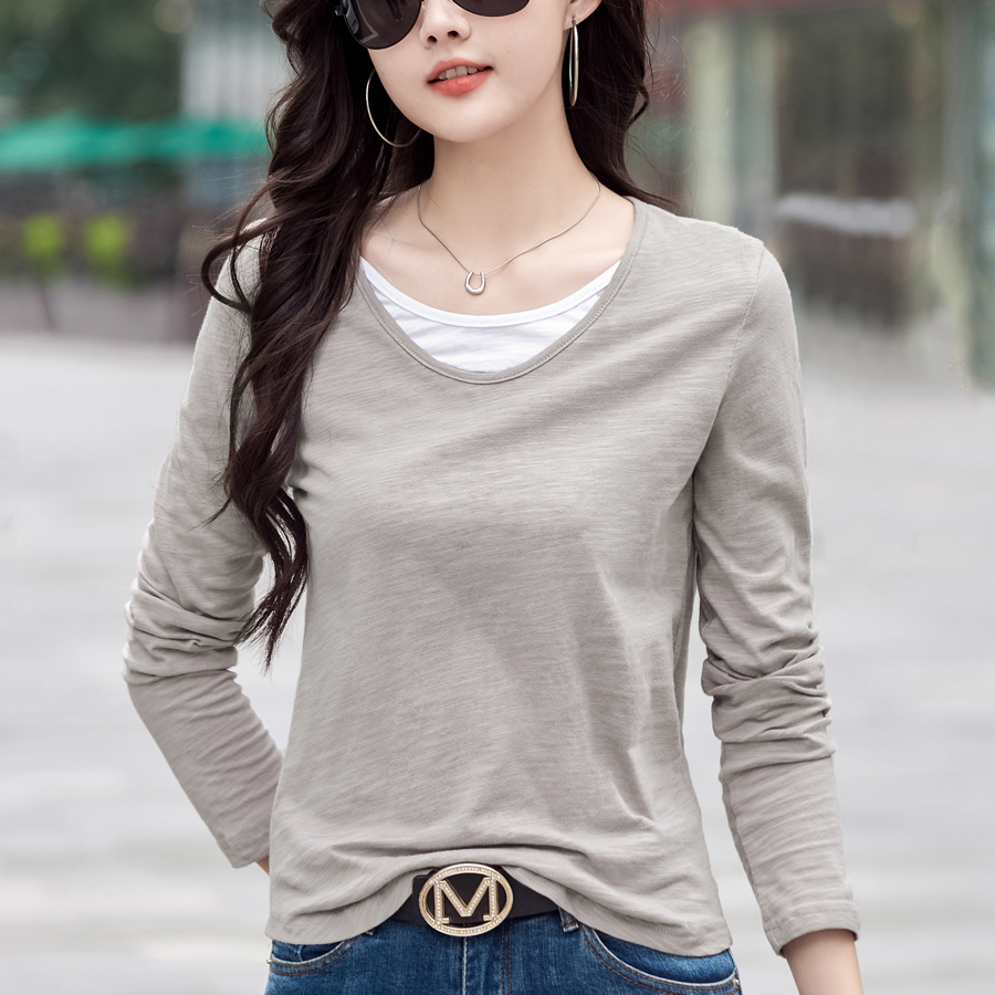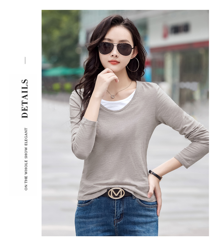 MY17126# 大码洋气显瘦宽松V领假两件长袖T恤新款纯棉宽松上衣打底衫女裝貨源服裝批發