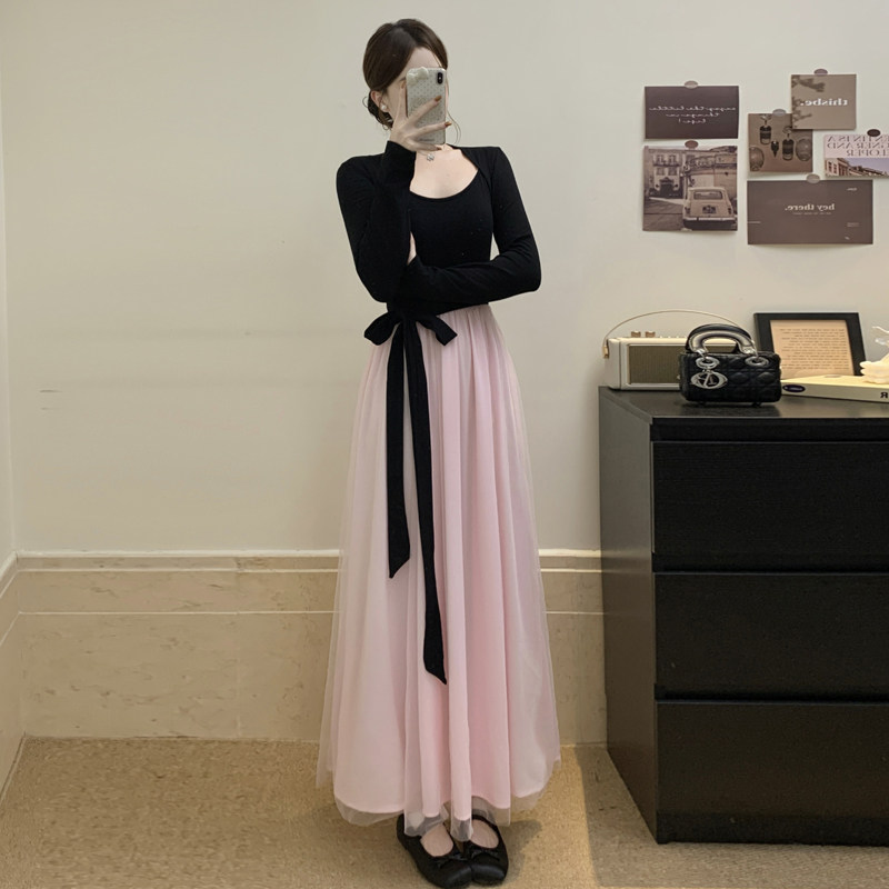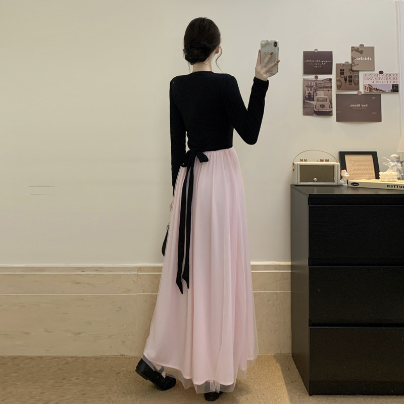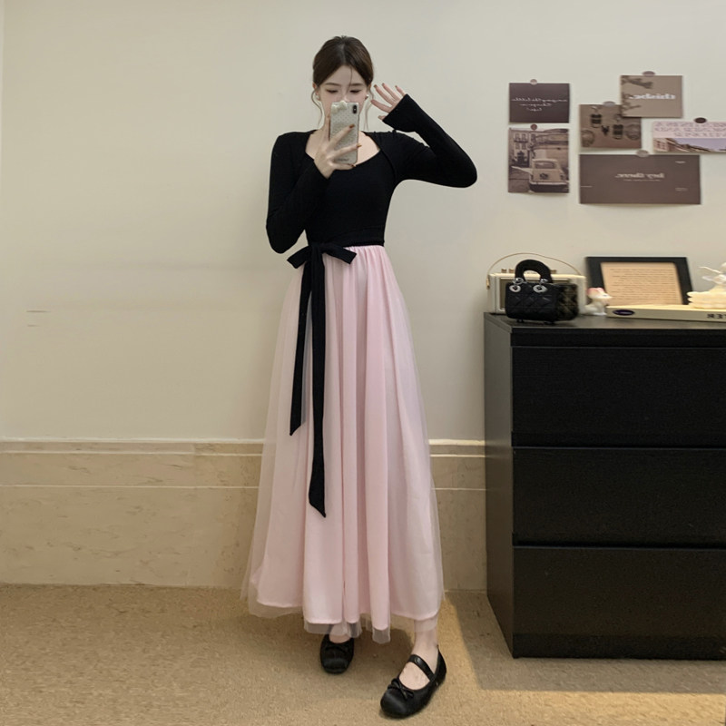 MY17150# 人棉磨毛+超密涤网+内里一高级感黑色连衣裙富家千金感长裙女裝貨源服裝批發