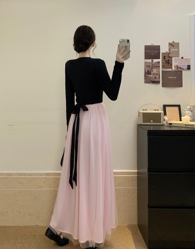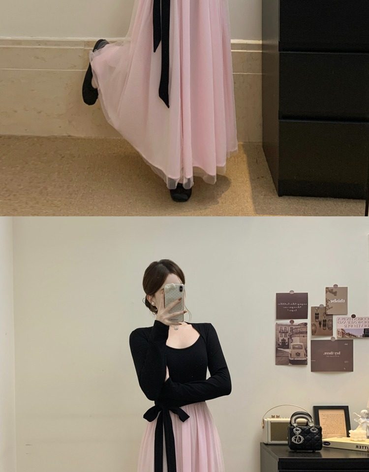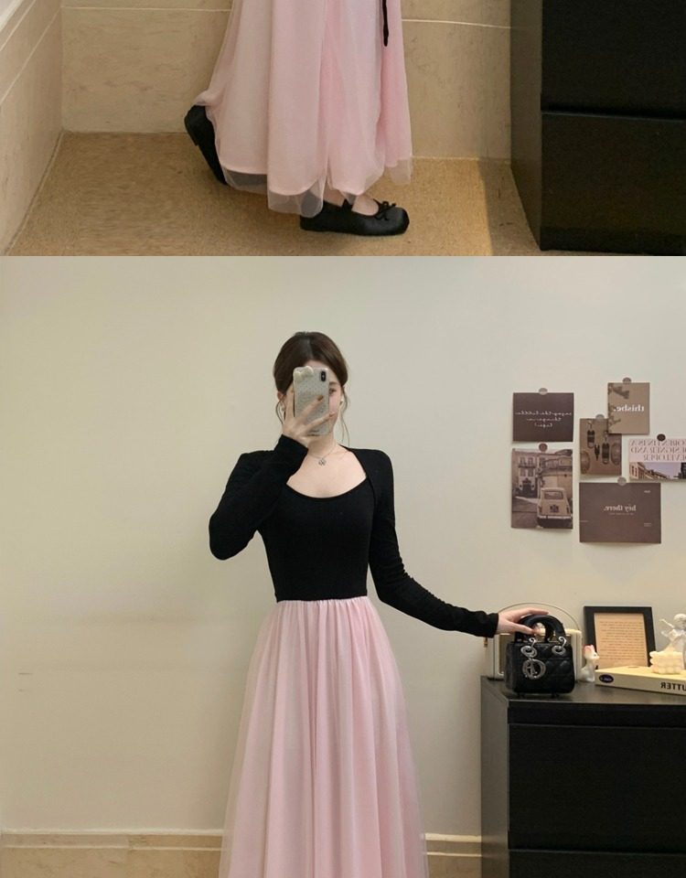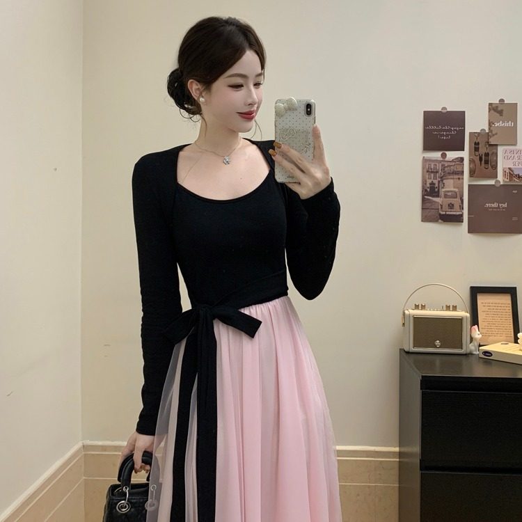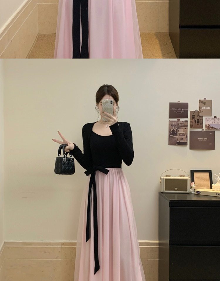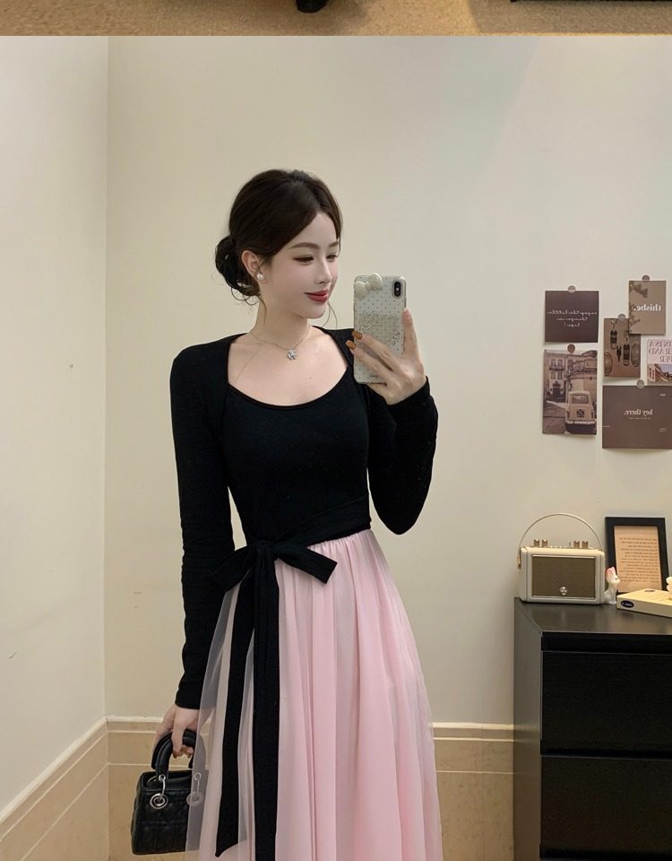 黑拼粉连衣裙