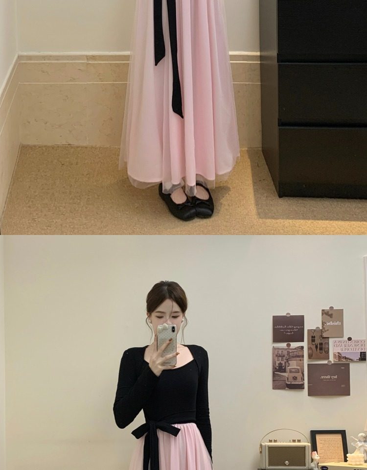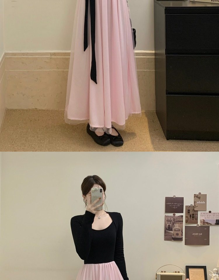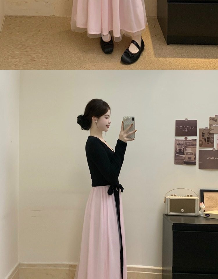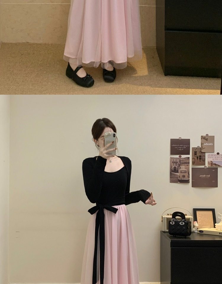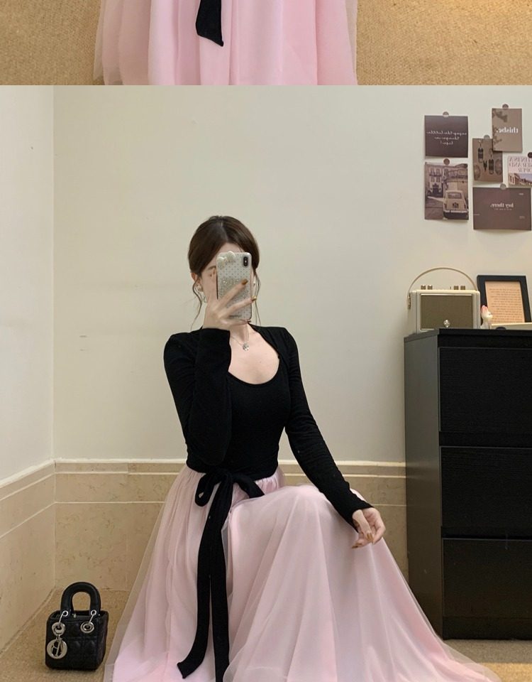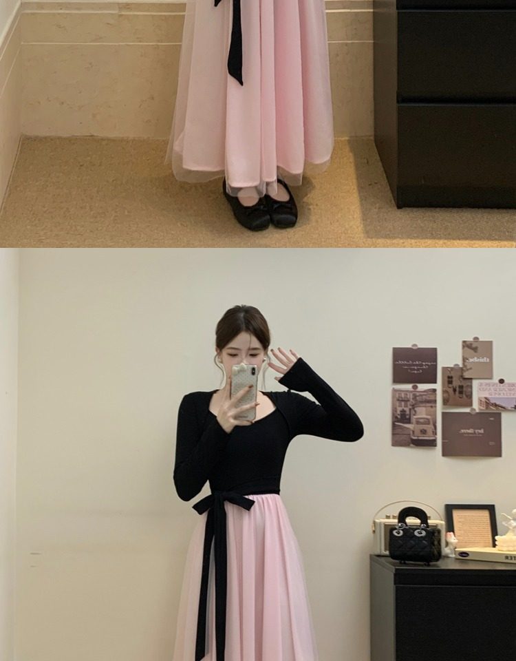 黑拼粉连衣裙