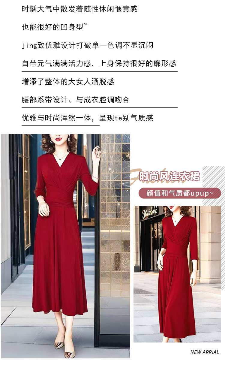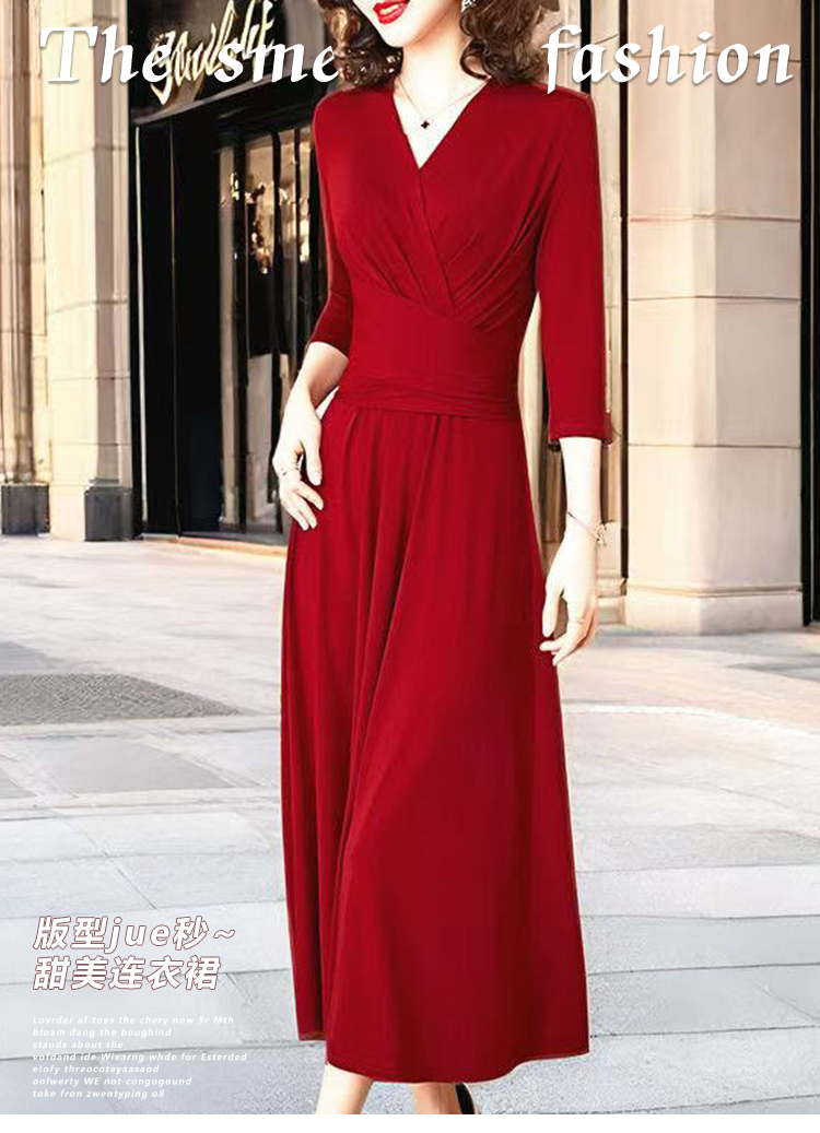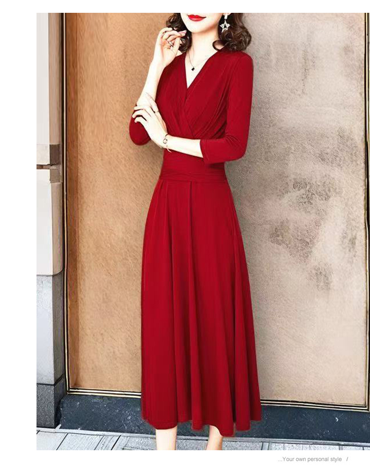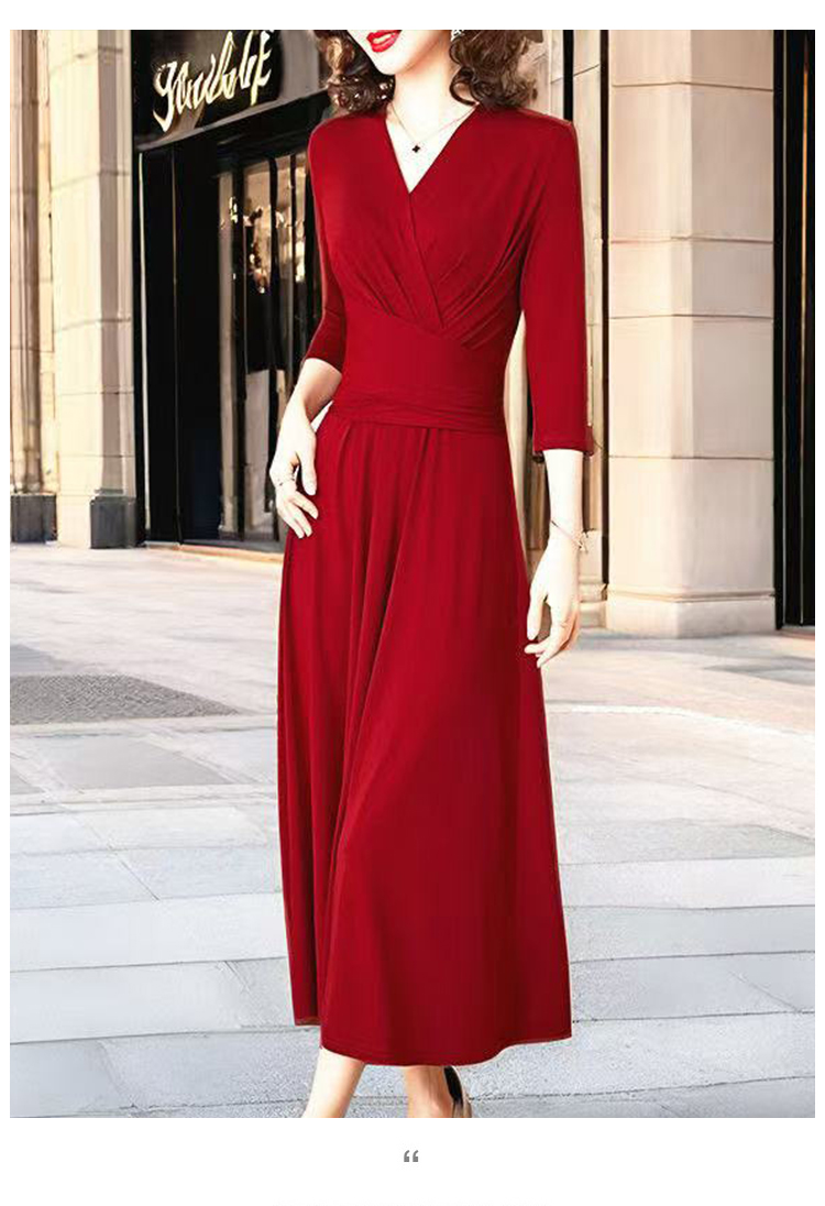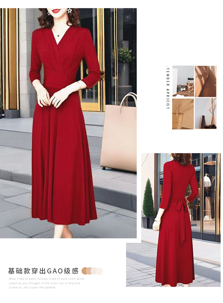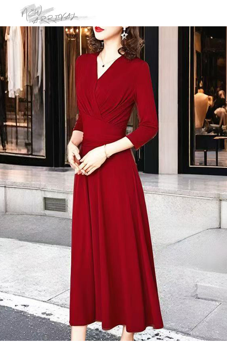 MY17155# 新款优雅V领气质显瘦红色连衣裙宴会礼服过膝a字女裝貨源服裝批發