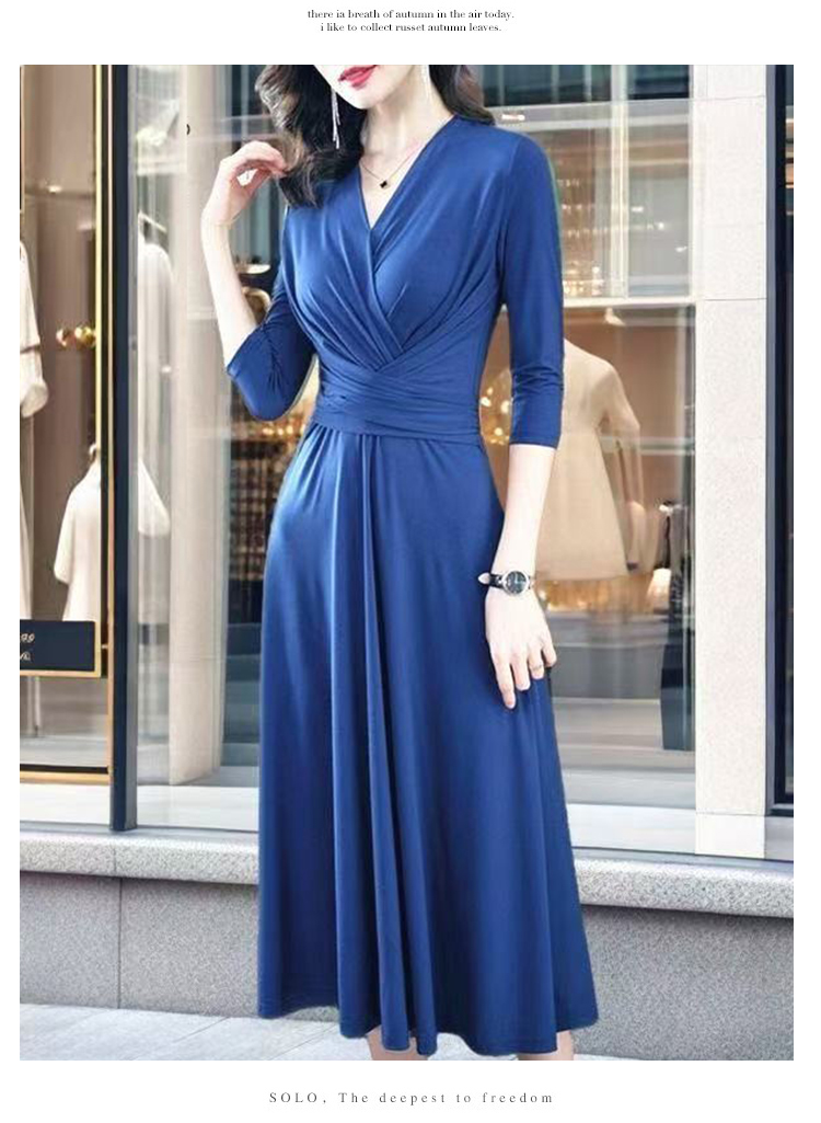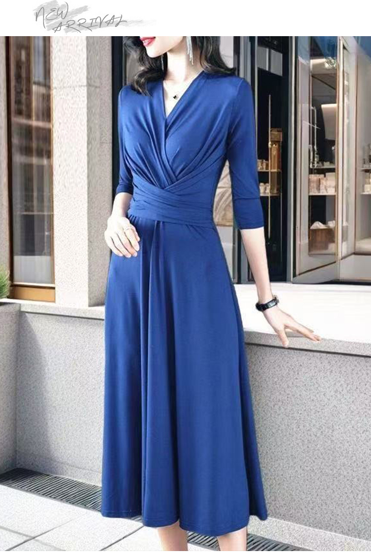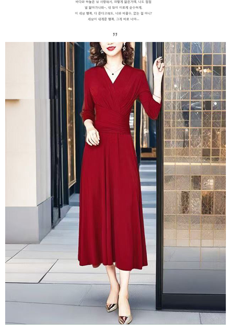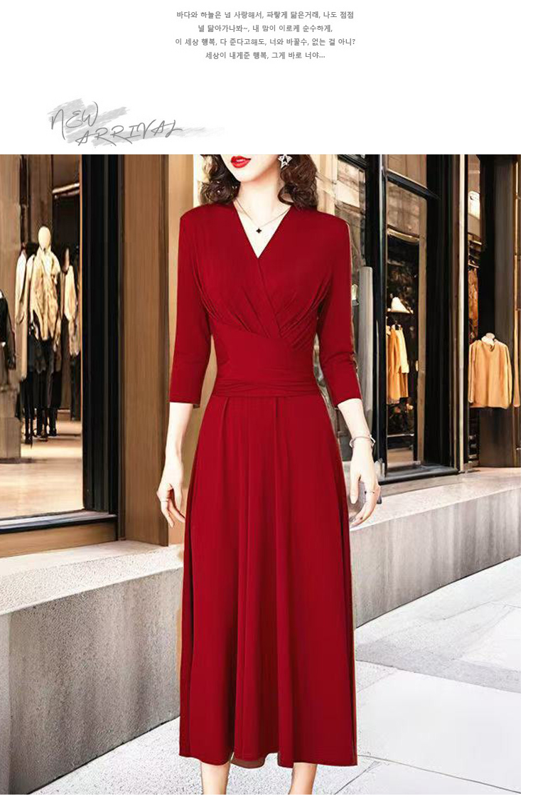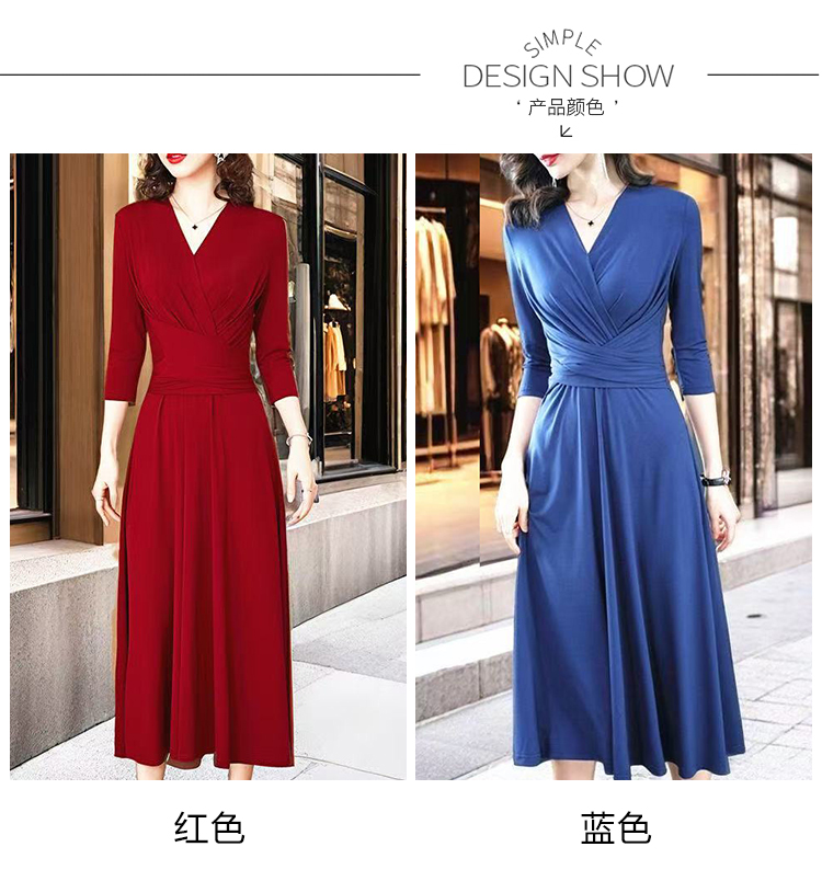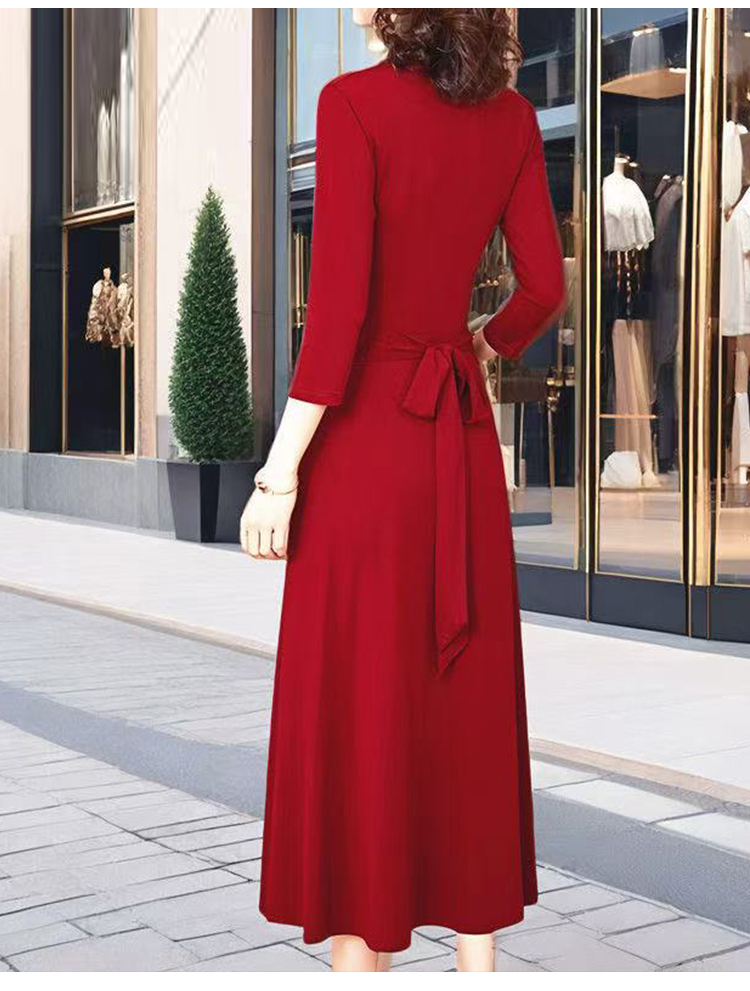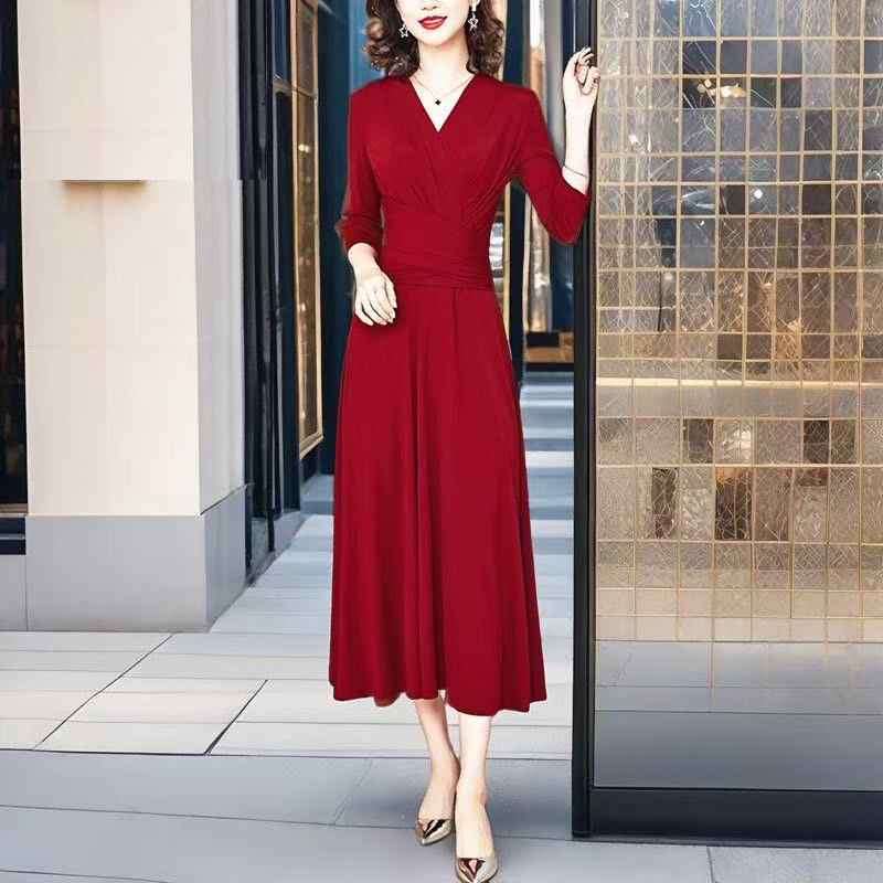 MY17155# 新款优雅V领气质显瘦红色连衣裙宴会礼服过膝a字女裝貨源服裝批發