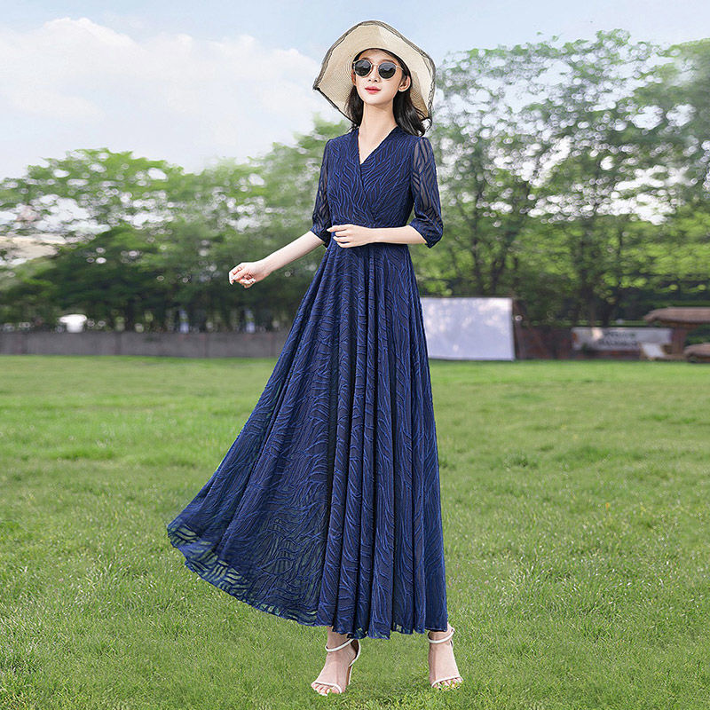 MY17165# 春夏条纹大摆连衣裙收腰显瘦旅游度假长裙雪纺裙沙滩裙女裝貨源服裝批發