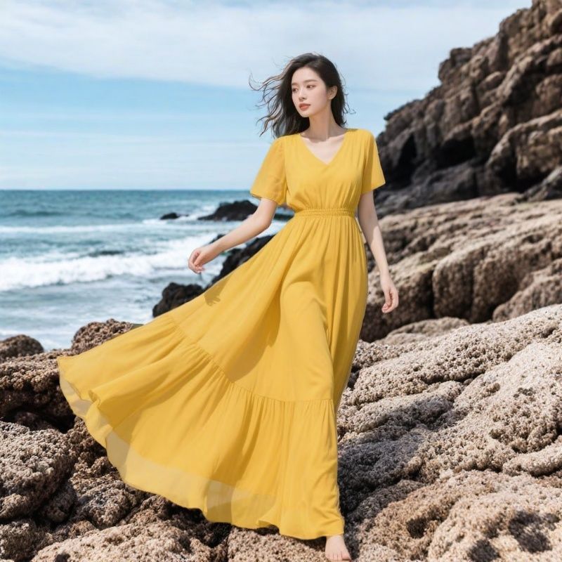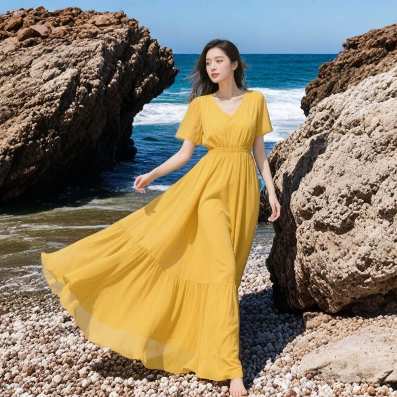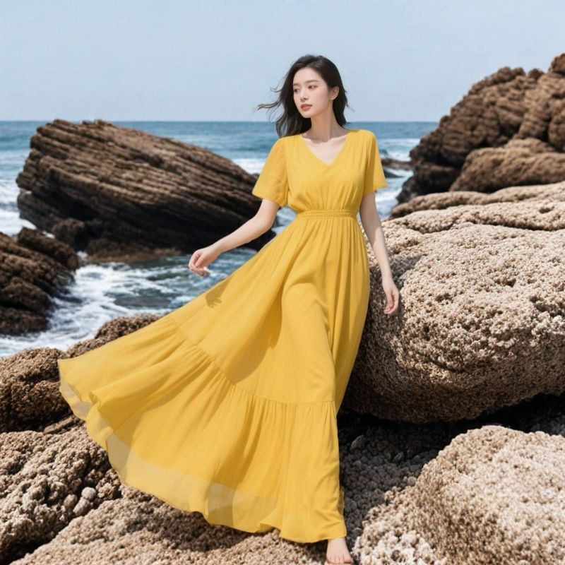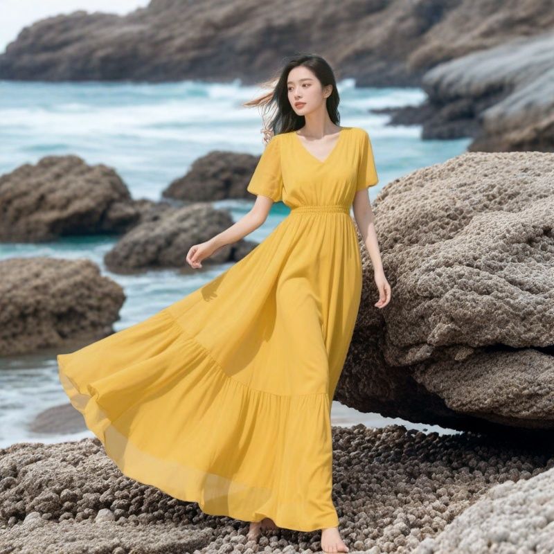 MY17166# 连衣裙长裙显瘦新款黄色雪纺海边夏季度假长款沙滩裙子女裝貨源服裝批發