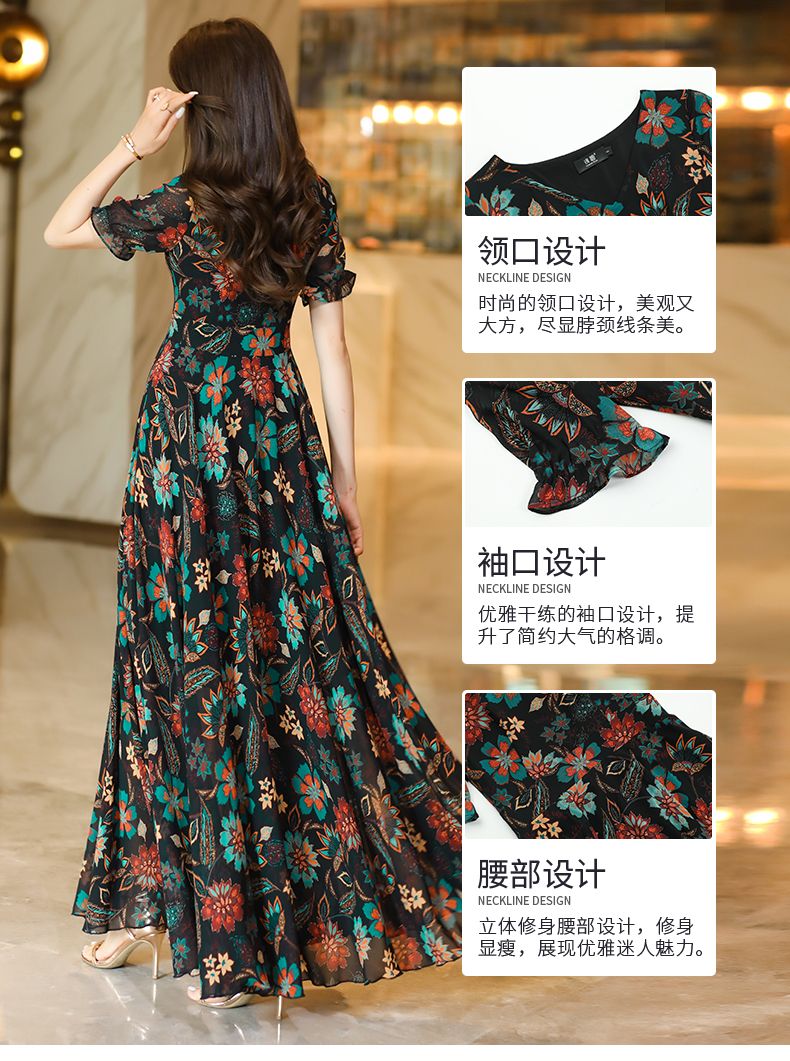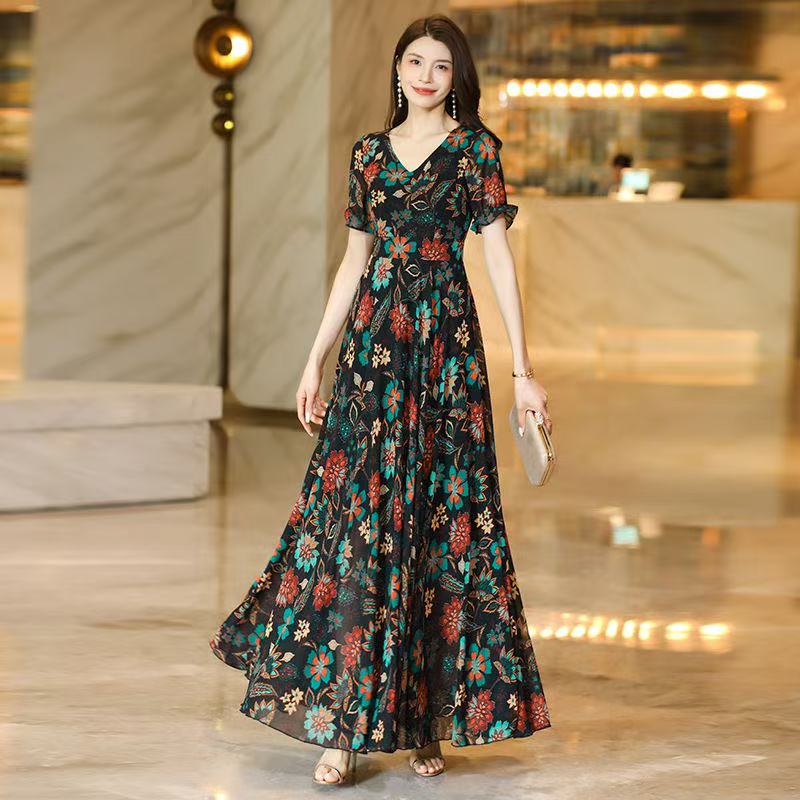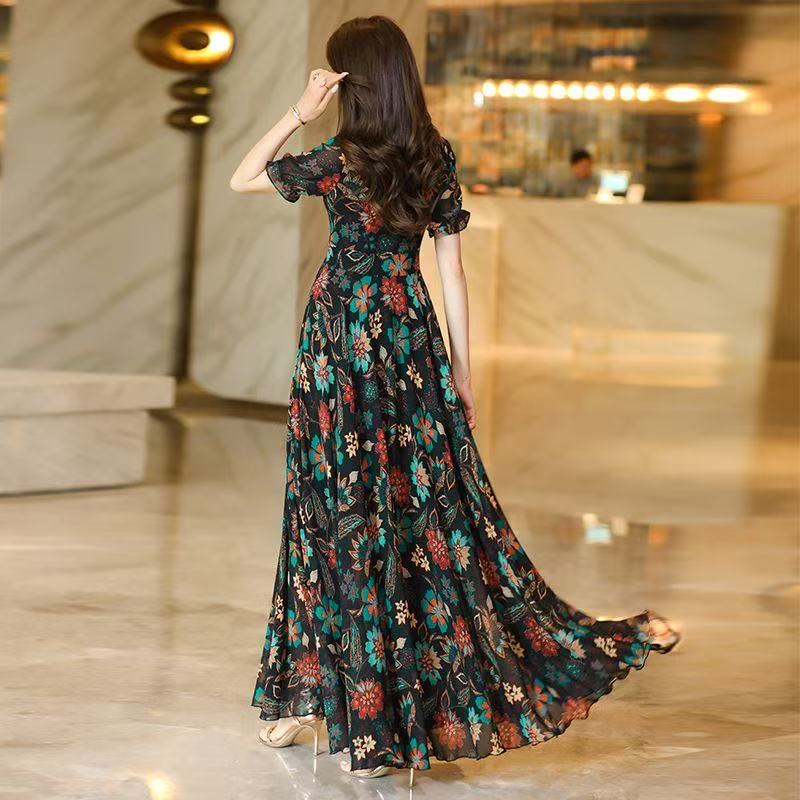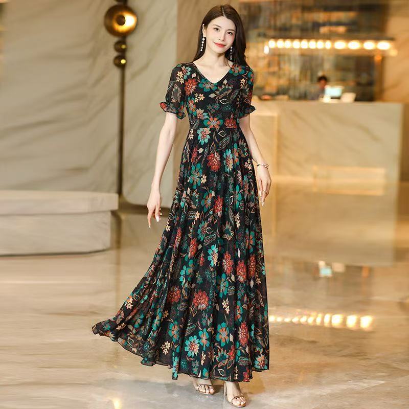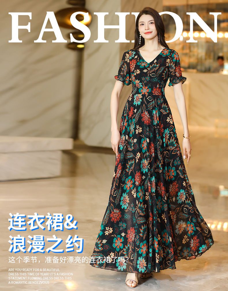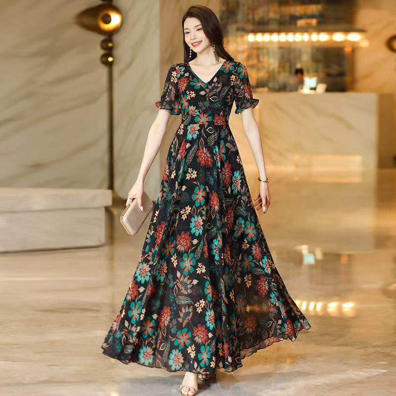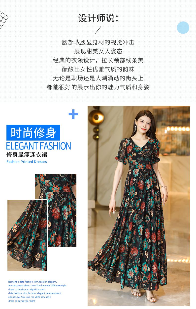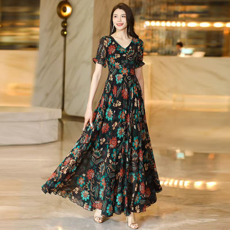 MY17168# 新款碎花雪纺连衣裙女装长裙夏季过膝收腰显瘦大码沙滩裙长款气质女裝貨源服裝批發