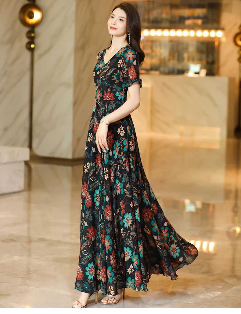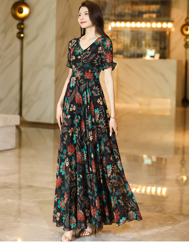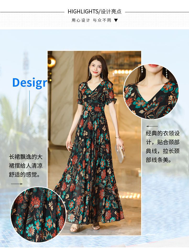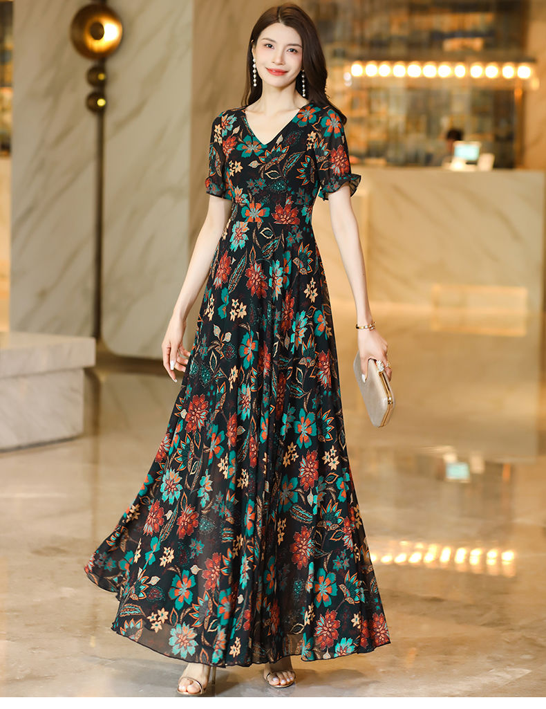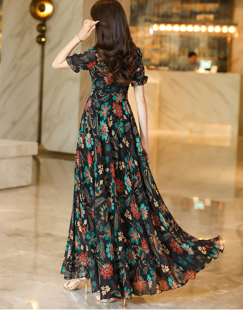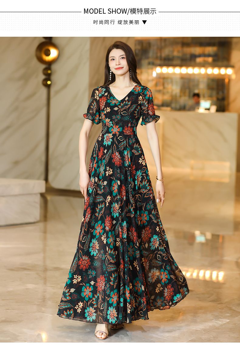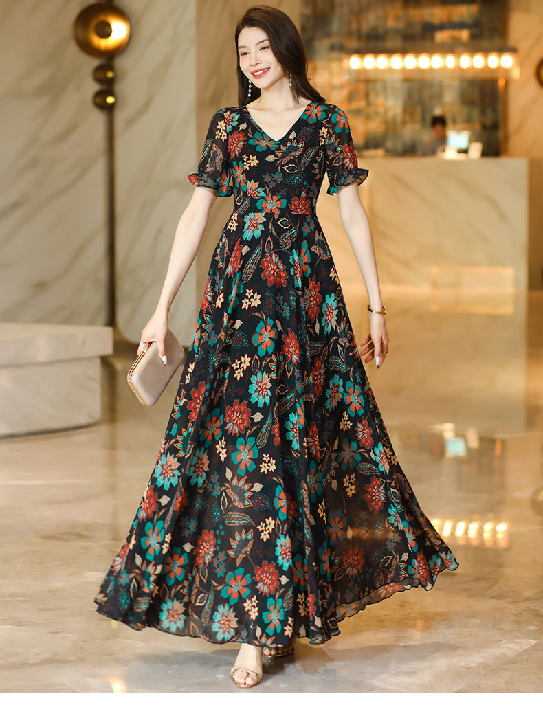 MY17168# 新款碎花雪纺连衣裙女装长裙夏季过膝收腰显瘦大码沙滩裙长款气质女裝貨源服裝批發