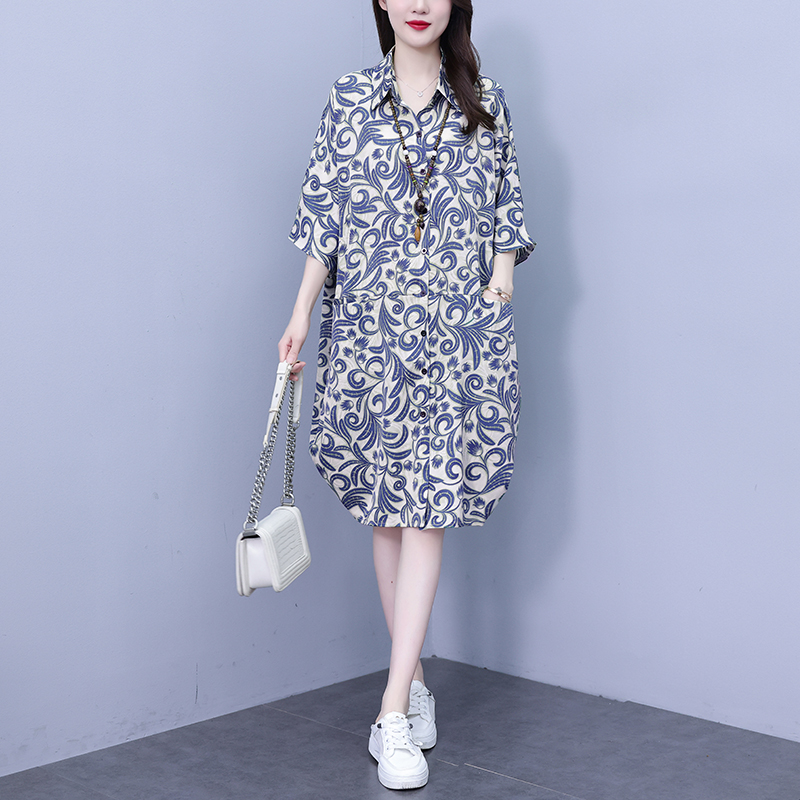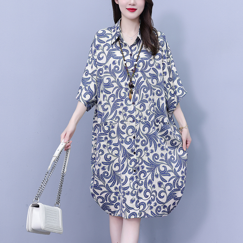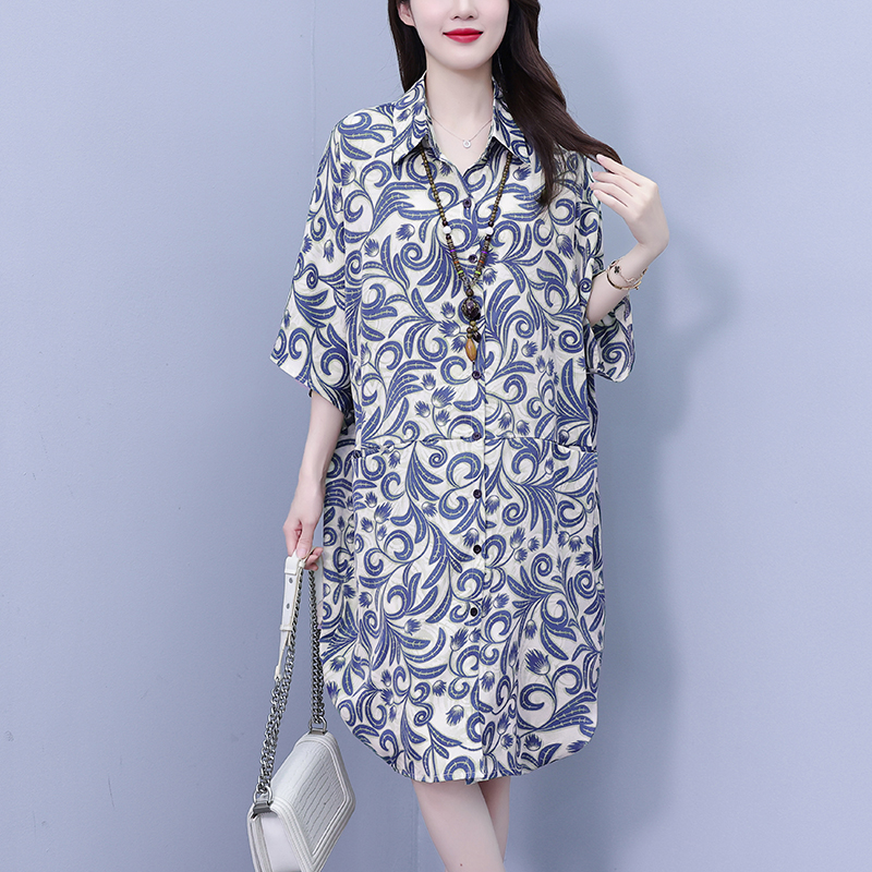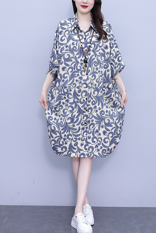 MY17175# 休闲宽松型大码女装连衣裙印花衬衣中长款连衣裙女裝貨源服裝批發