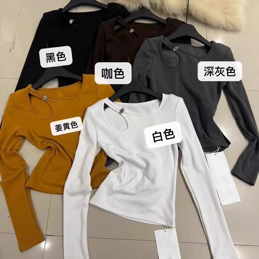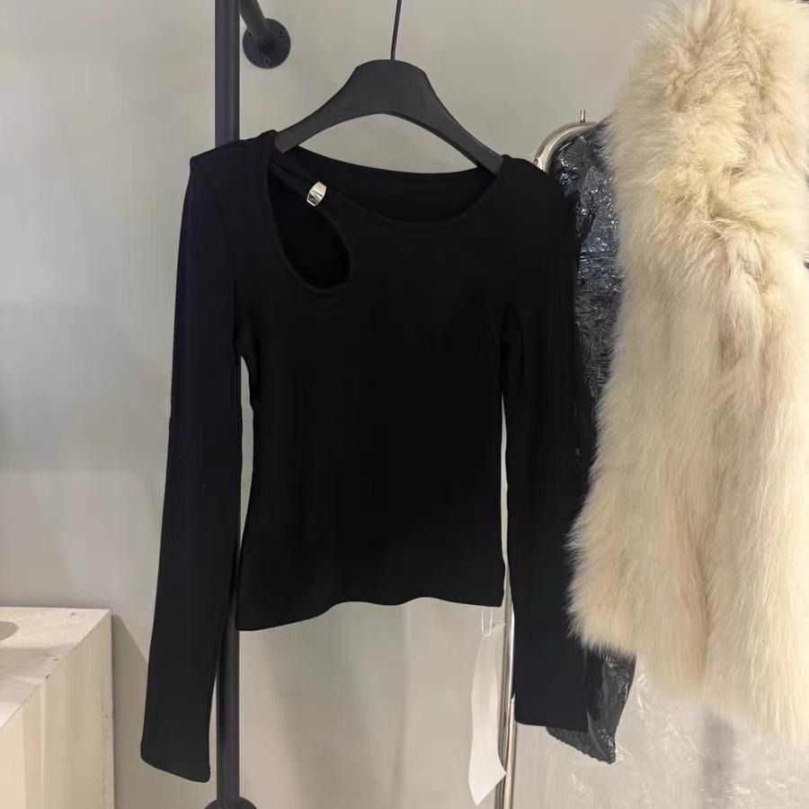 MY17237# 人棉罗纹 春秋新款设计感镂空打底衫修身显瘦性感女上衣t恤女裝貨源服裝批發