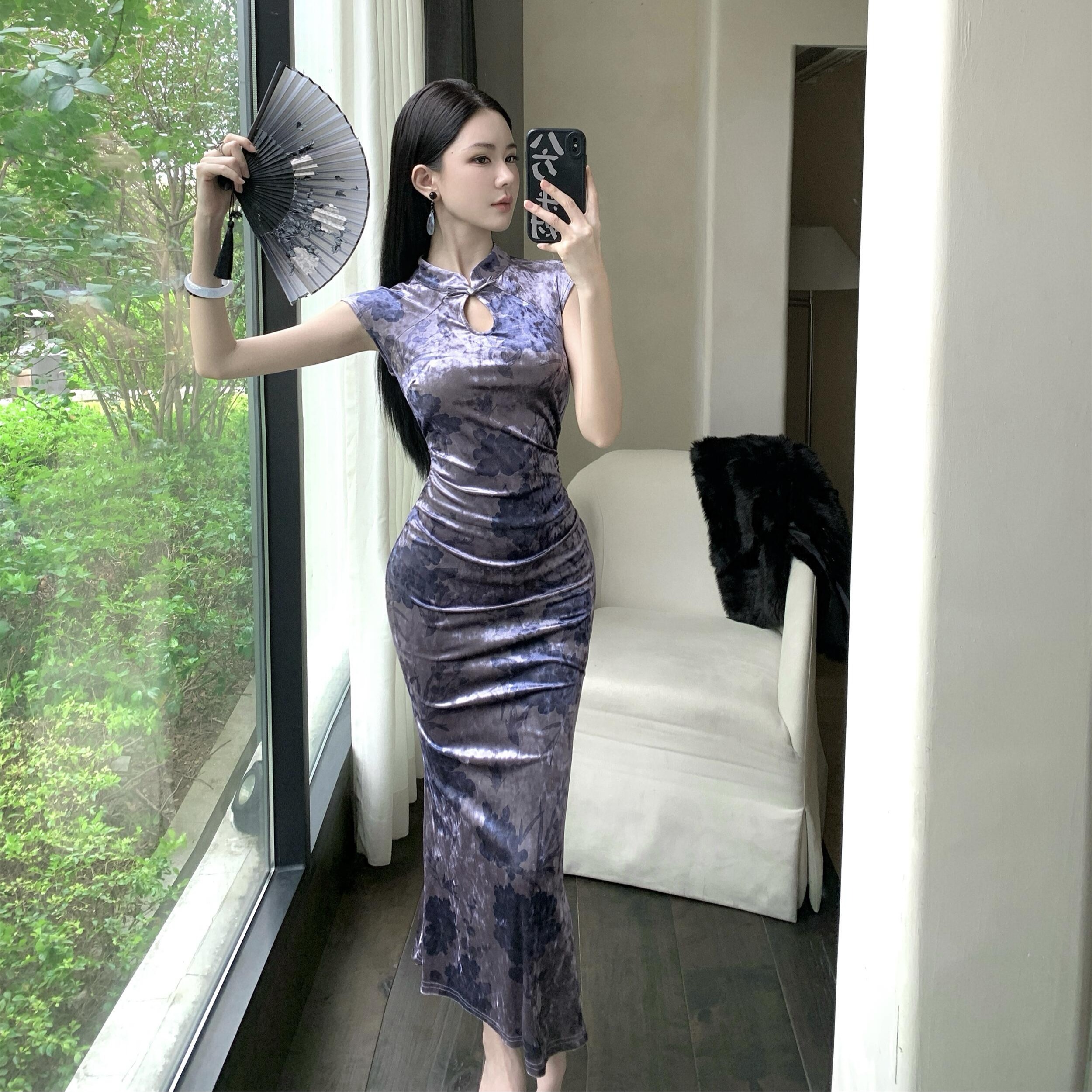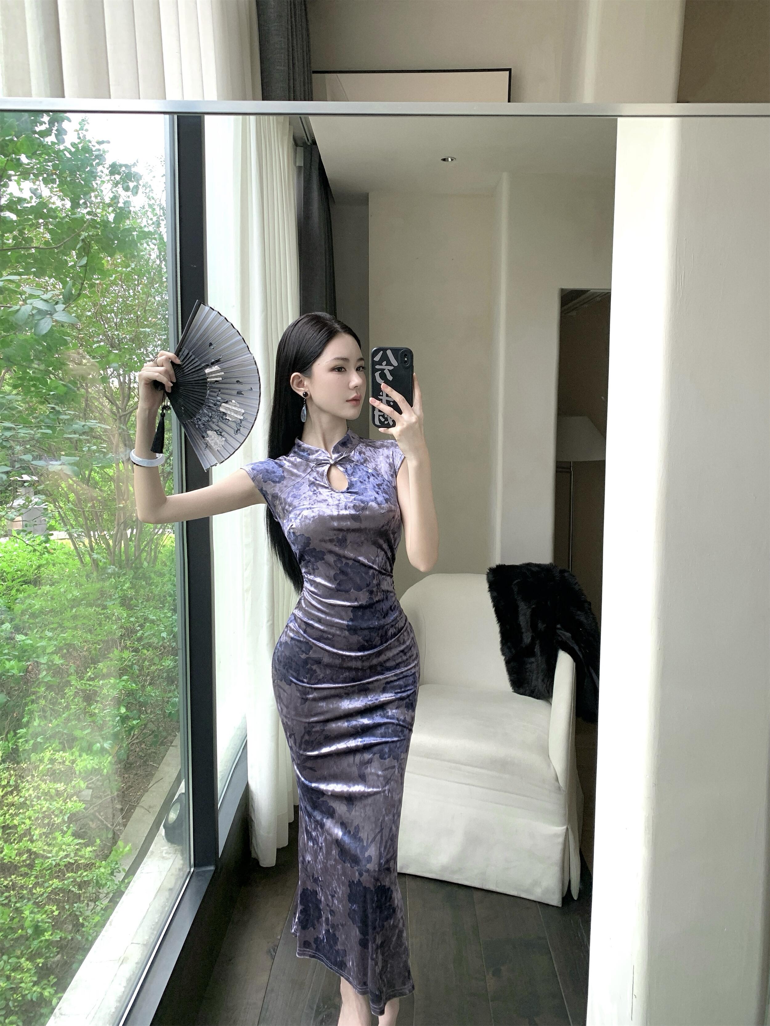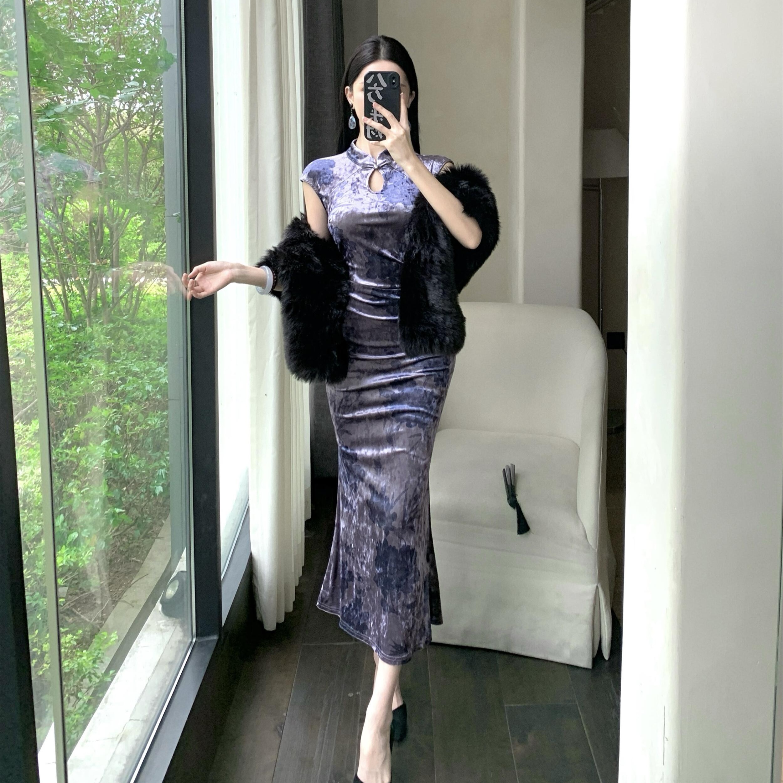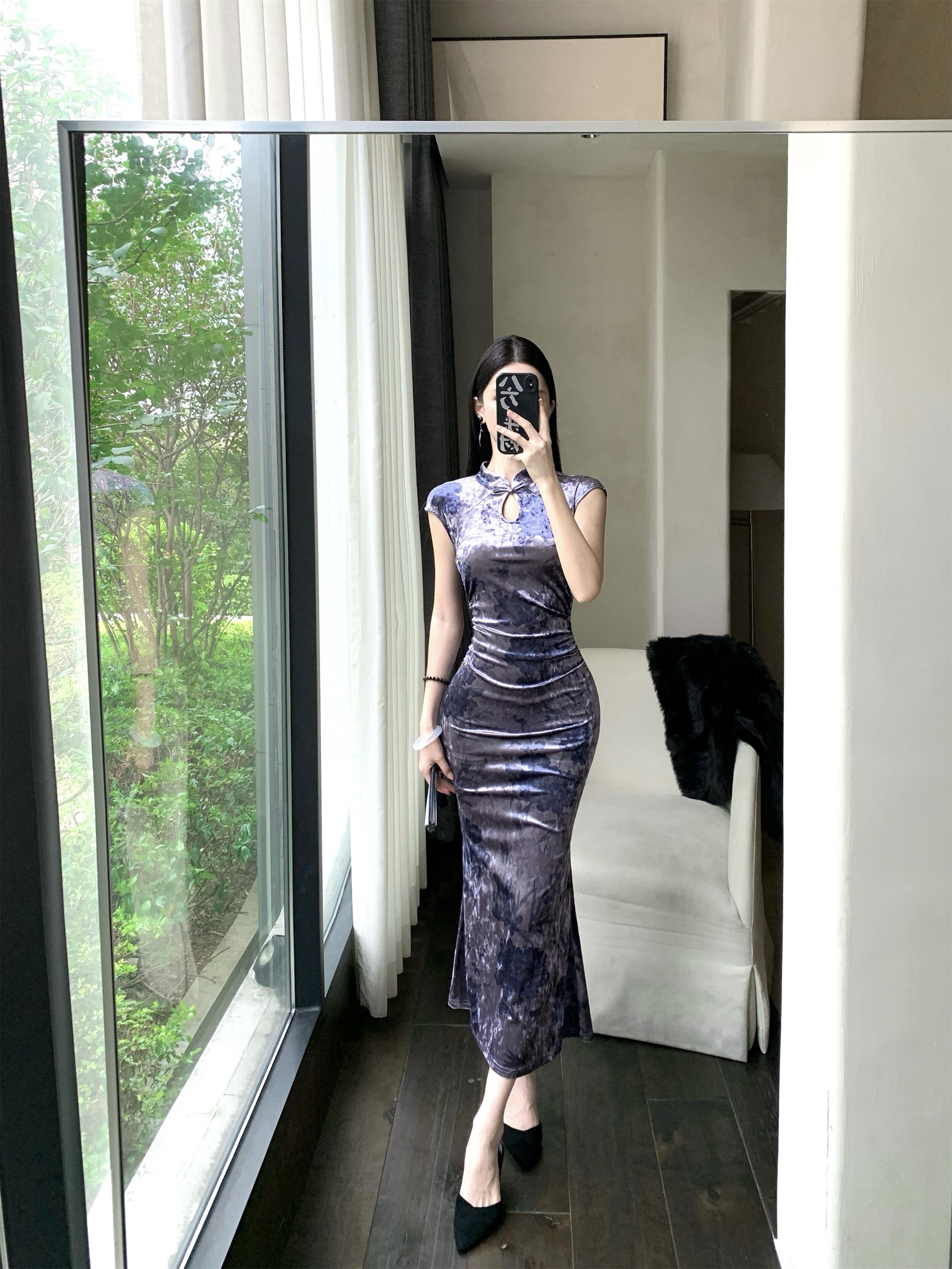 MY17253# 新中式改良旗袍丝绒印花显瘦百搭无袖包臀鱼尾长裙连衣裙女裝貨源服裝批發