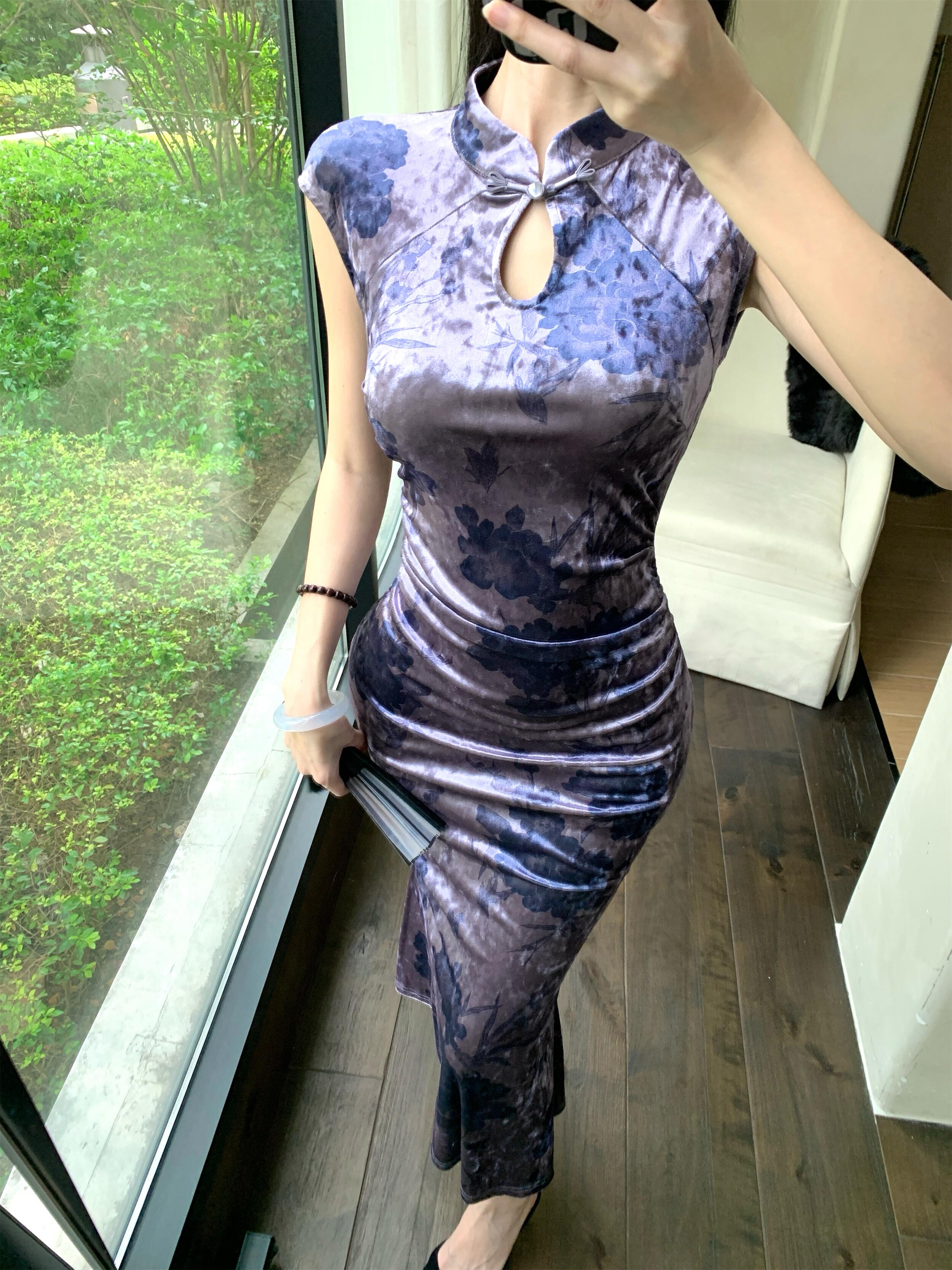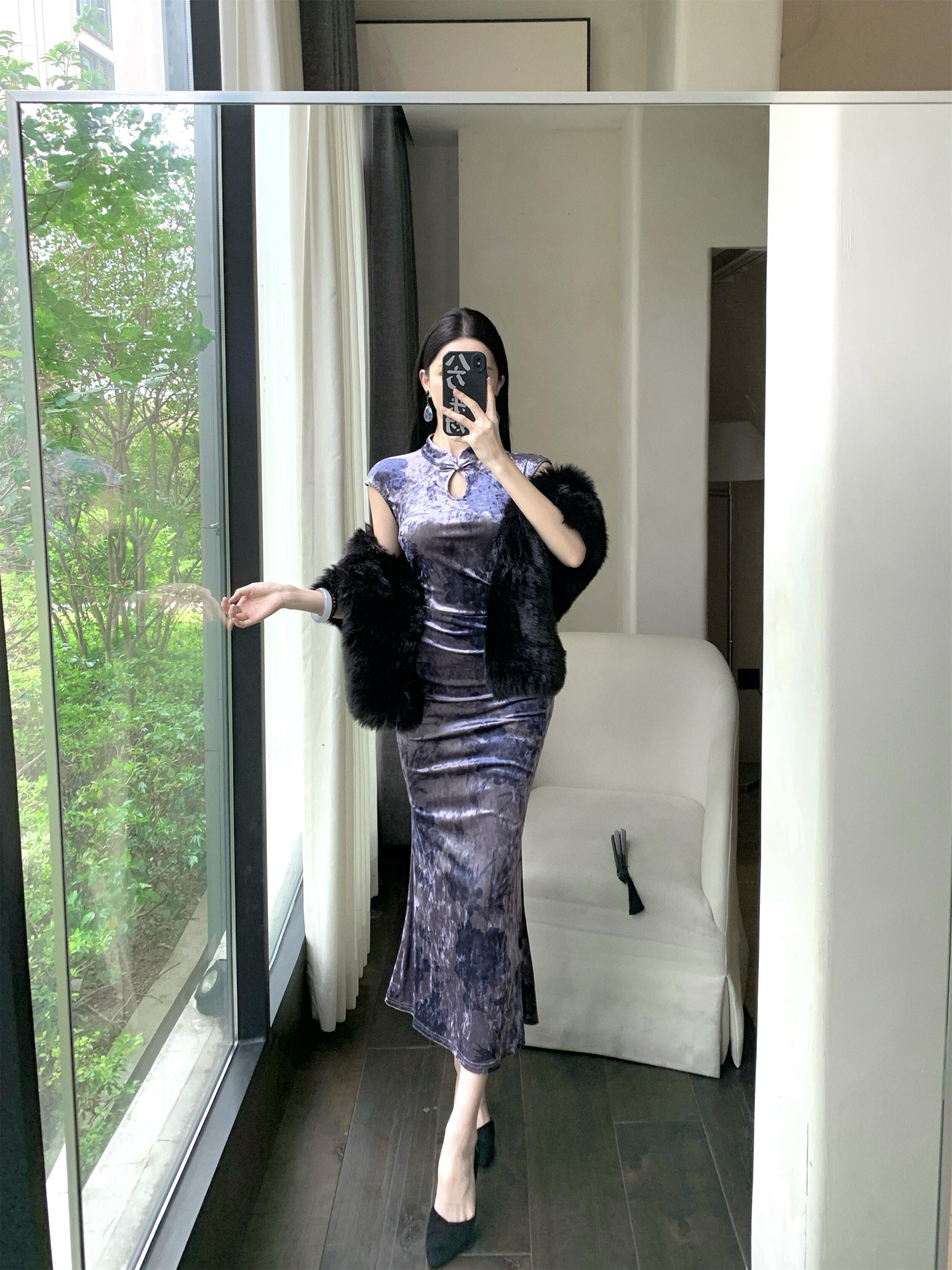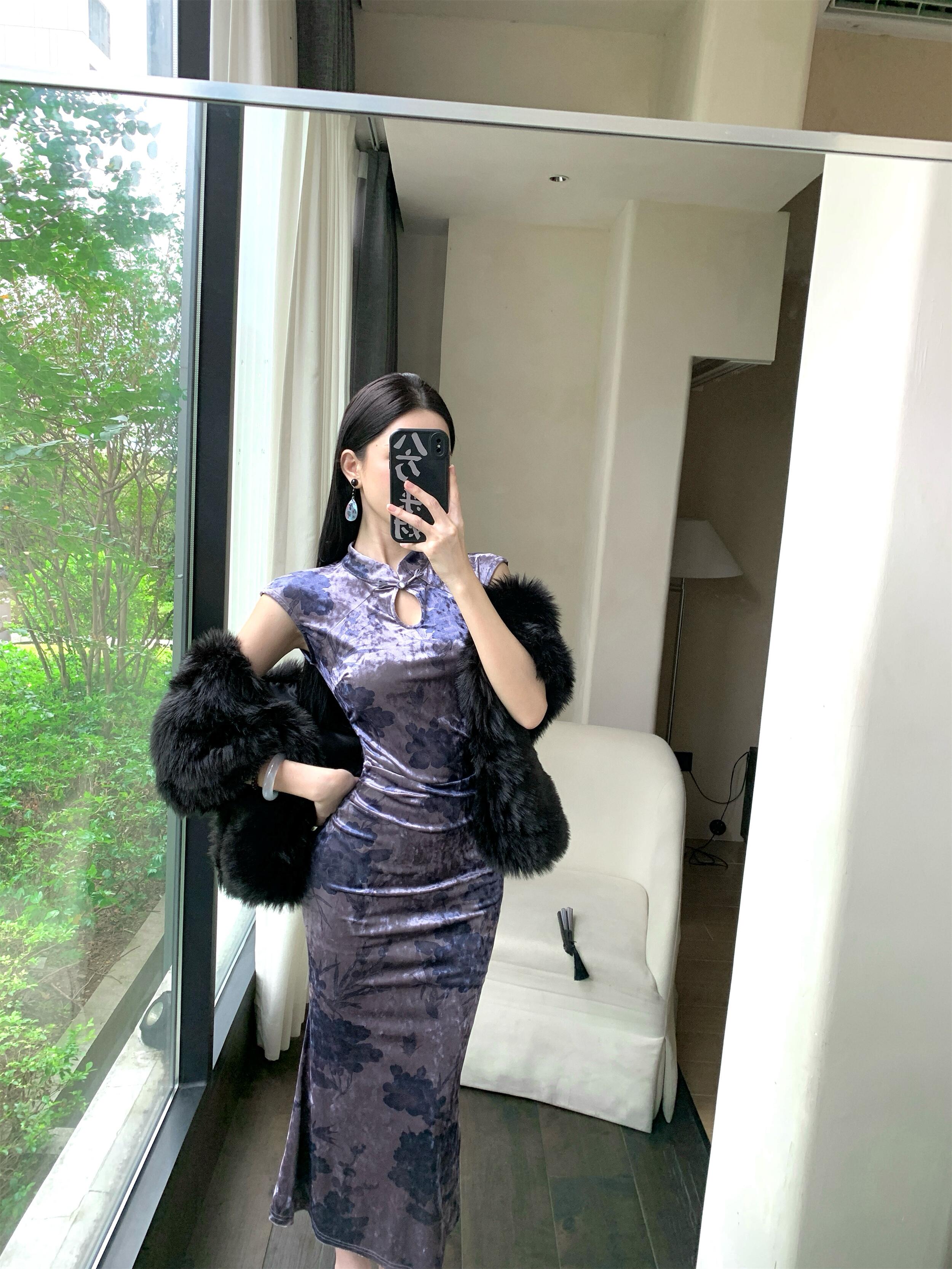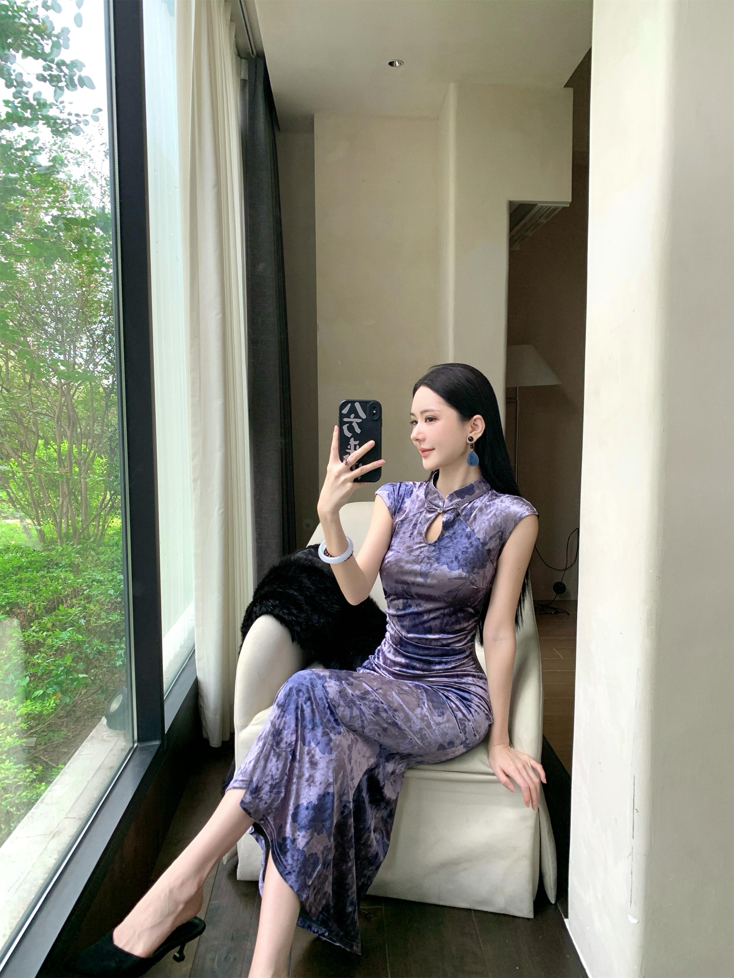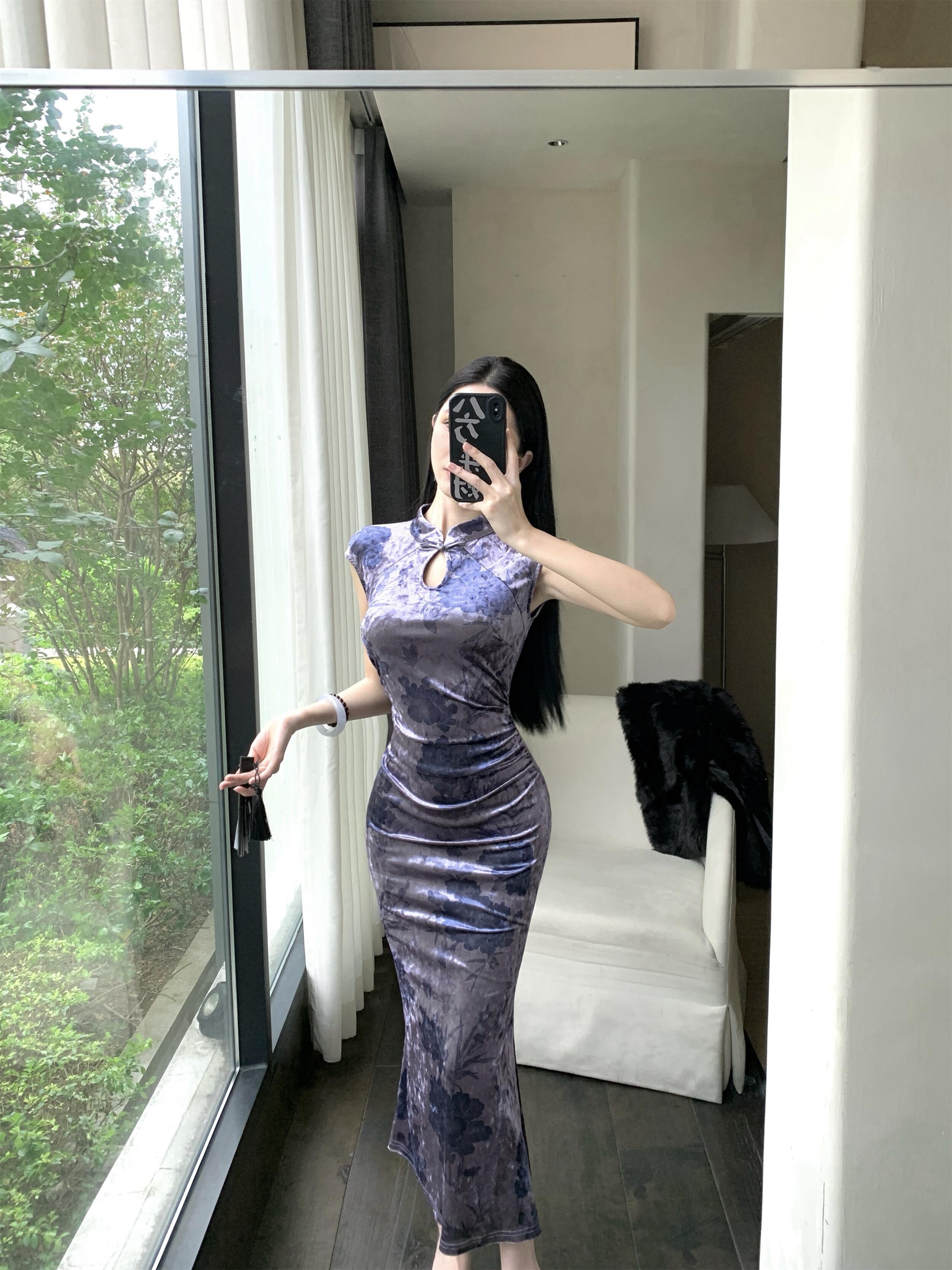 MY17253# 新中式改良旗袍丝绒印花显瘦百搭无袖包臀鱼尾长裙连衣裙女裝貨源服裝批發