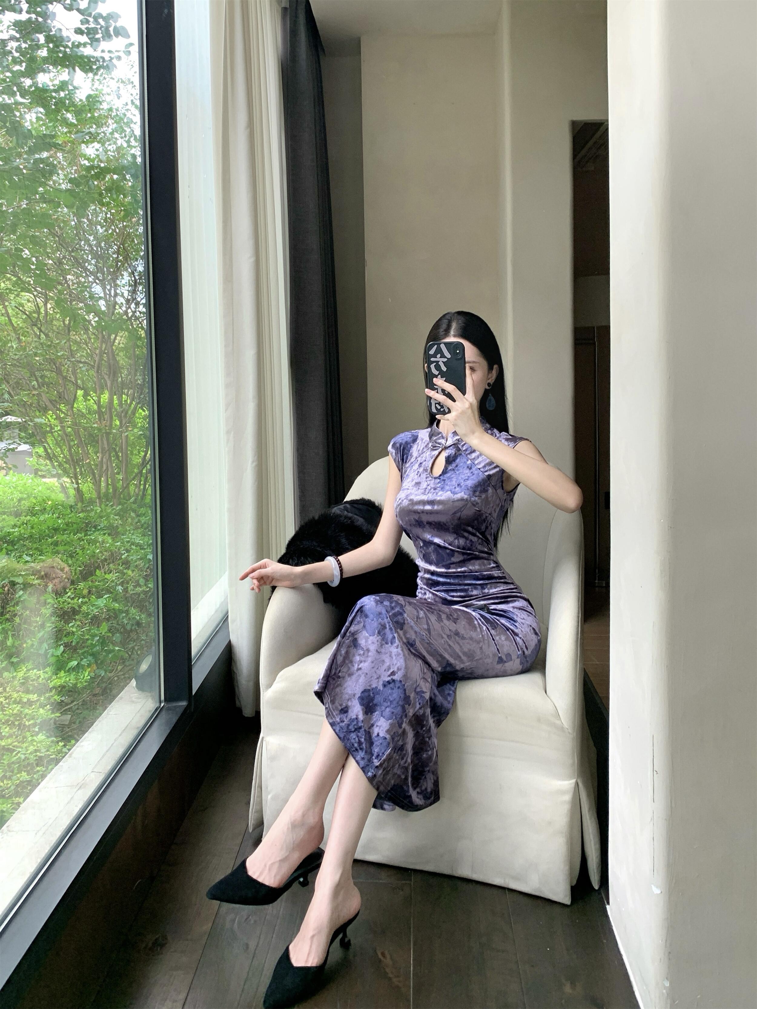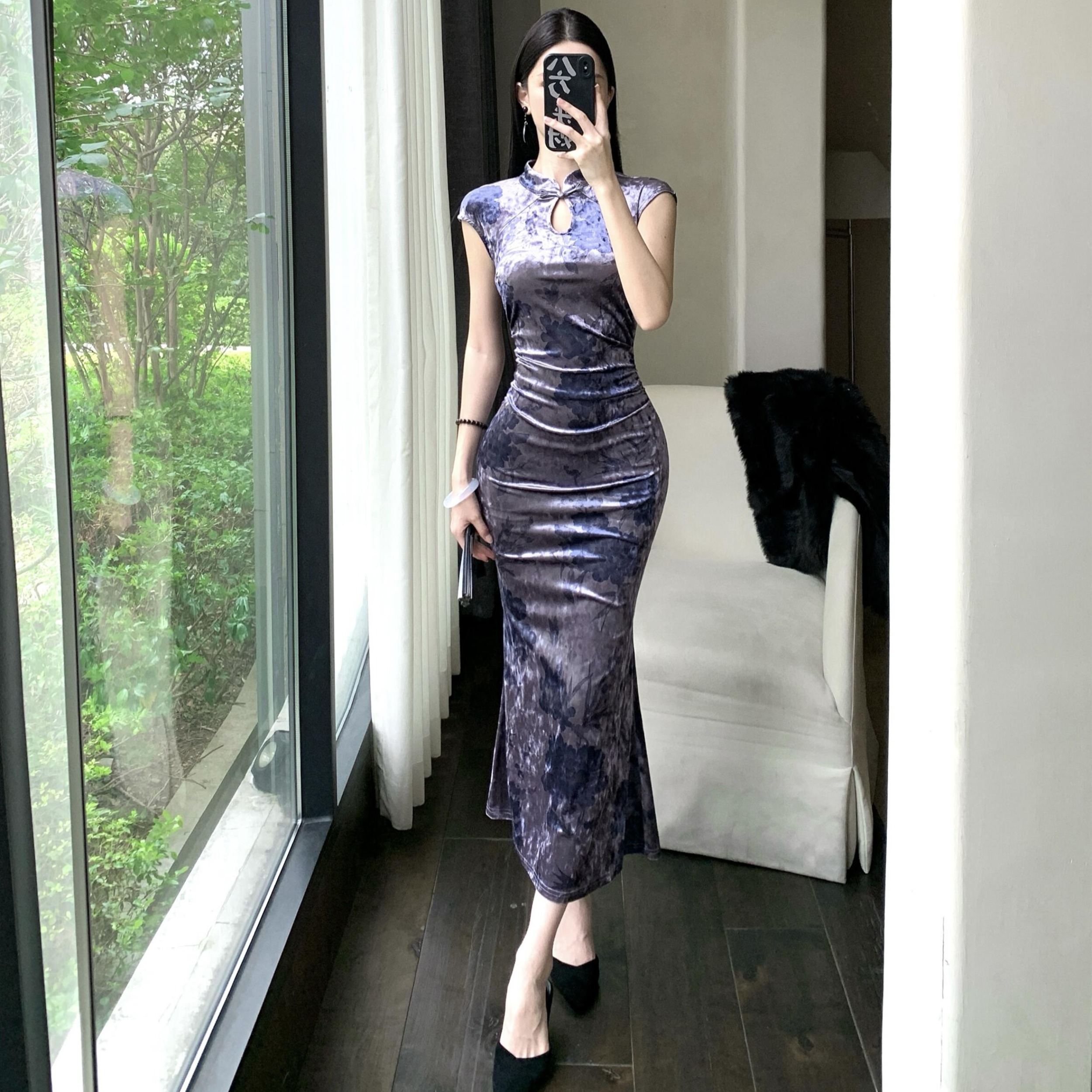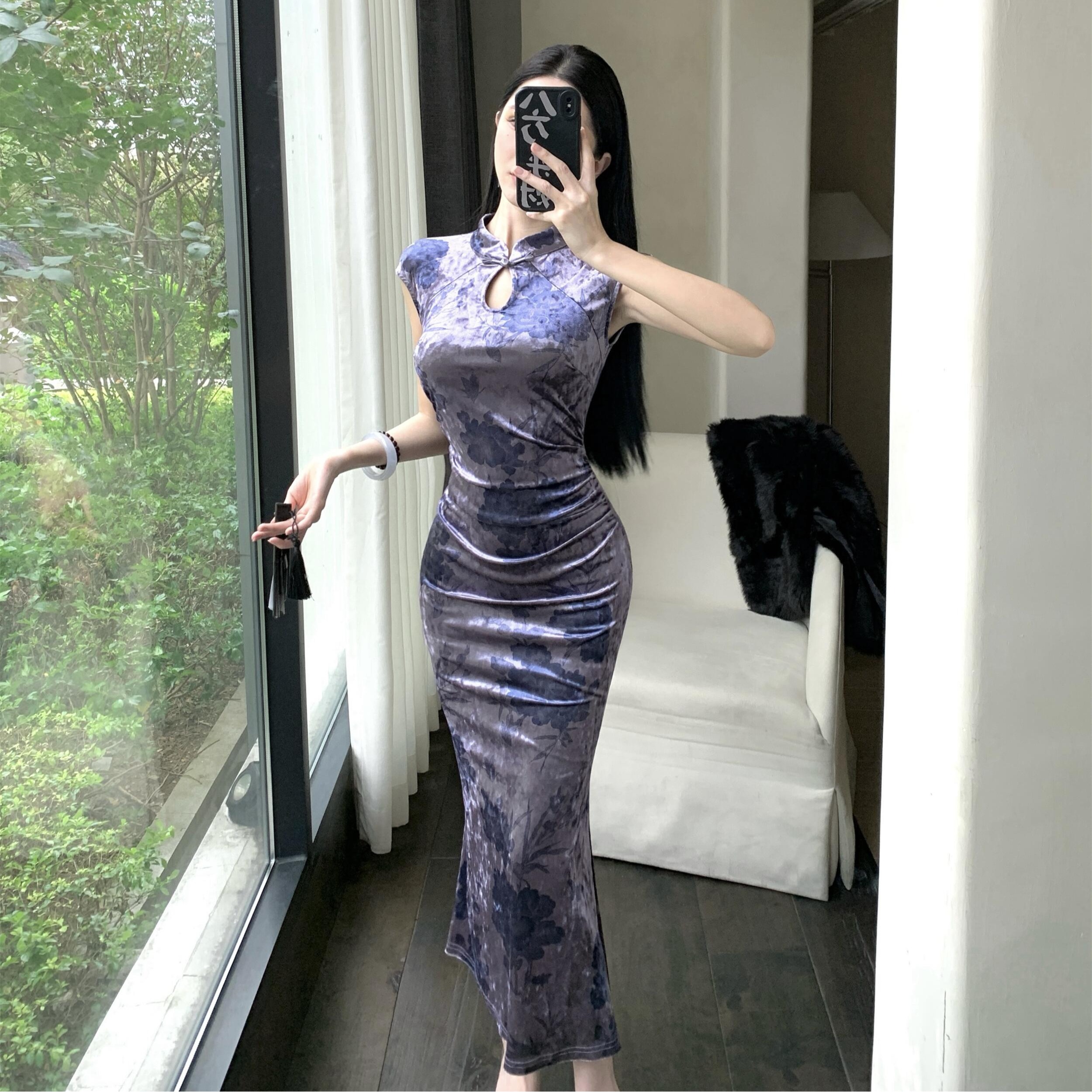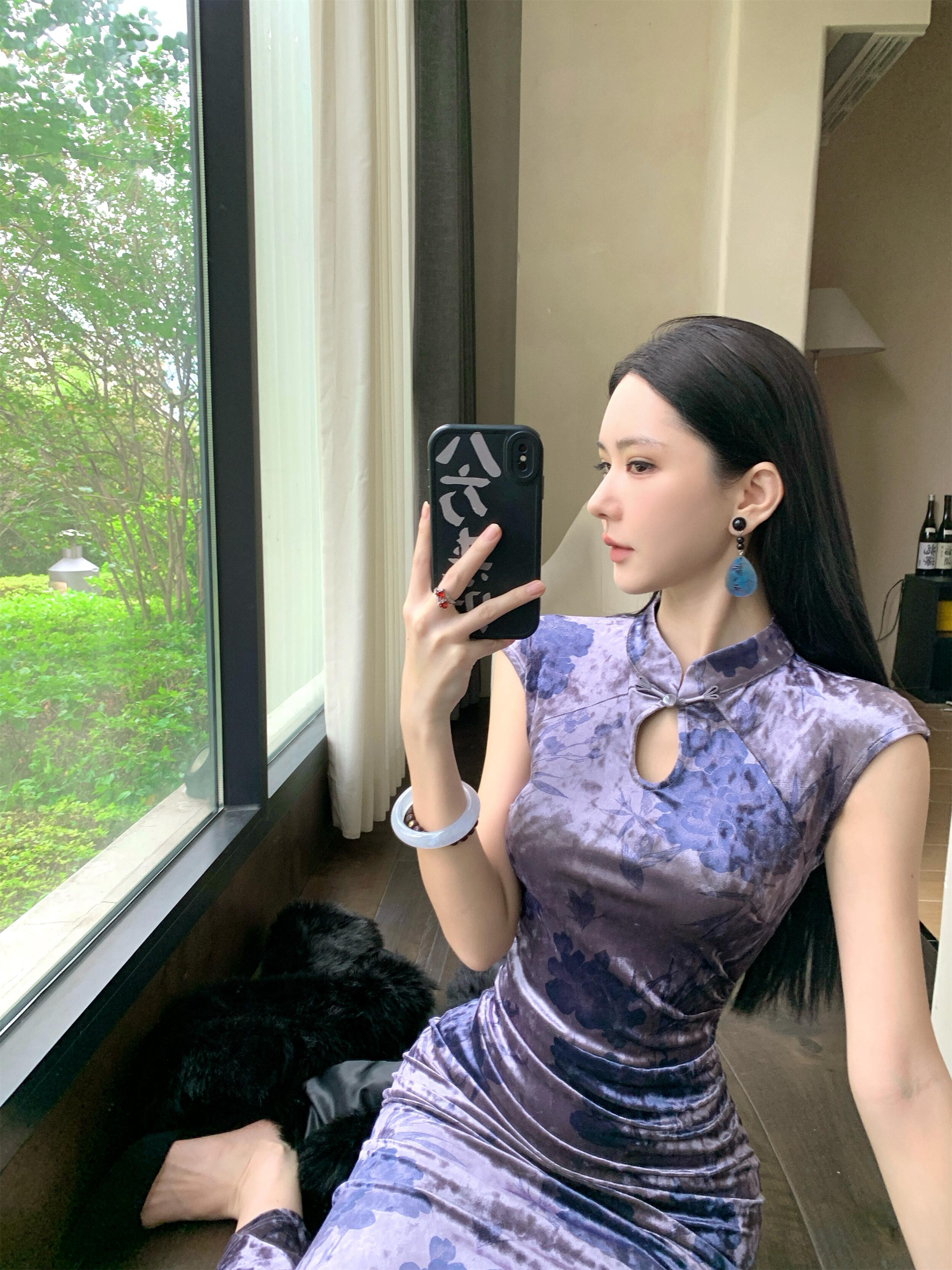 MY17253# 新中式改良旗袍丝绒印花显瘦百搭无袖包臀鱼尾长裙连衣裙女裝貨源服裝批發