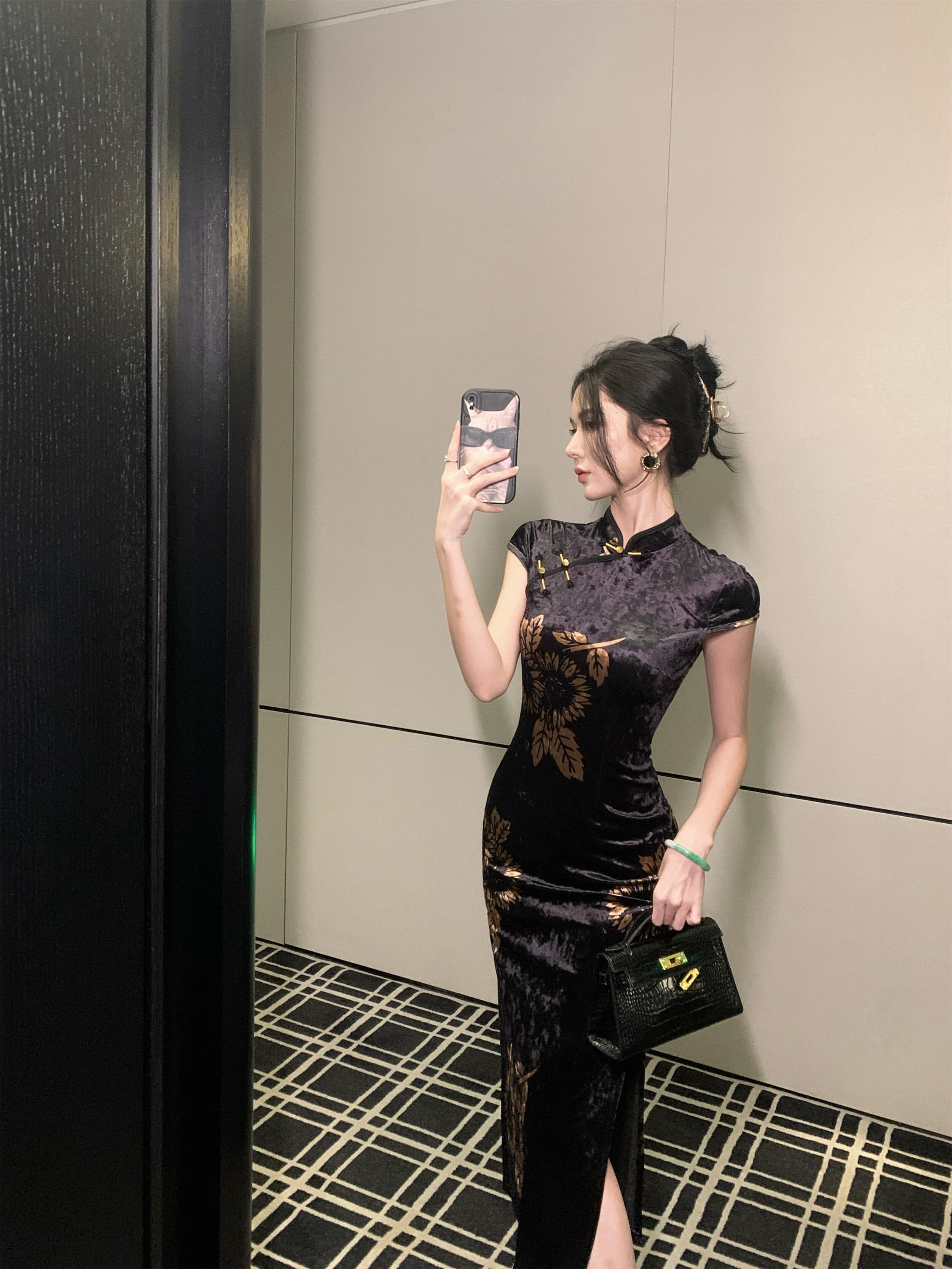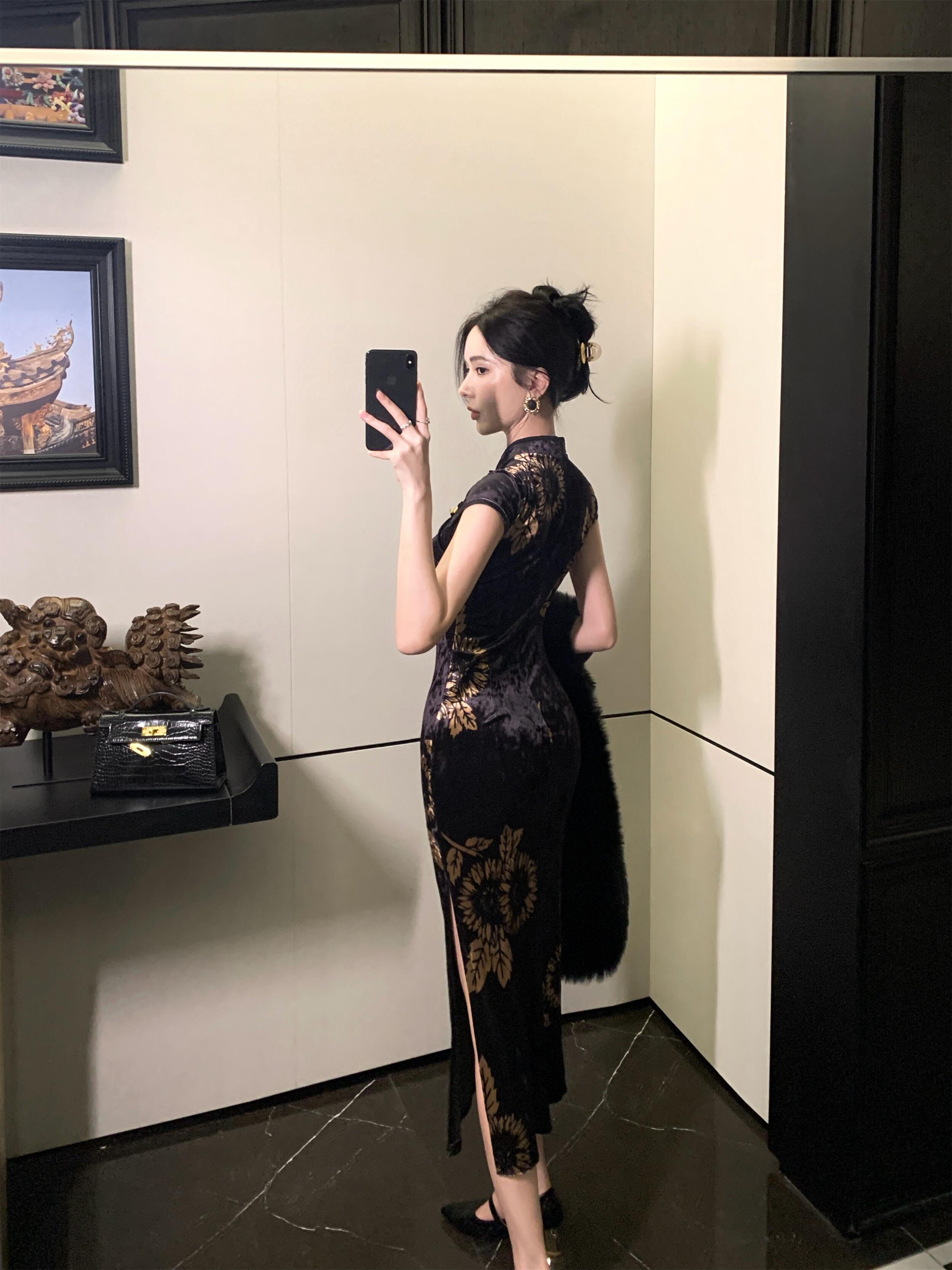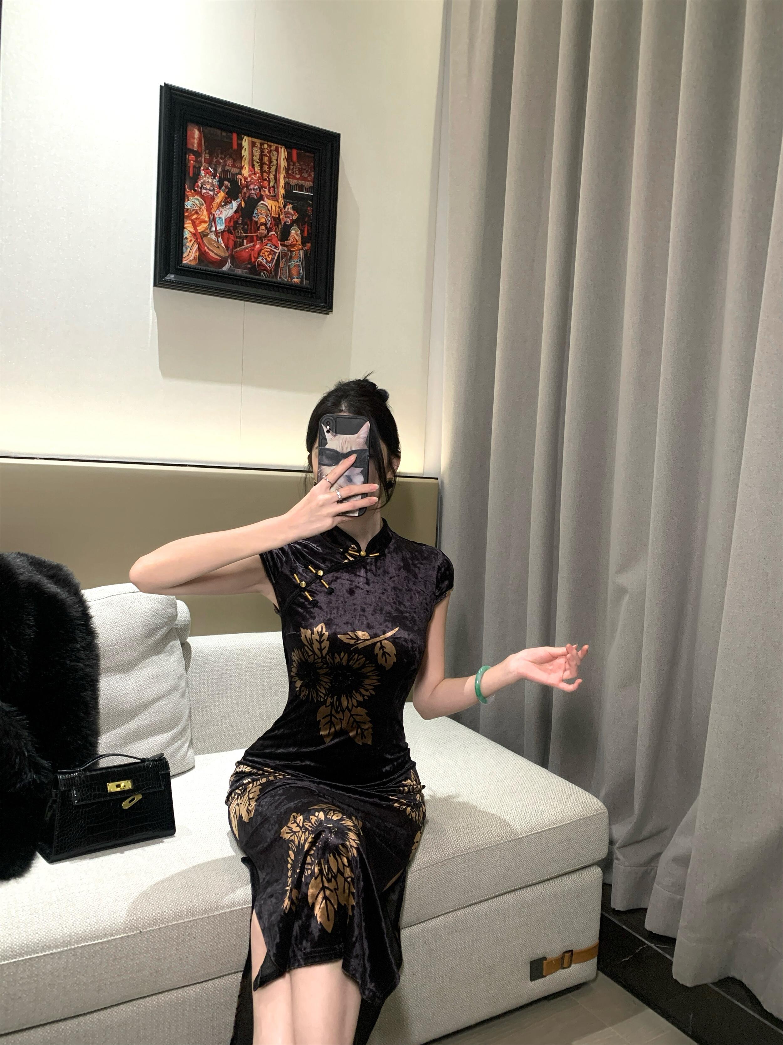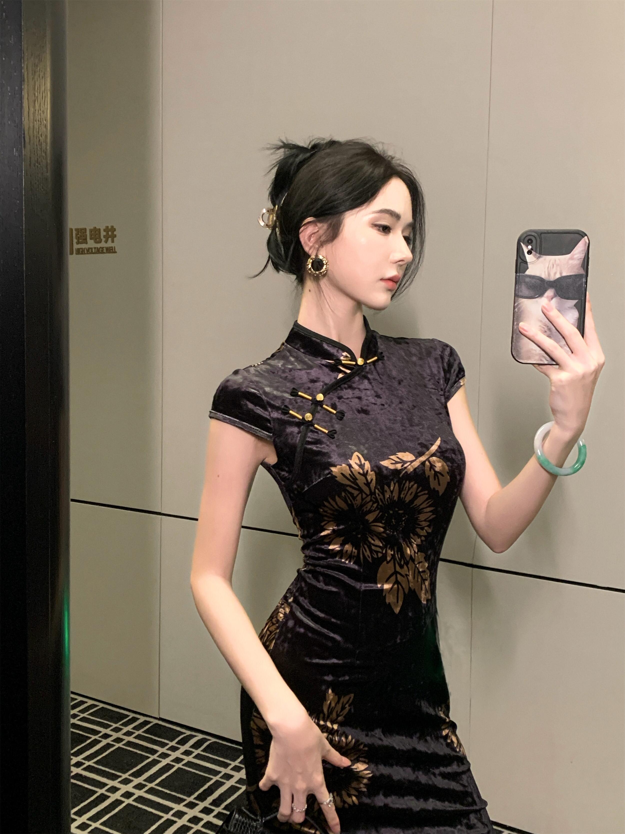 MY17257# 新中式旗袍短袖百搭丝绒印花性感显瘦修身收腰连衣裙子女裝貨源服裝批發