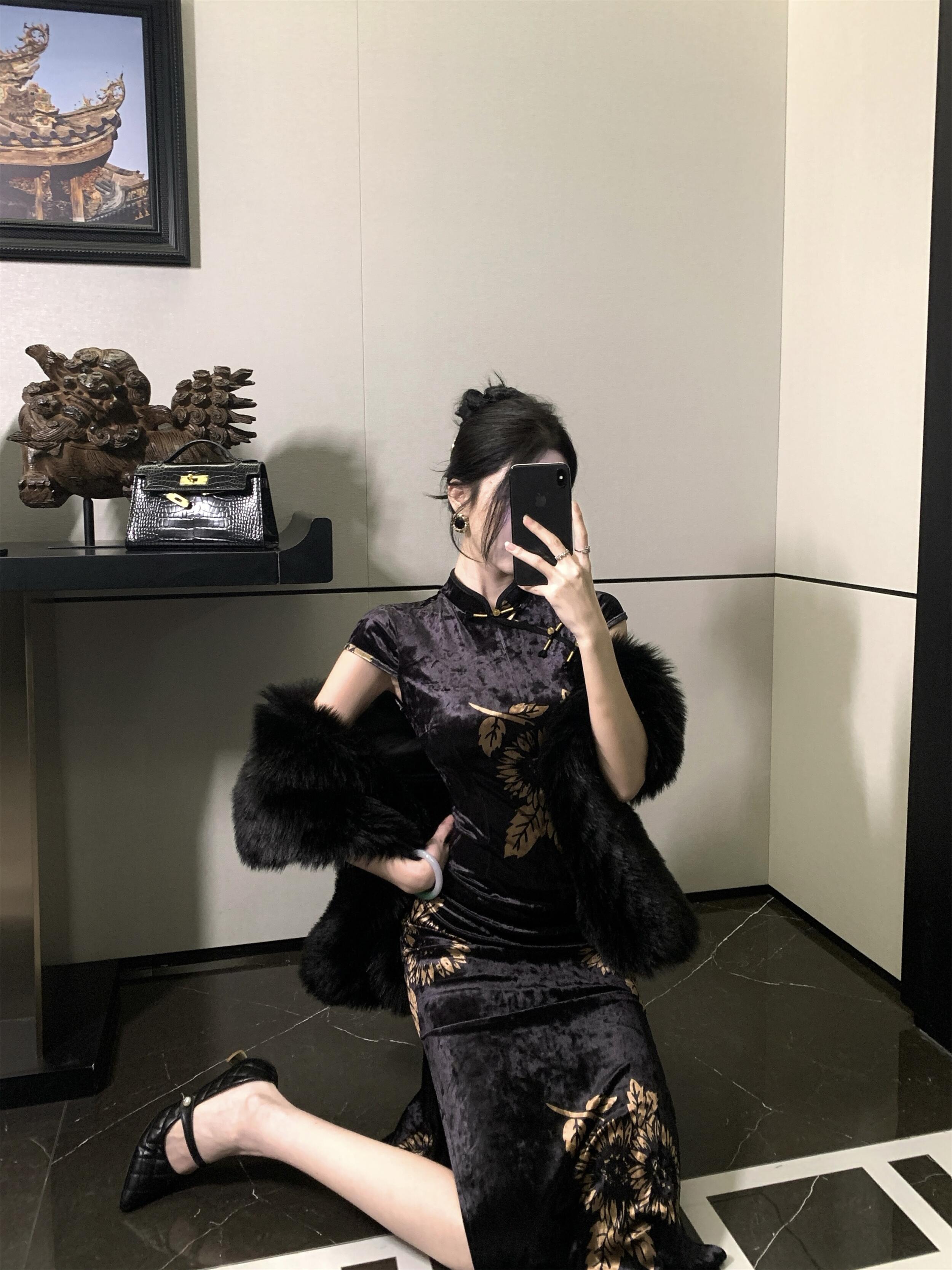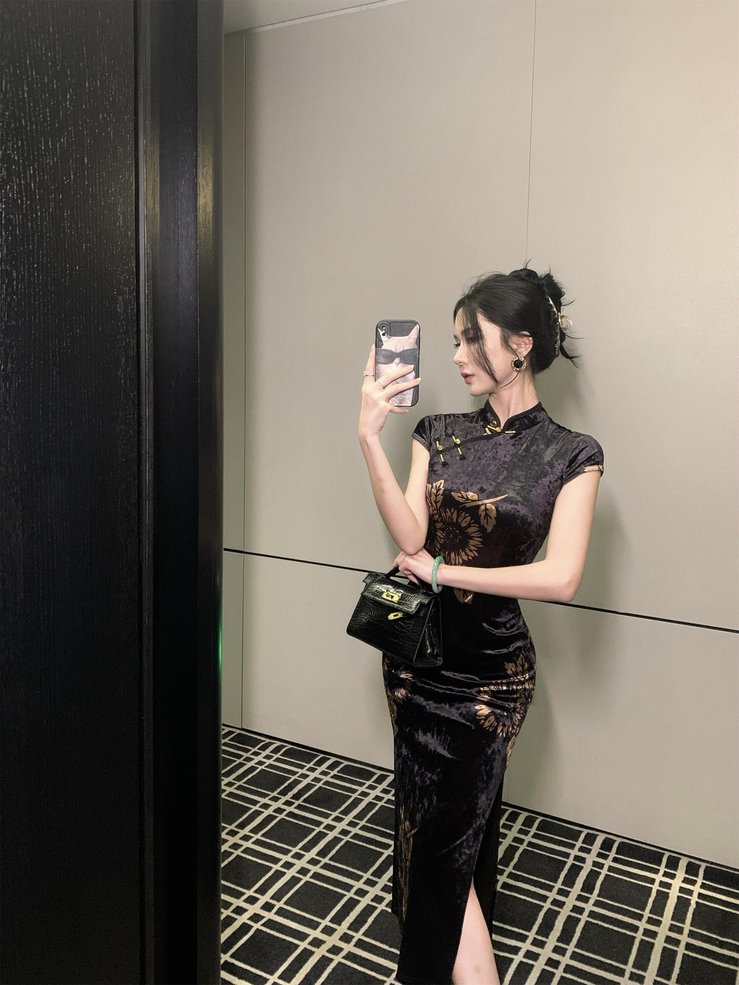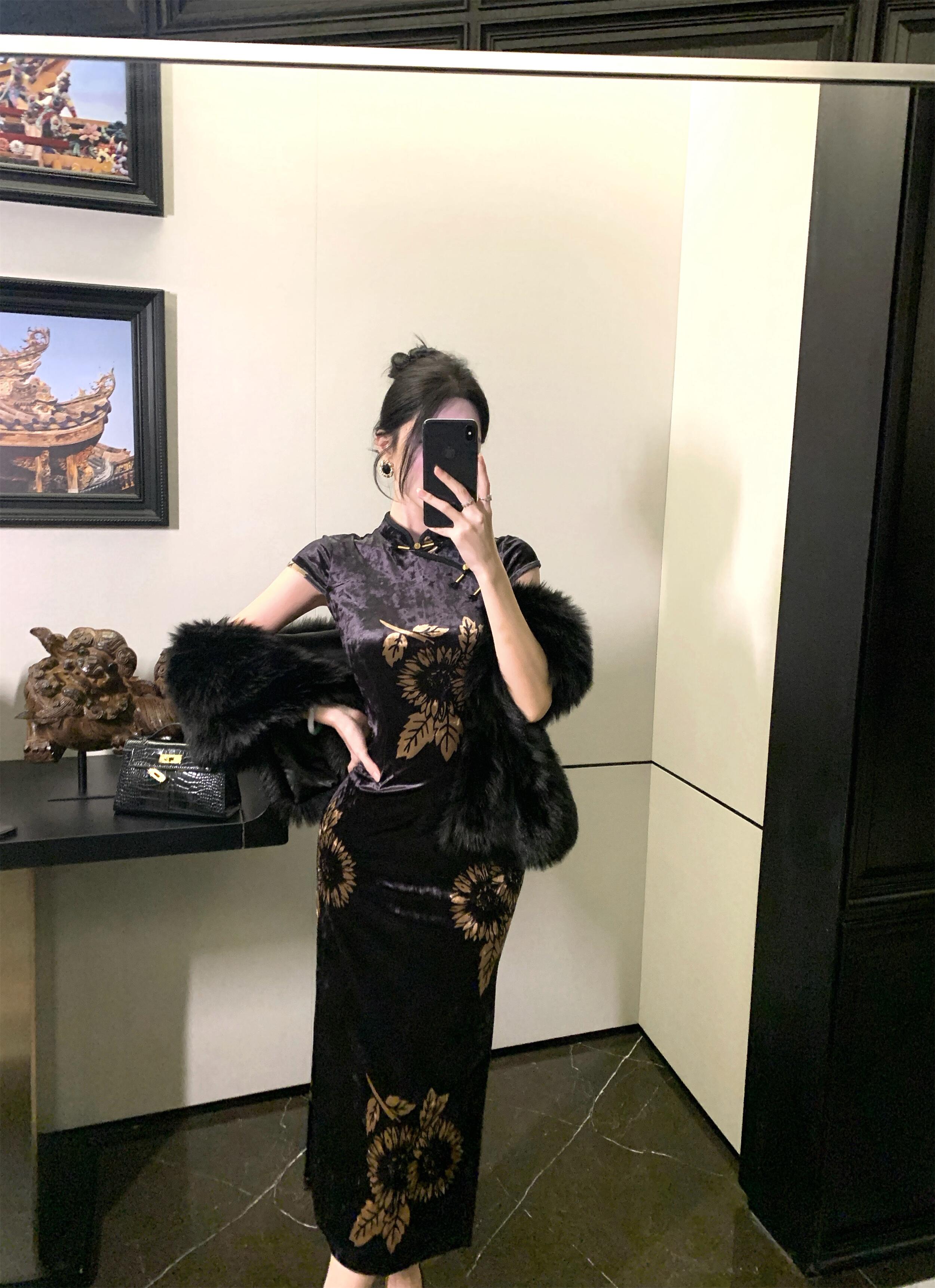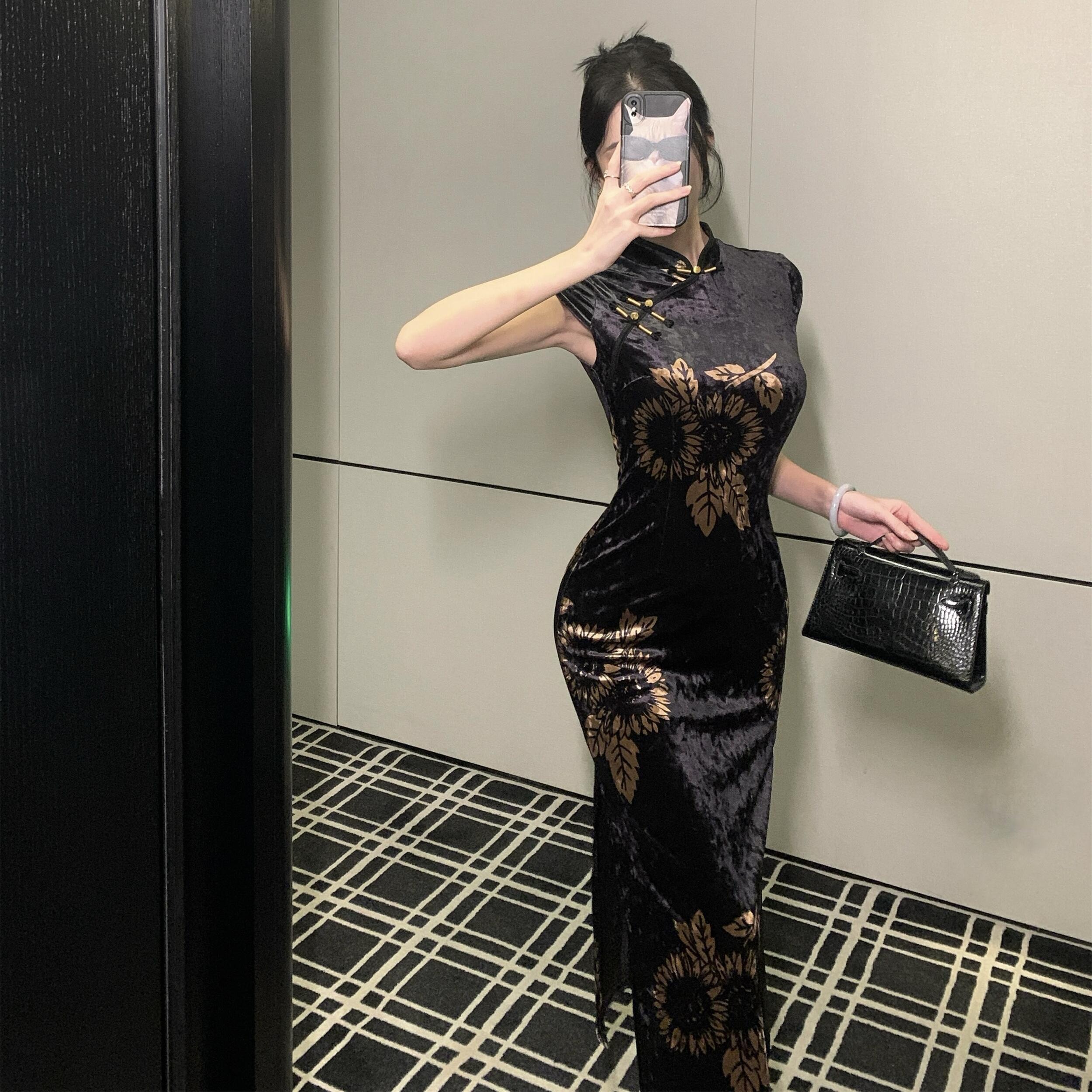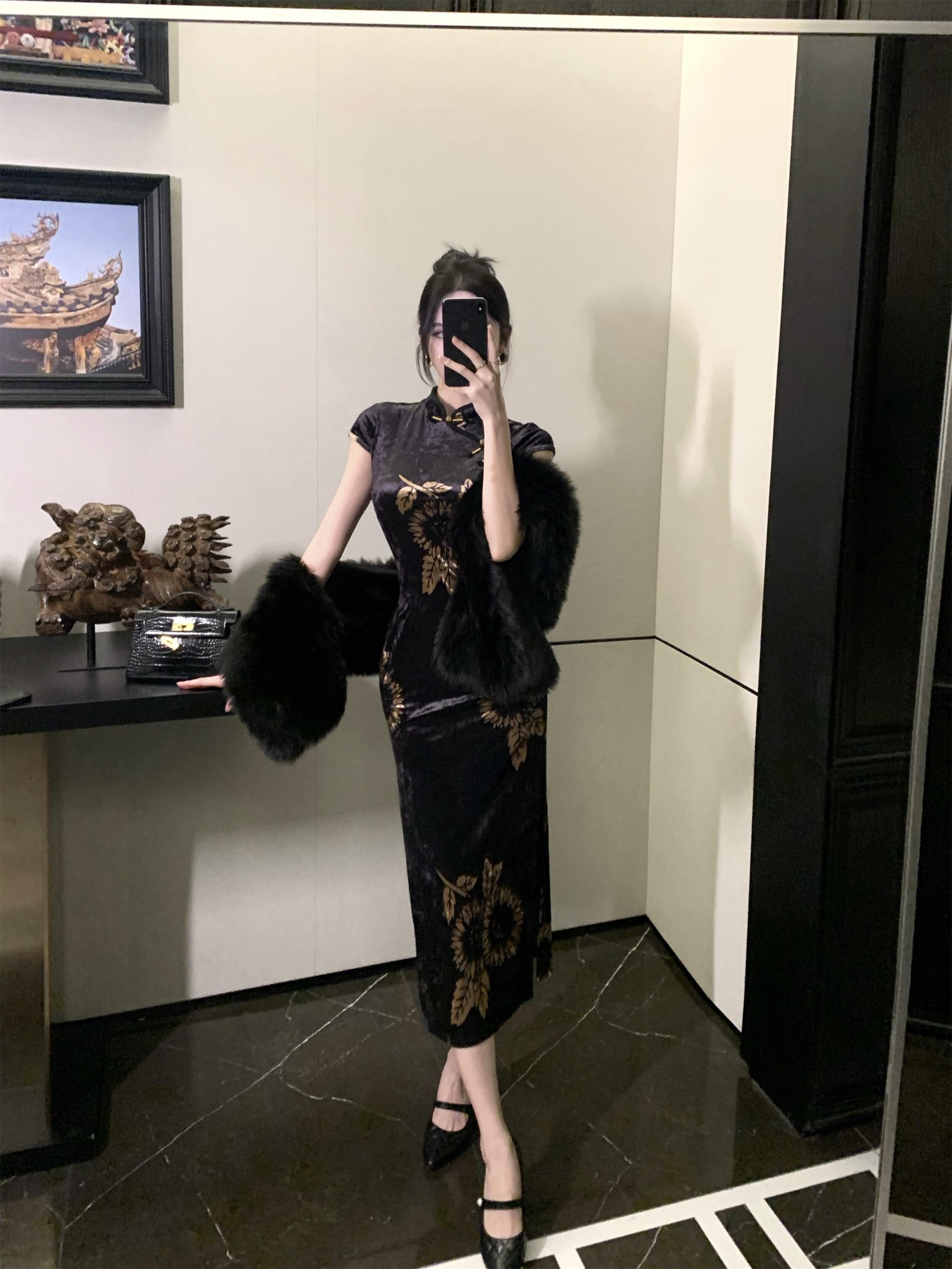 MY17257# 新中式旗袍短袖百搭丝绒印花性感显瘦修身收腰连衣裙子女裝貨源服裝批發