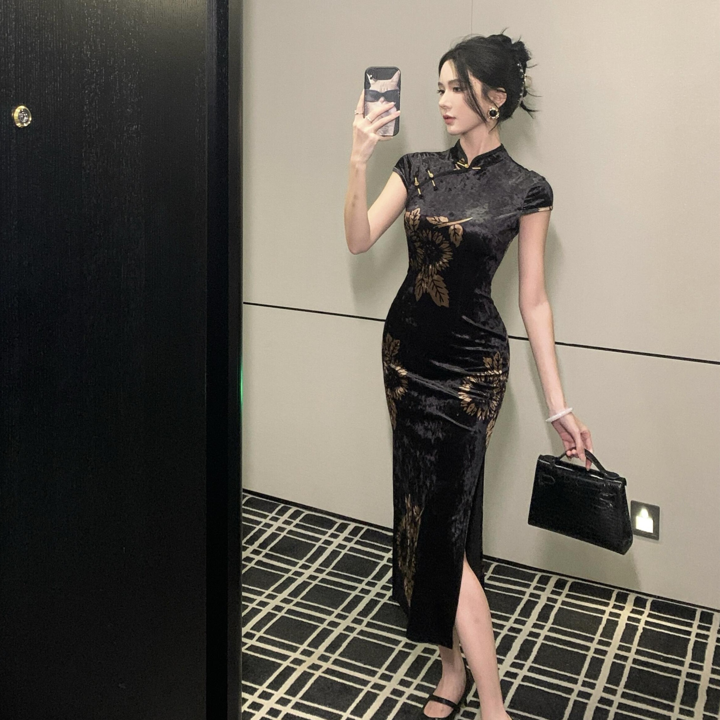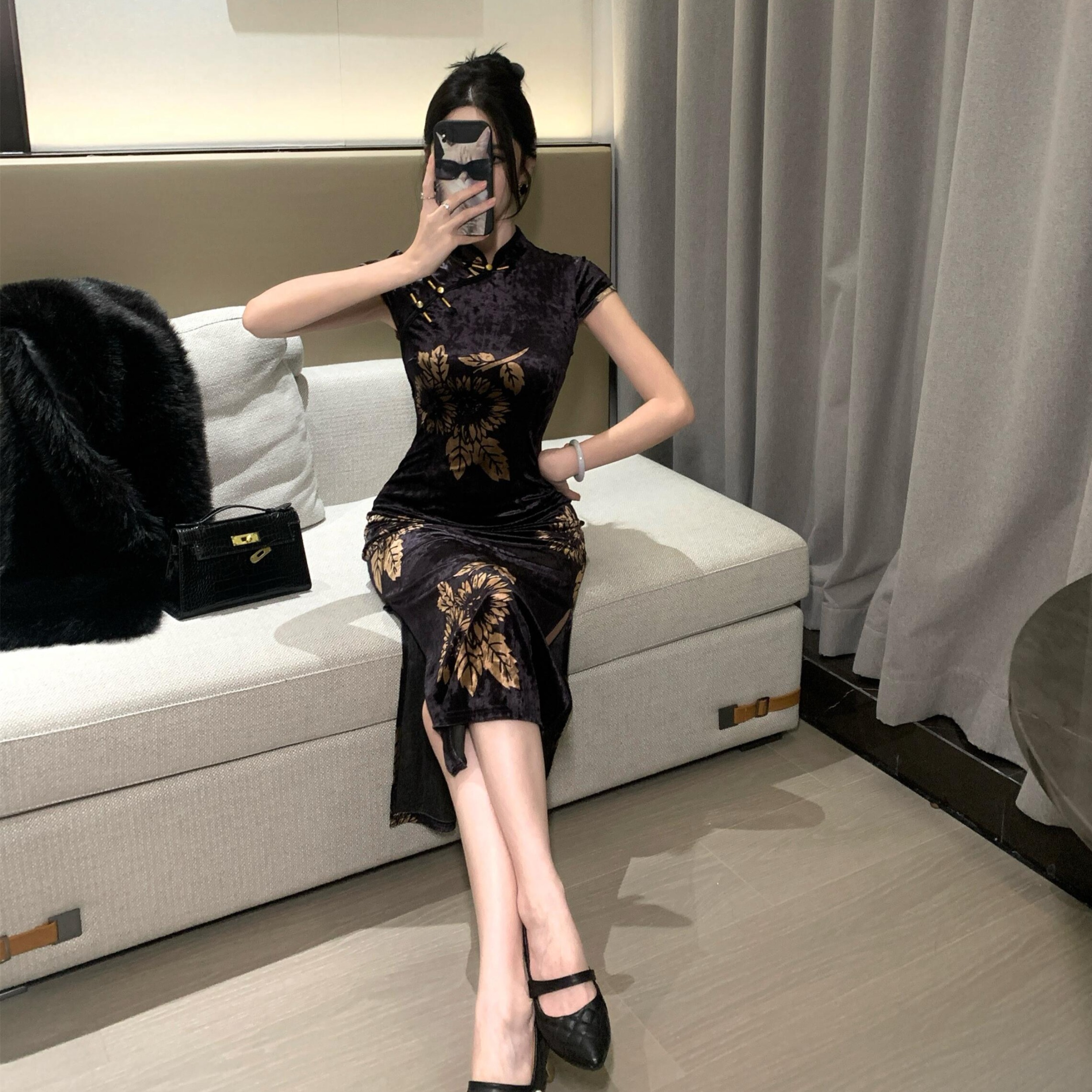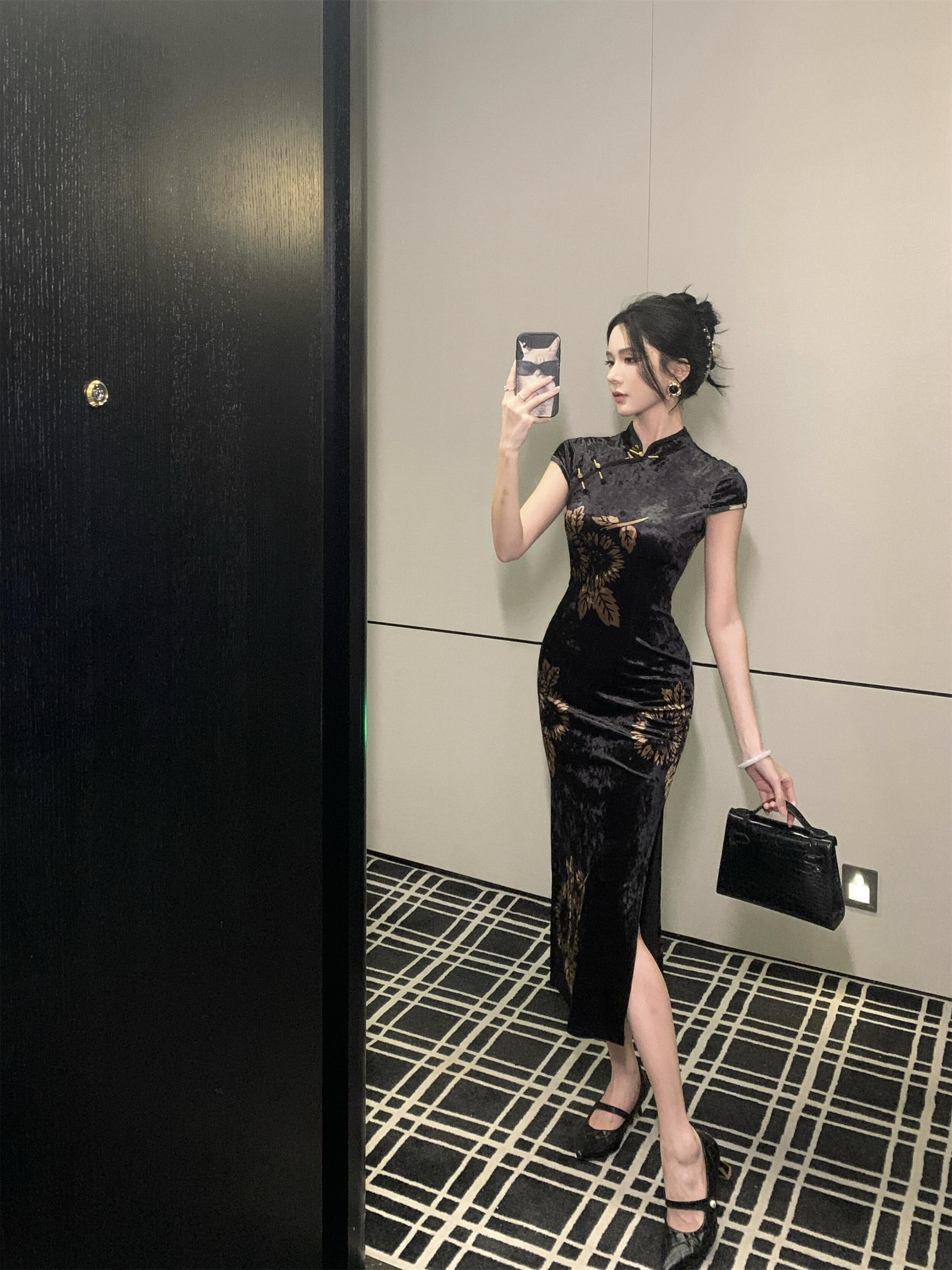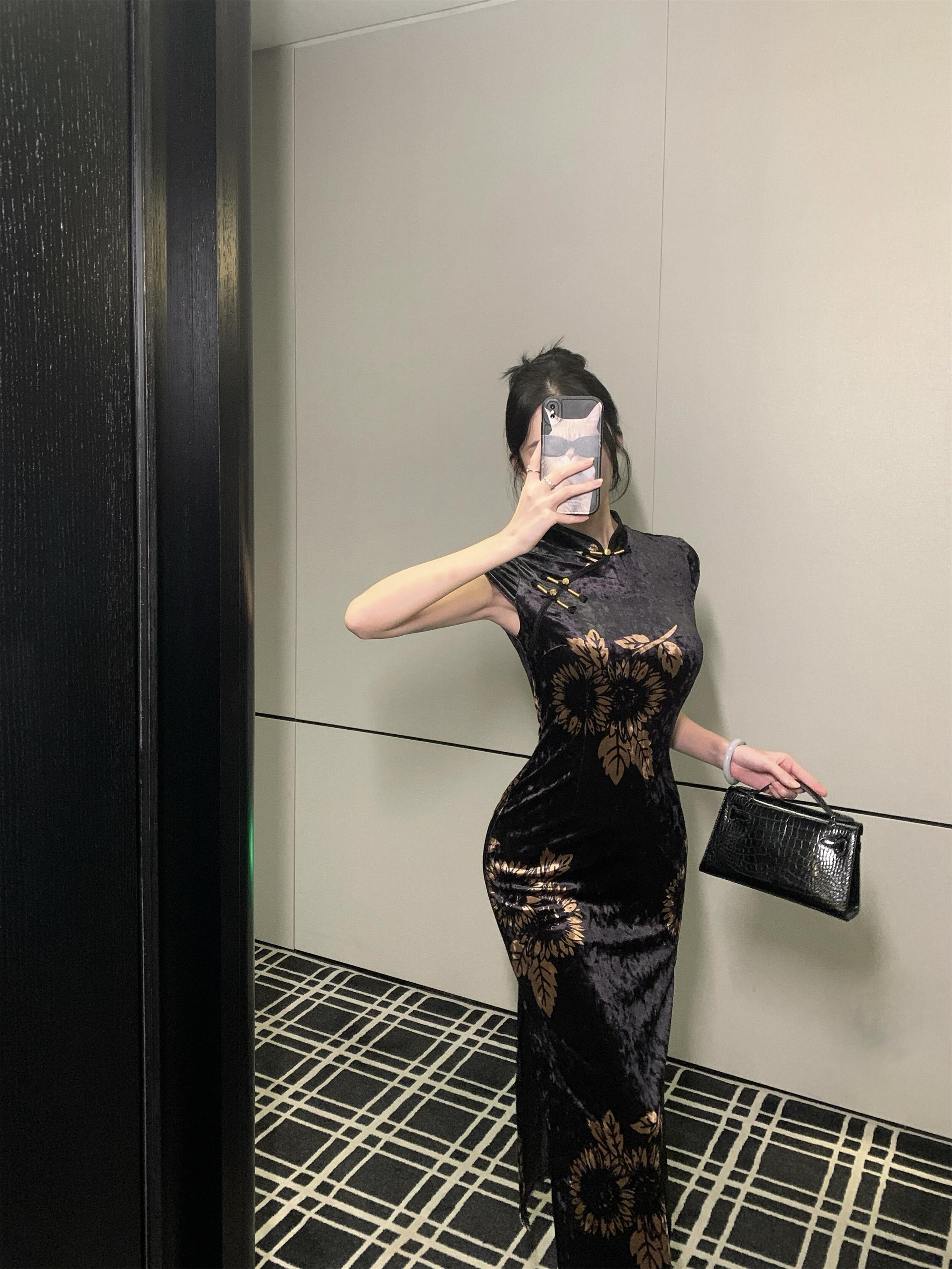 MY17257# 新中式旗袍短袖百搭丝绒印花性感显瘦修身收腰连衣裙子女裝貨源服裝批發