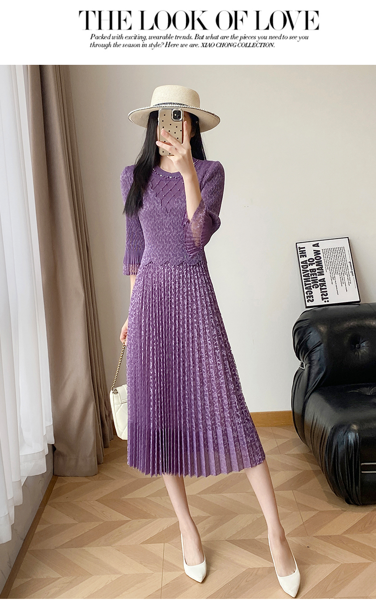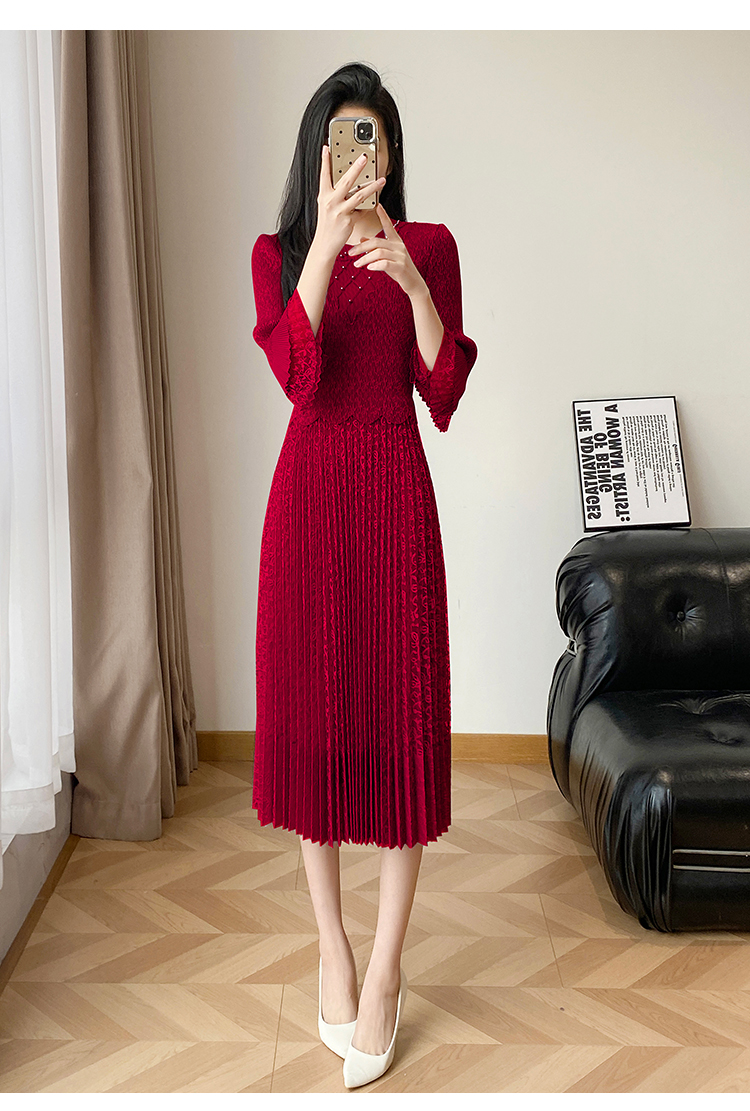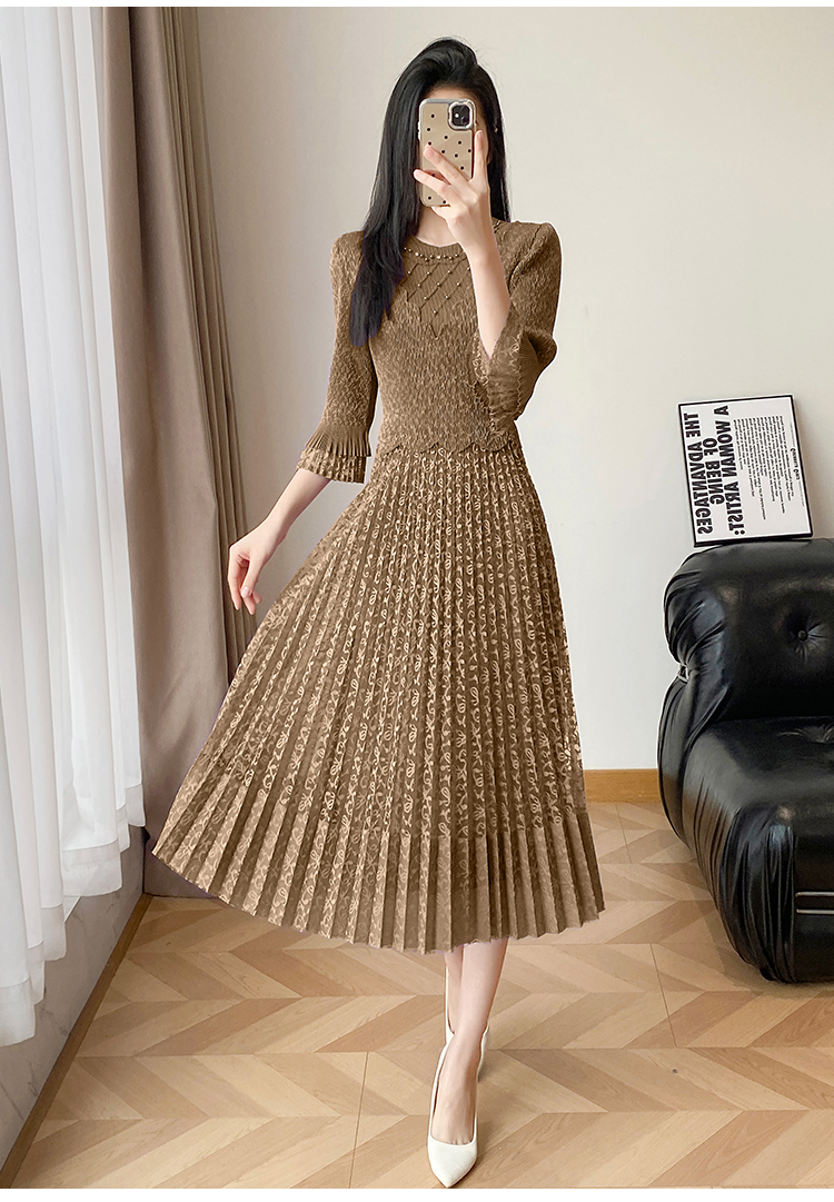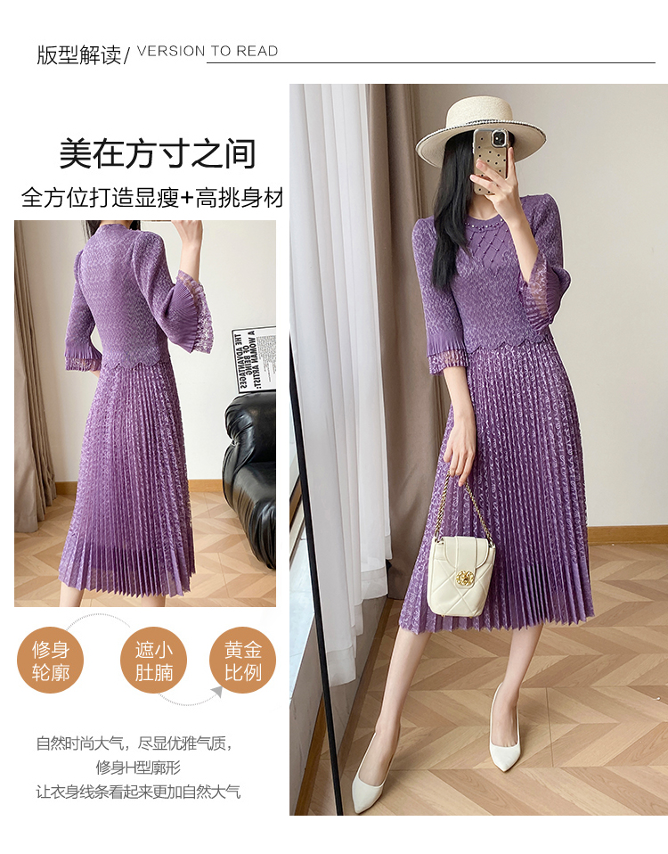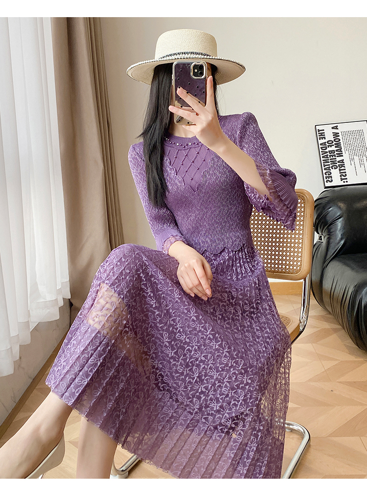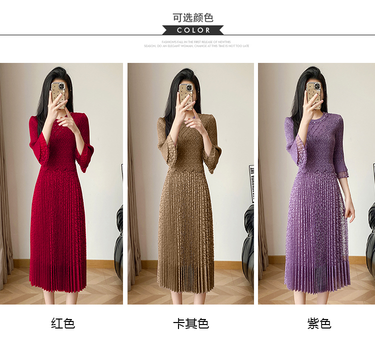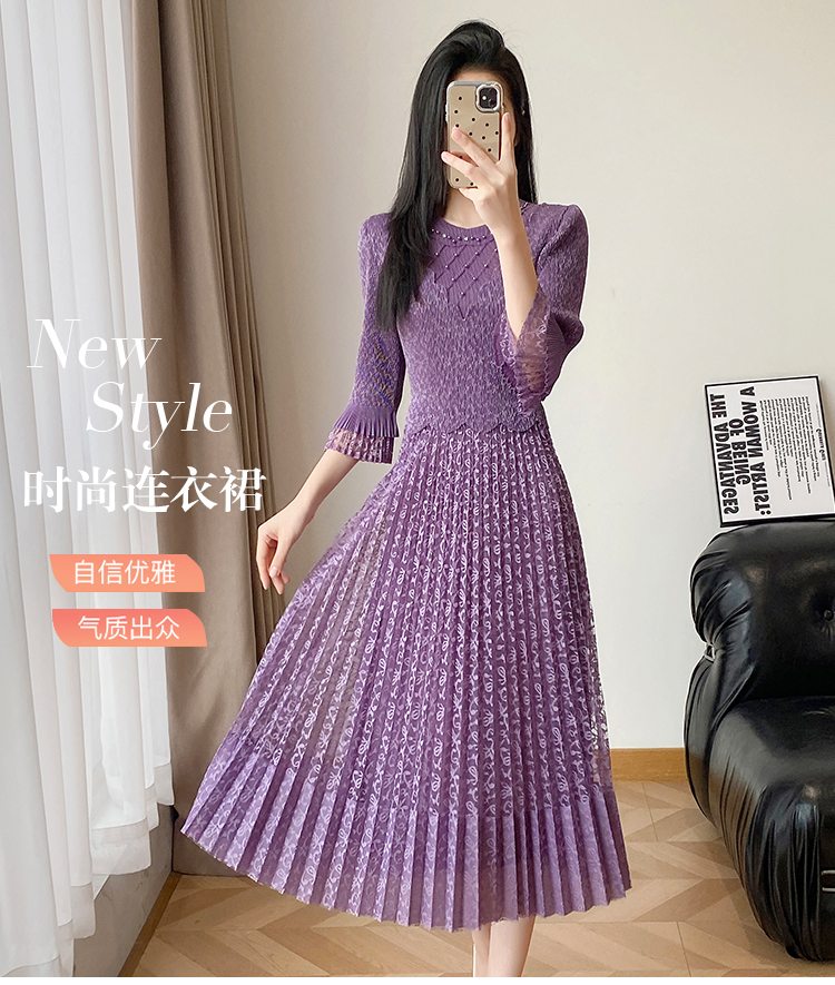 RY173# 欧洲站2026年春新款时尚褶皱蕾丝拼接修身显瘦连衣裙中长款百褶裙