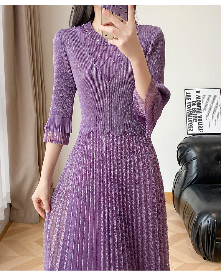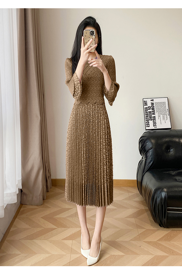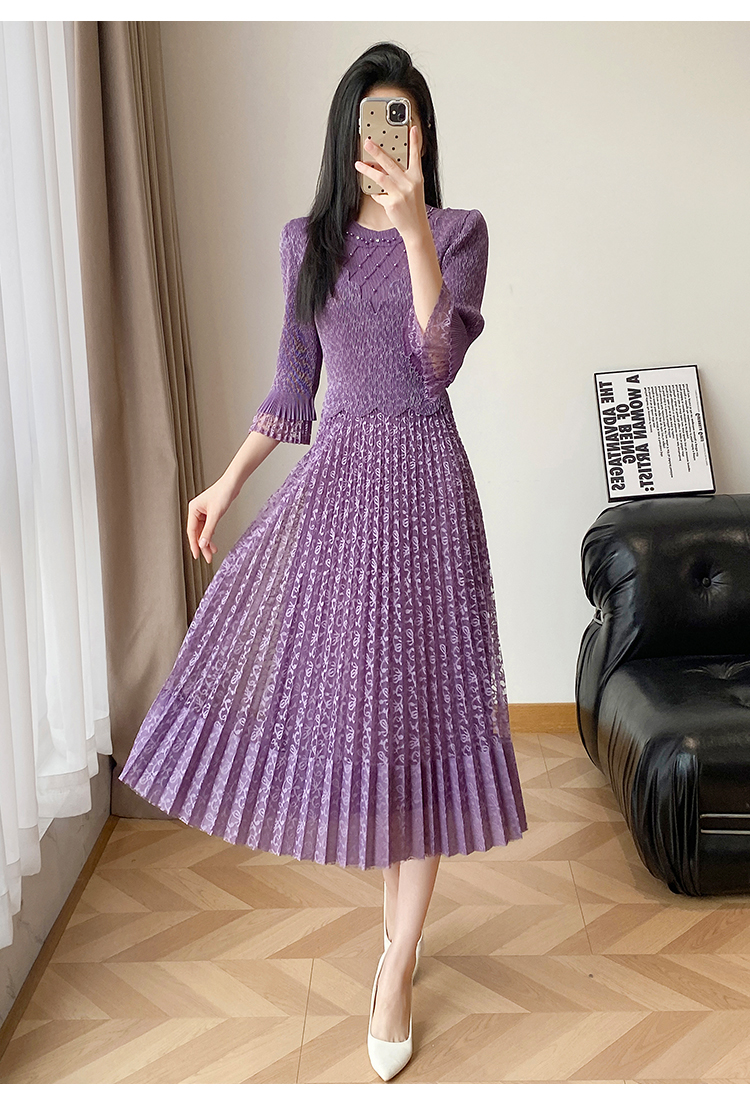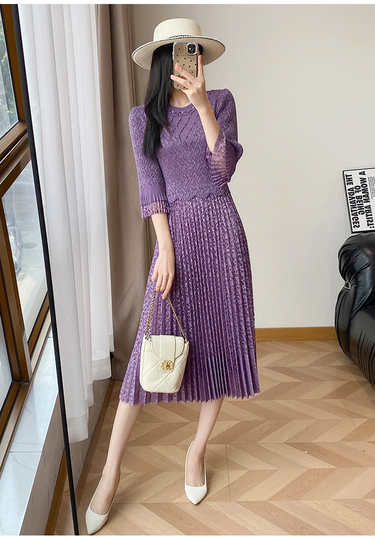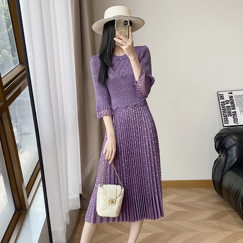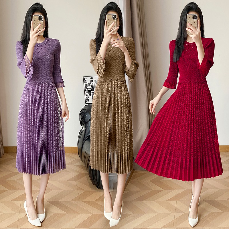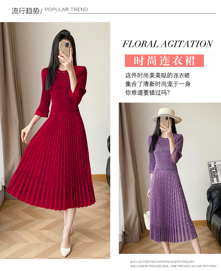 RY173# 欧洲站2026年春新款时尚褶皱蕾丝拼接修身显瘦连衣裙中长款百褶裙