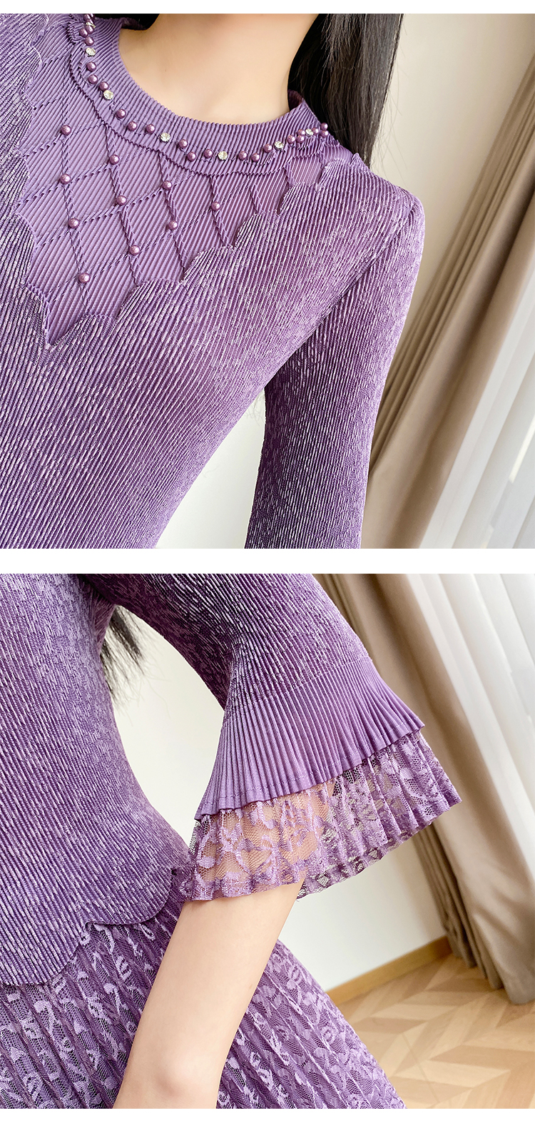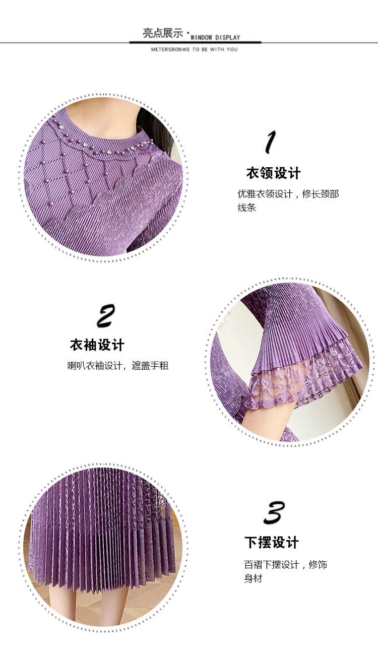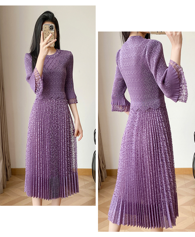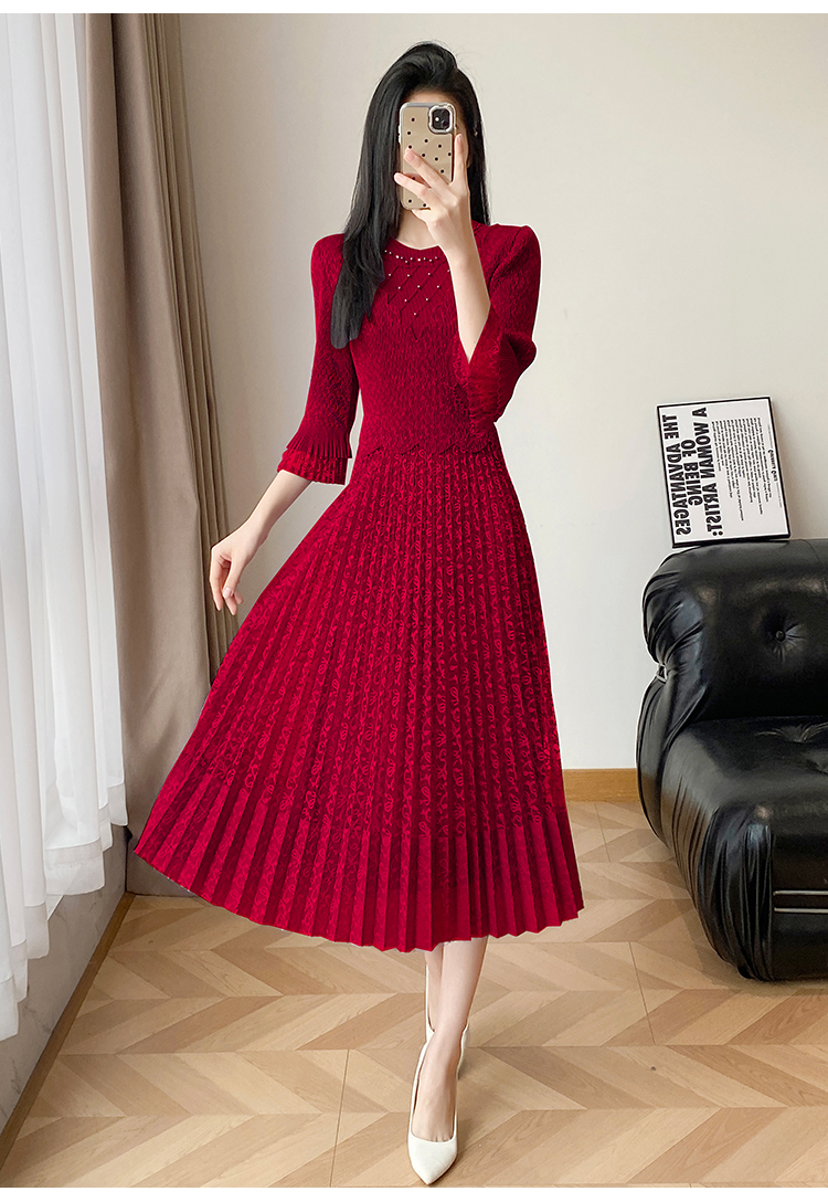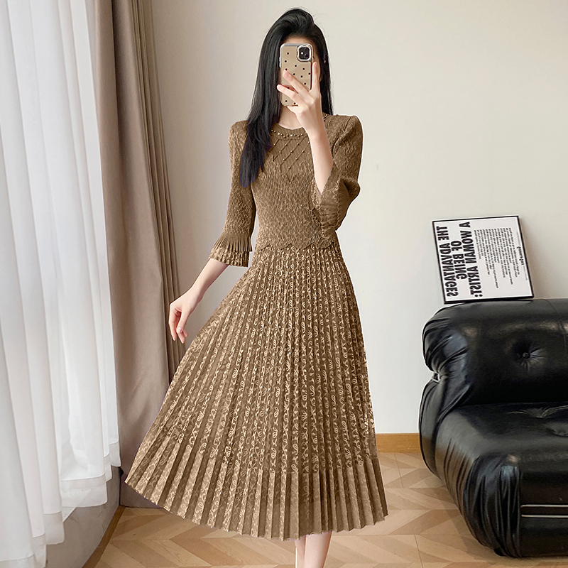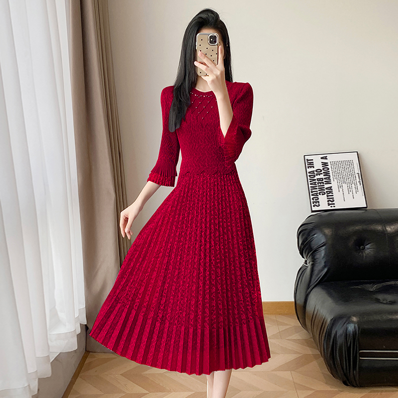 RY173# 欧洲站2026年春新款时尚褶皱蕾丝拼接修身显瘦连衣裙中长款百褶裙