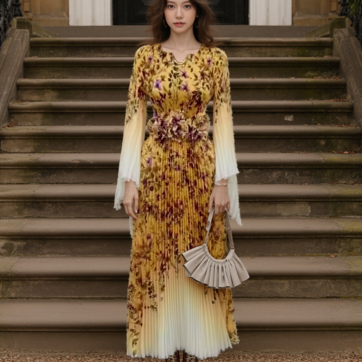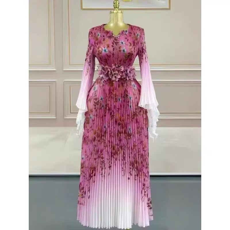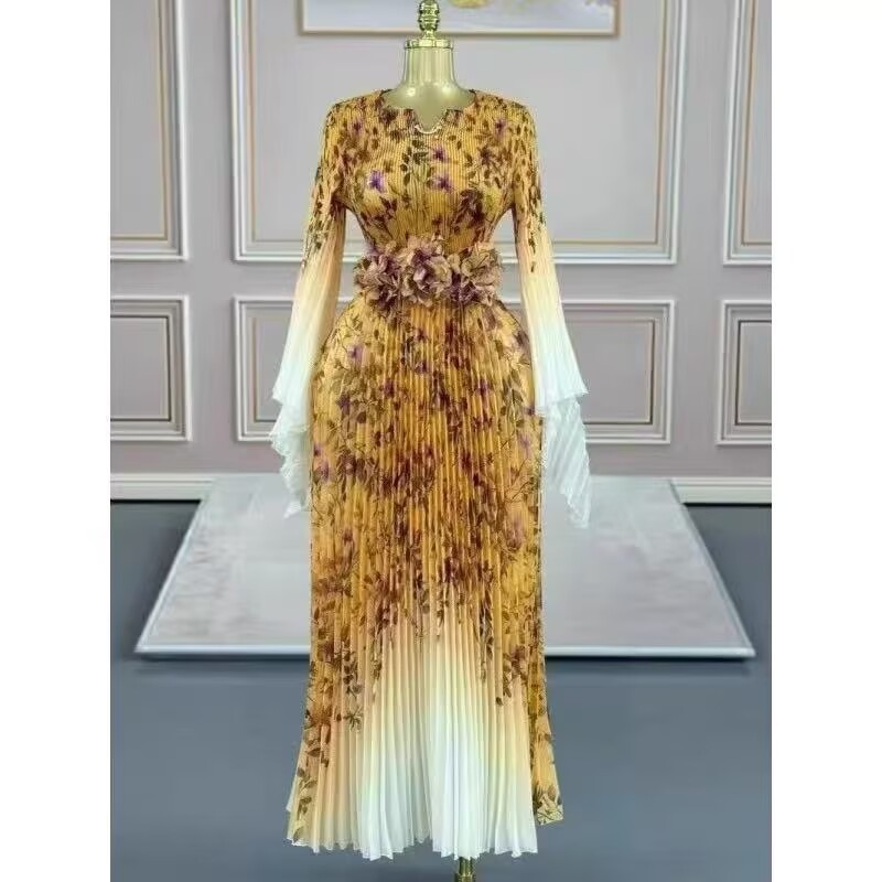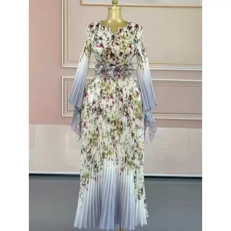 RY174# 跨境欧美非洲女设计感褶皱收腰立体花朵装饰喇叭袖连衣裙印花裙