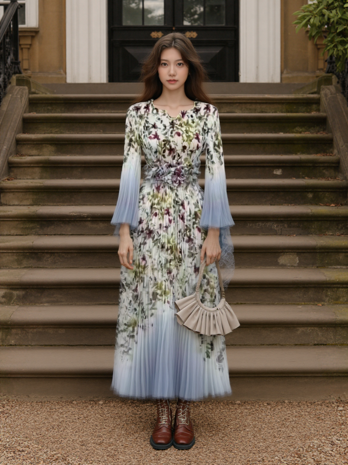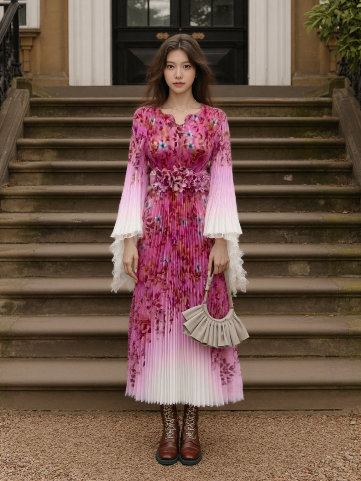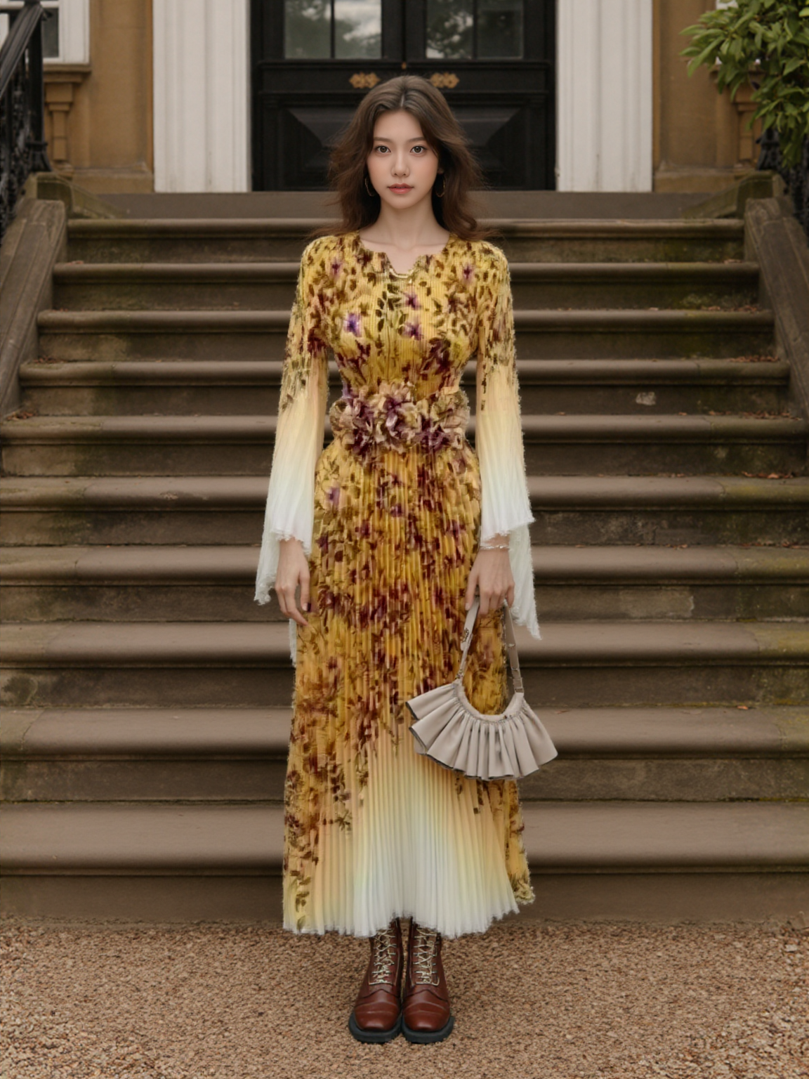 RY174# 跨境欧美非洲女设计感褶皱收腰立体花朵装饰喇叭袖连衣裙印花裙