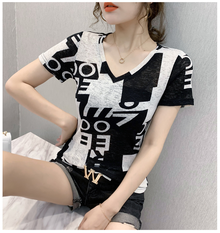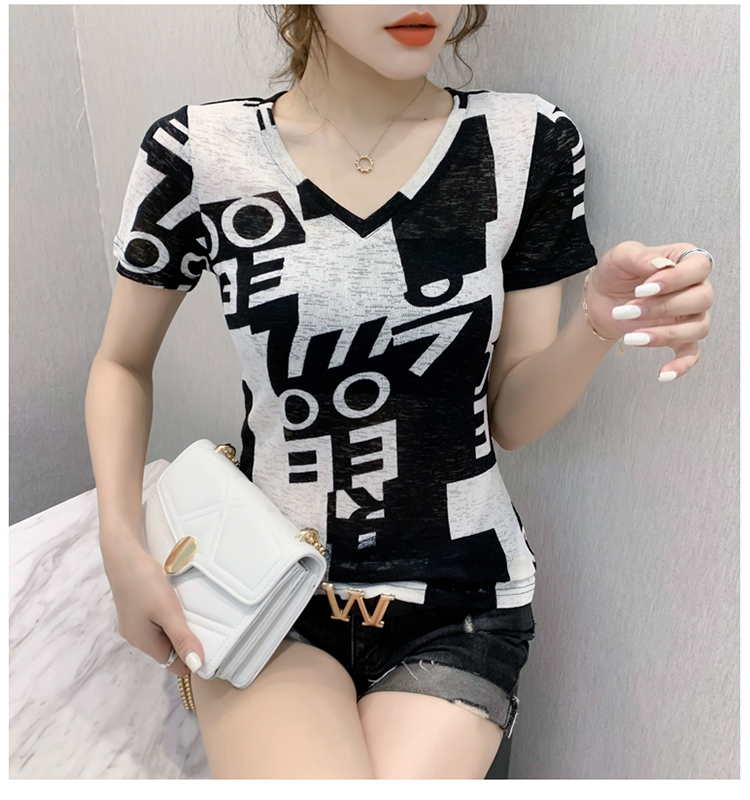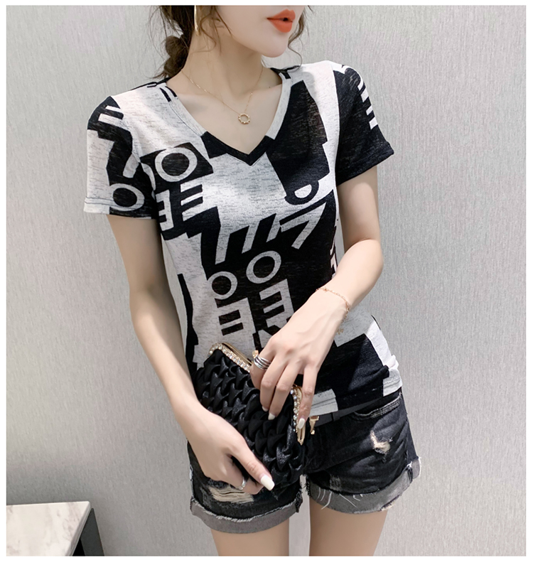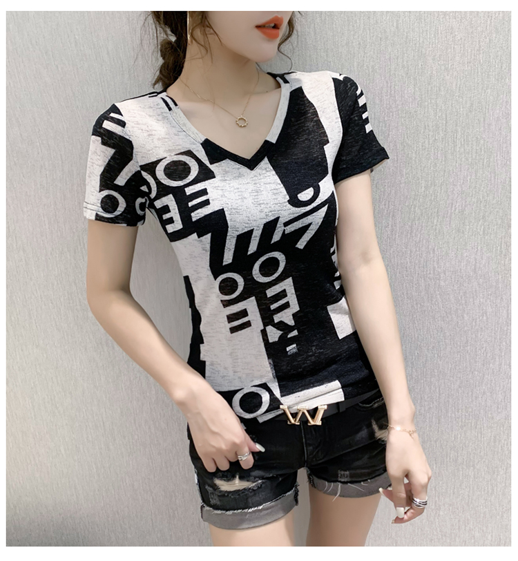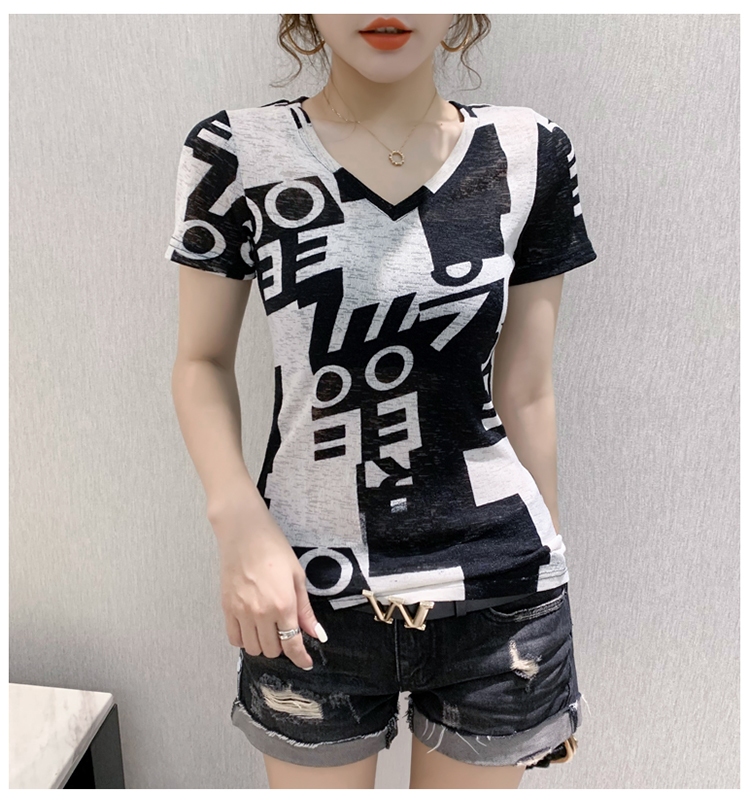 RY185# 欧货2026夏季新款时尚V领短袖印花T恤女修身显瘦上衣女