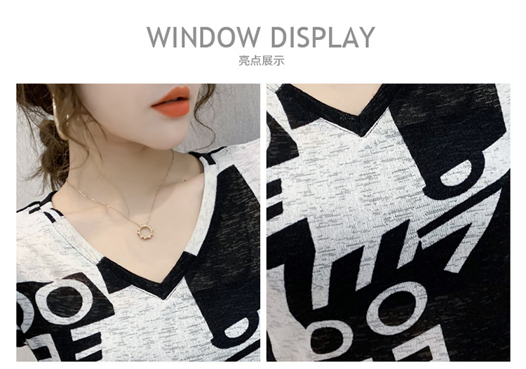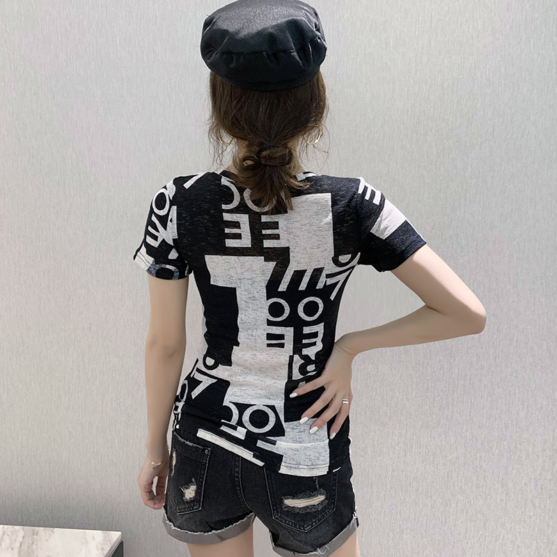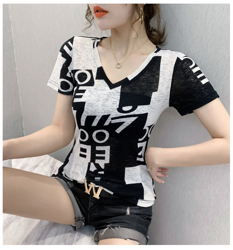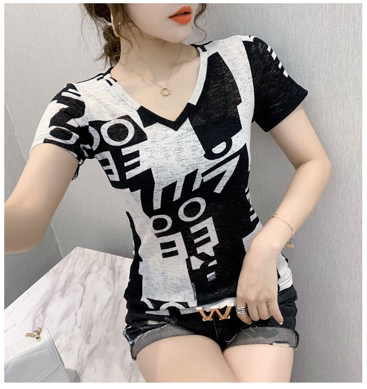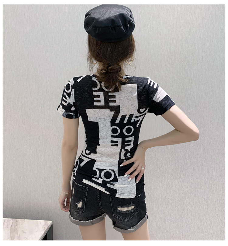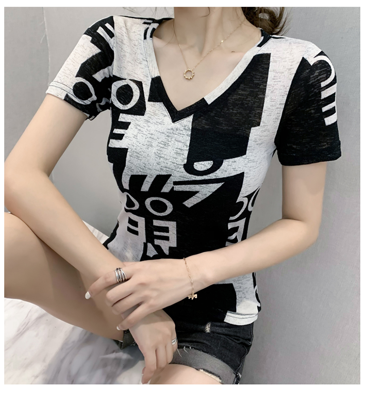RY185# 欧货2026夏季新款时尚V领短袖印花T恤女修身显瘦上衣女