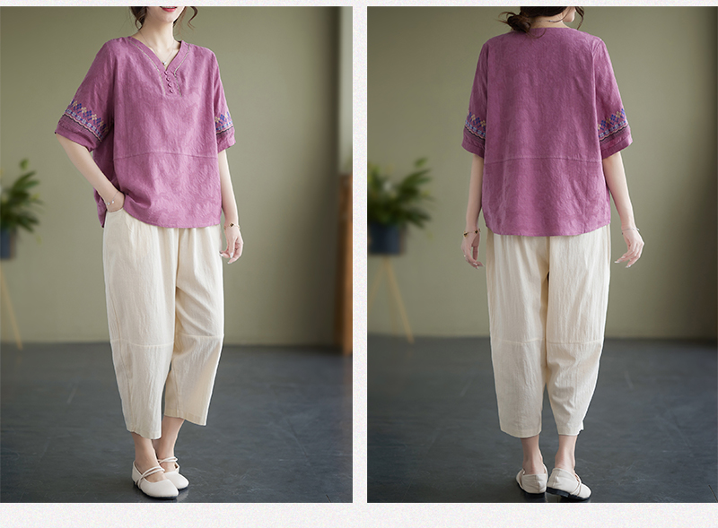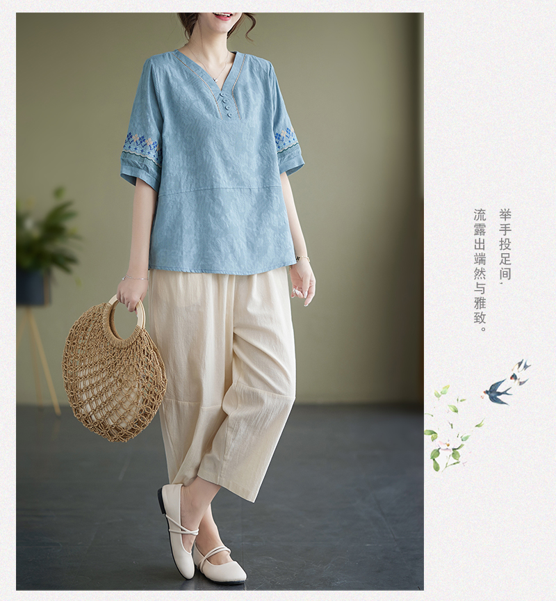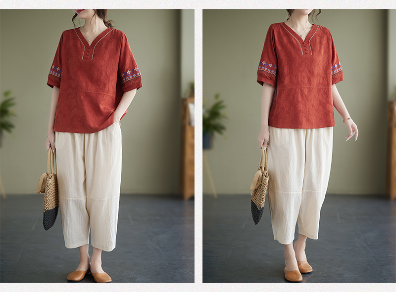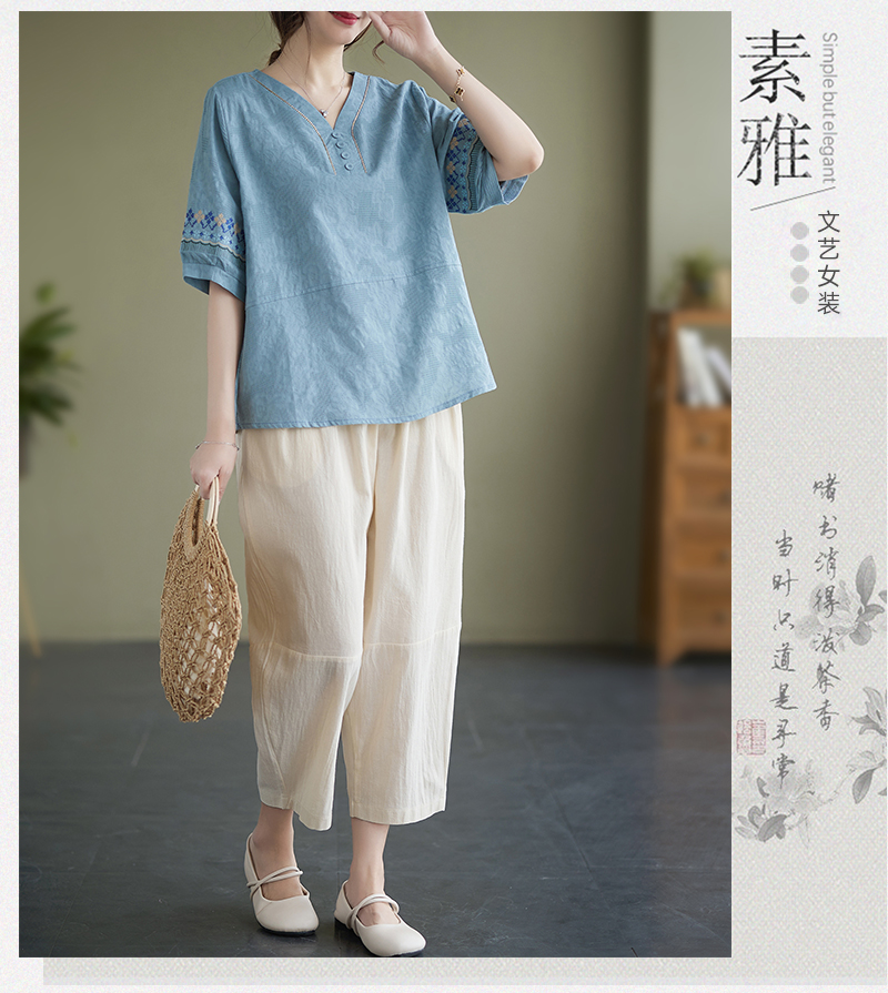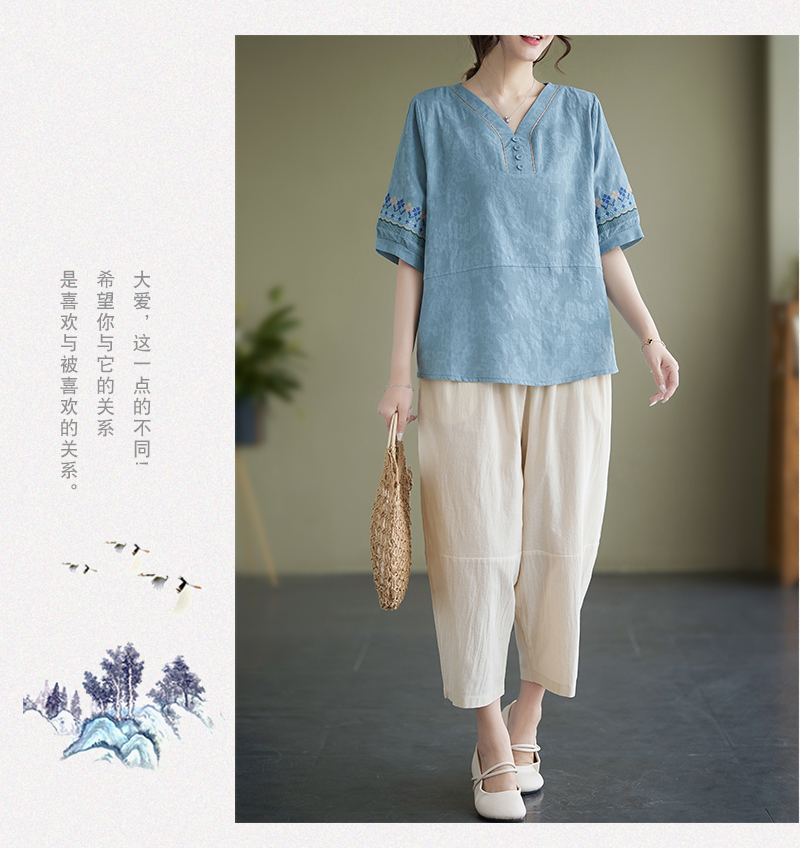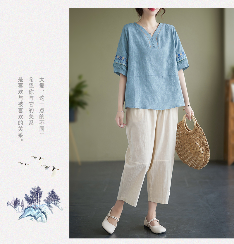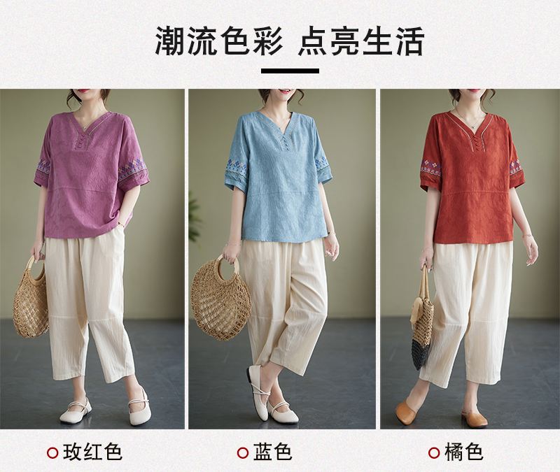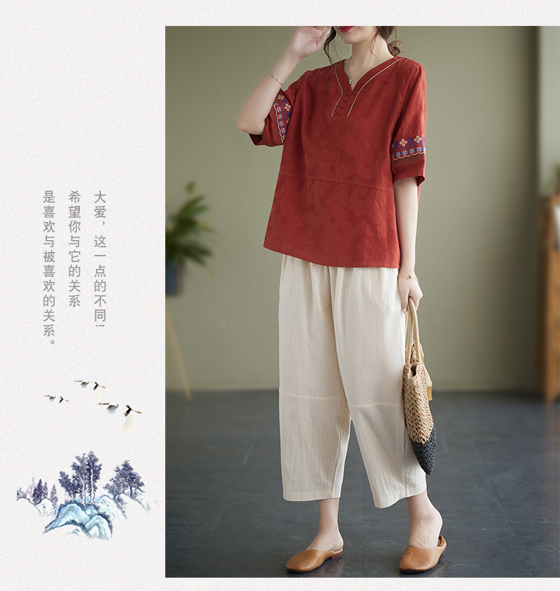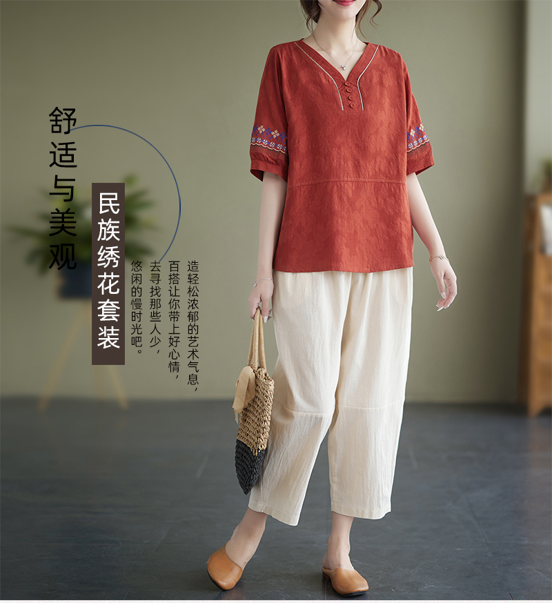RY228# 实拍妈妈装夏款棉麻文艺宽松中袖V领上衣短袖T恤+阔腿裤两件套女