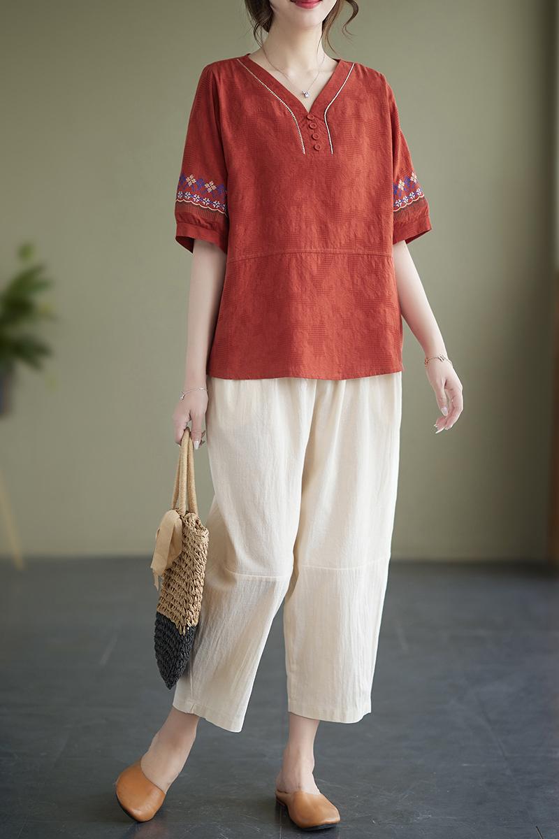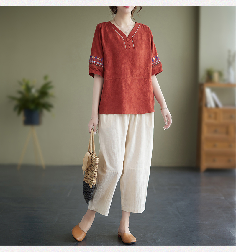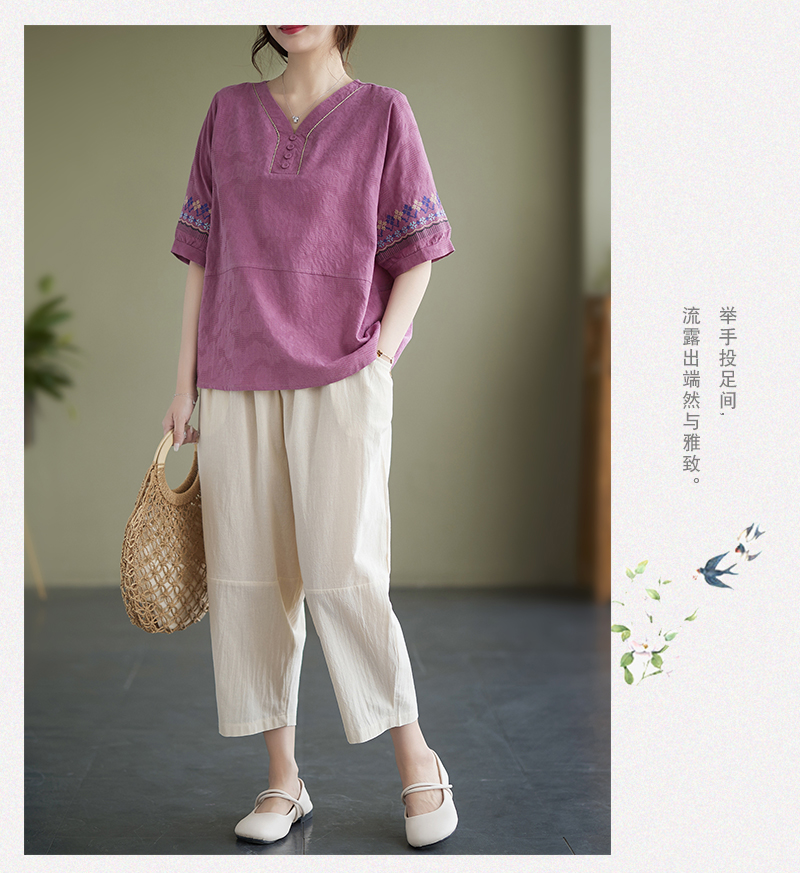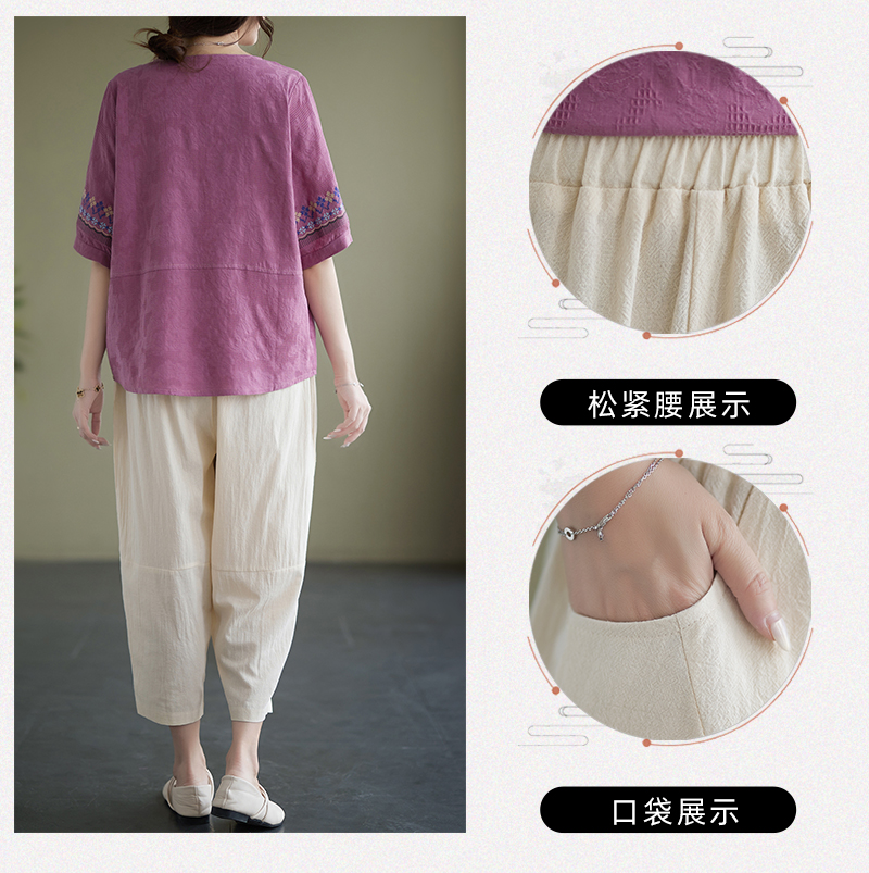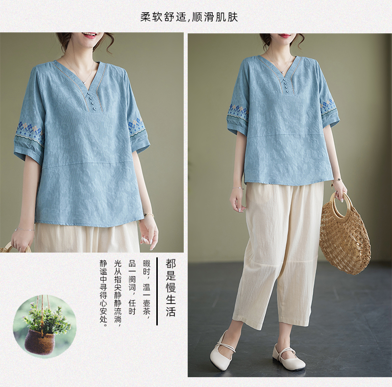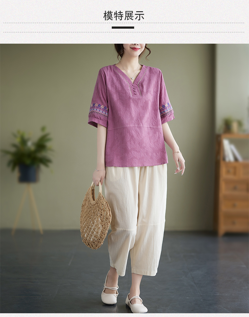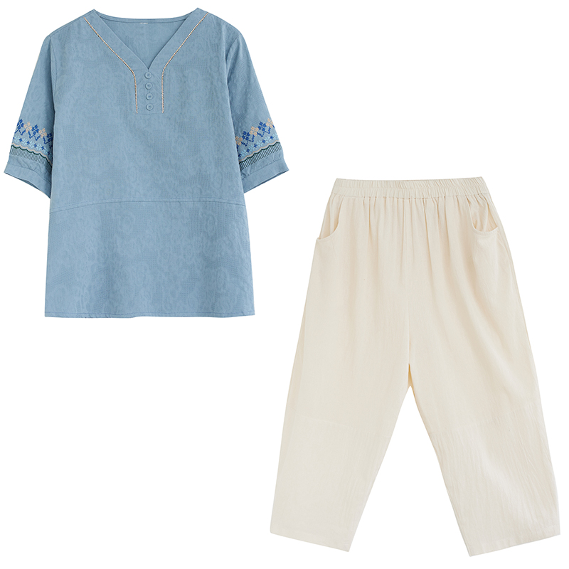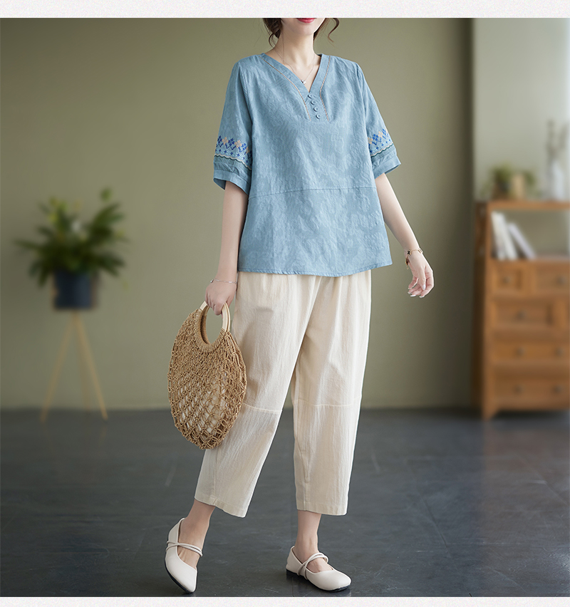 RY228# 实拍妈妈装夏款棉麻文艺宽松中袖V领上衣短袖T恤+阔腿裤两件套女