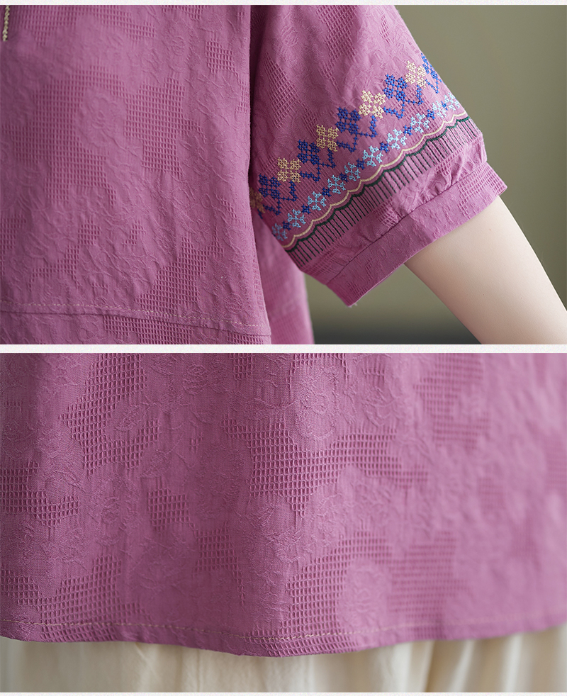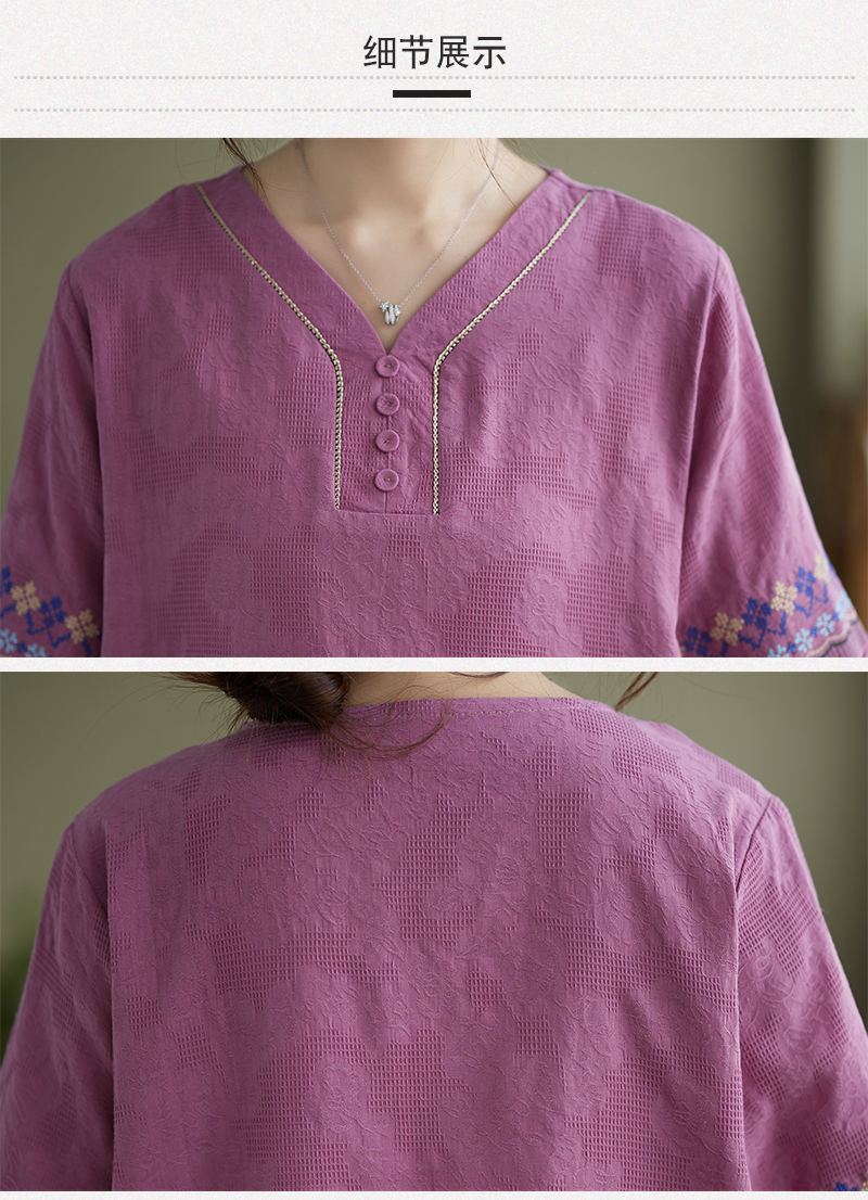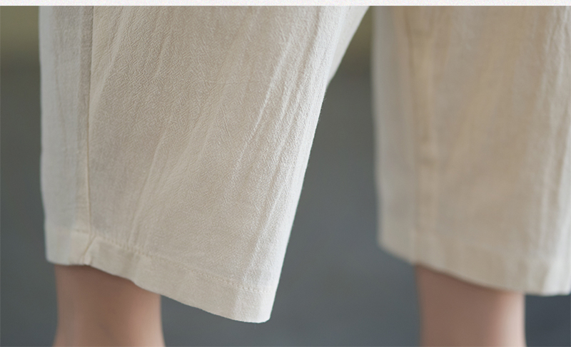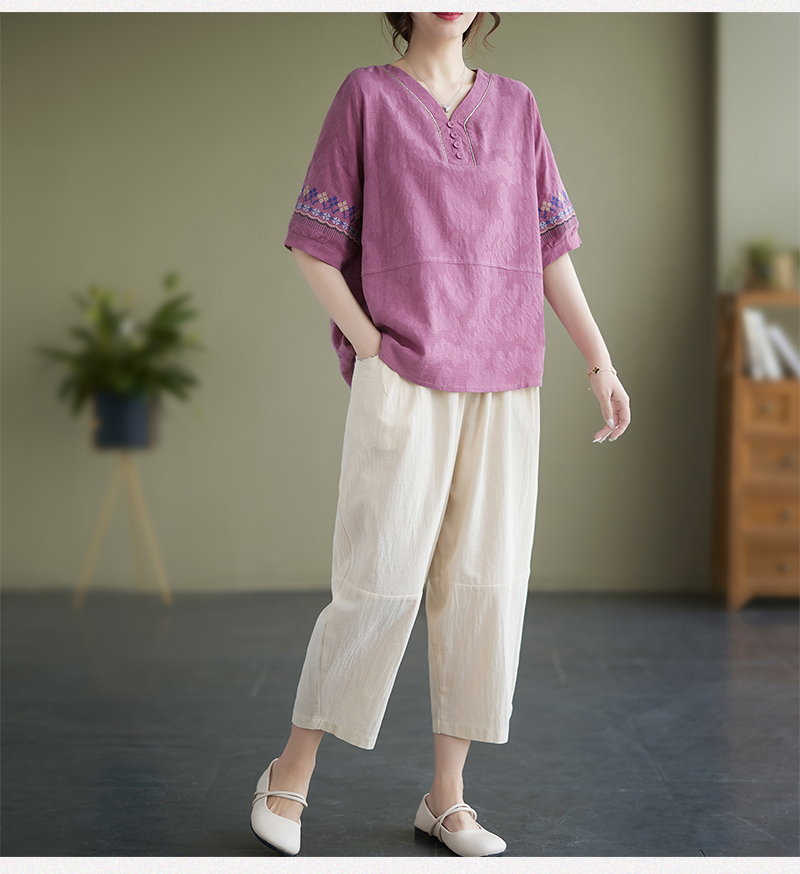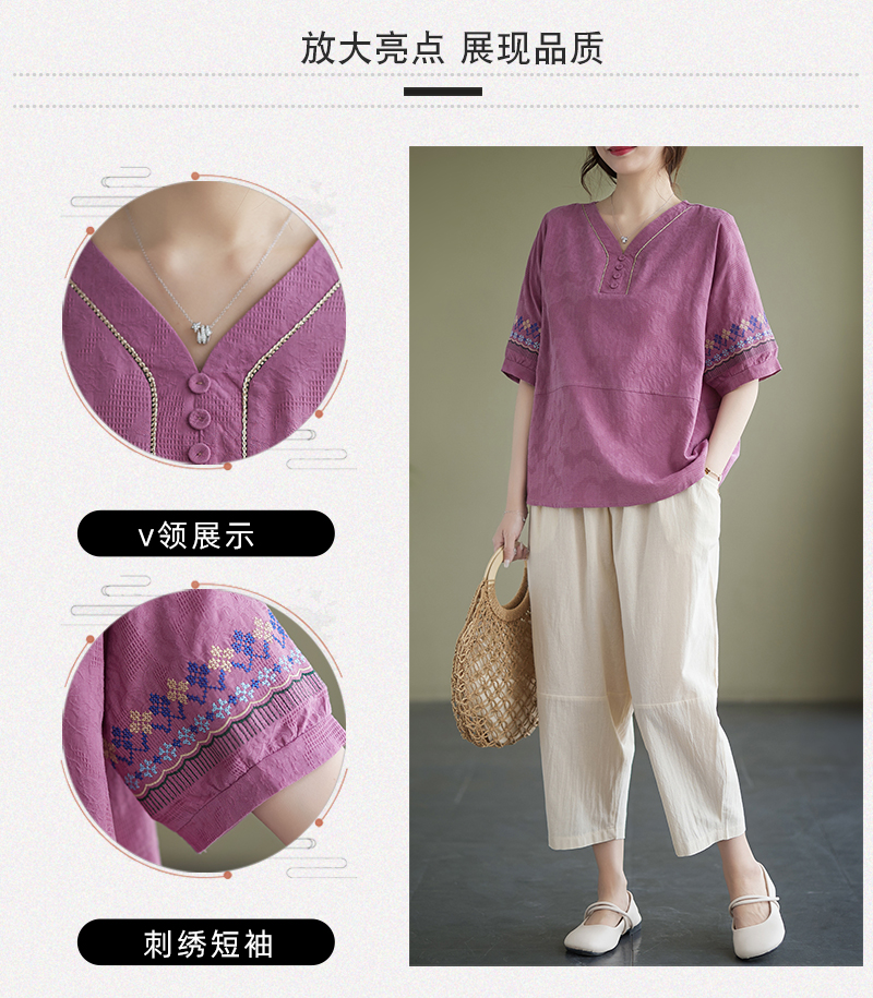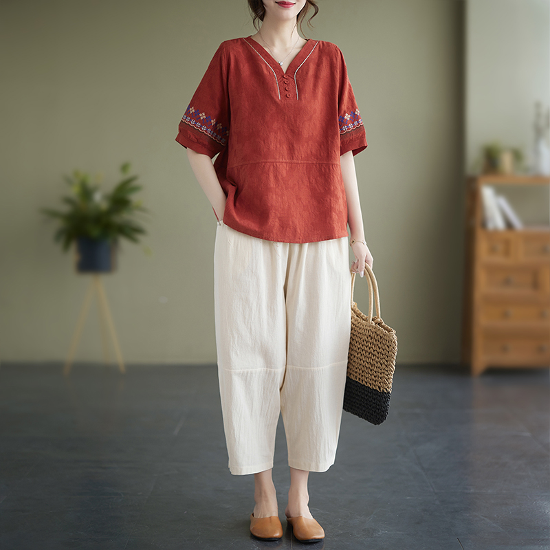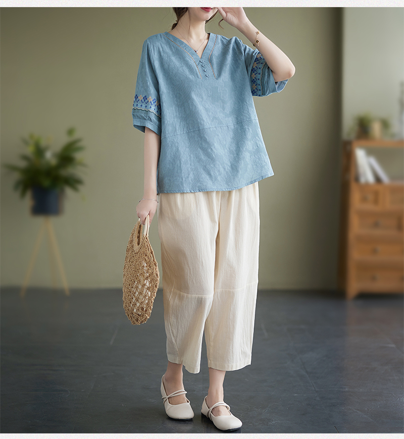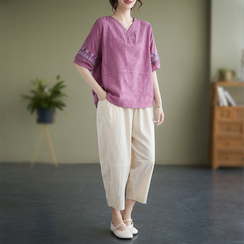 RY228# 实拍妈妈装夏款棉麻文艺宽松中袖V领上衣短袖T恤+阔腿裤两件套女