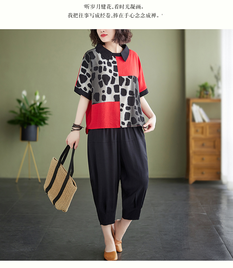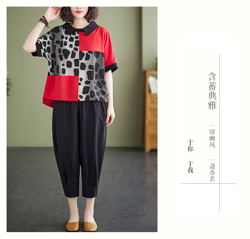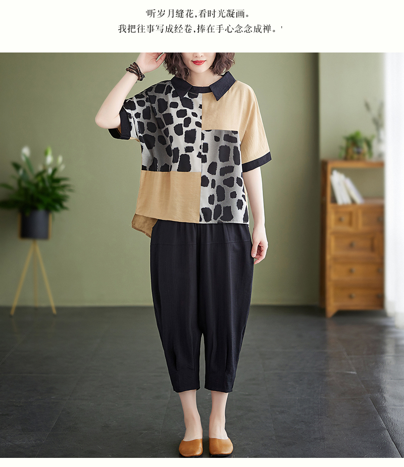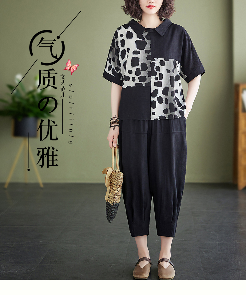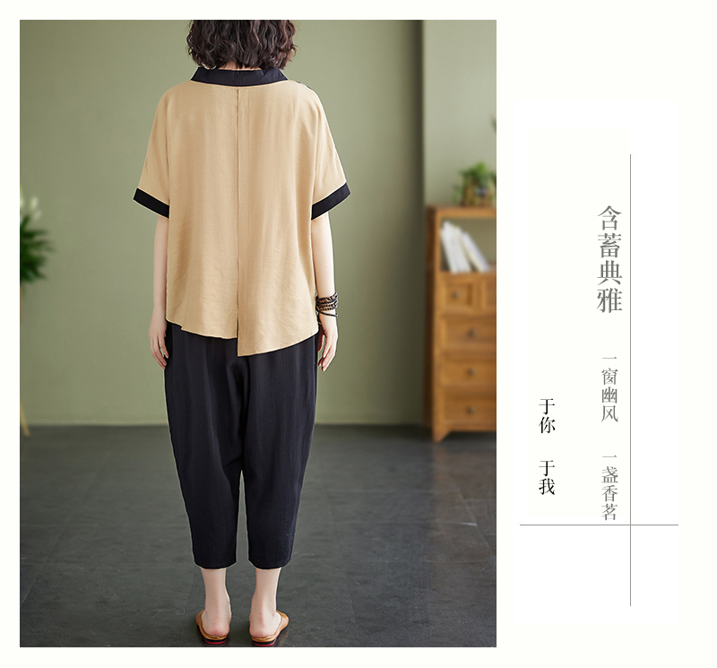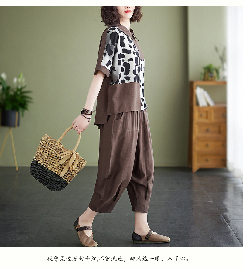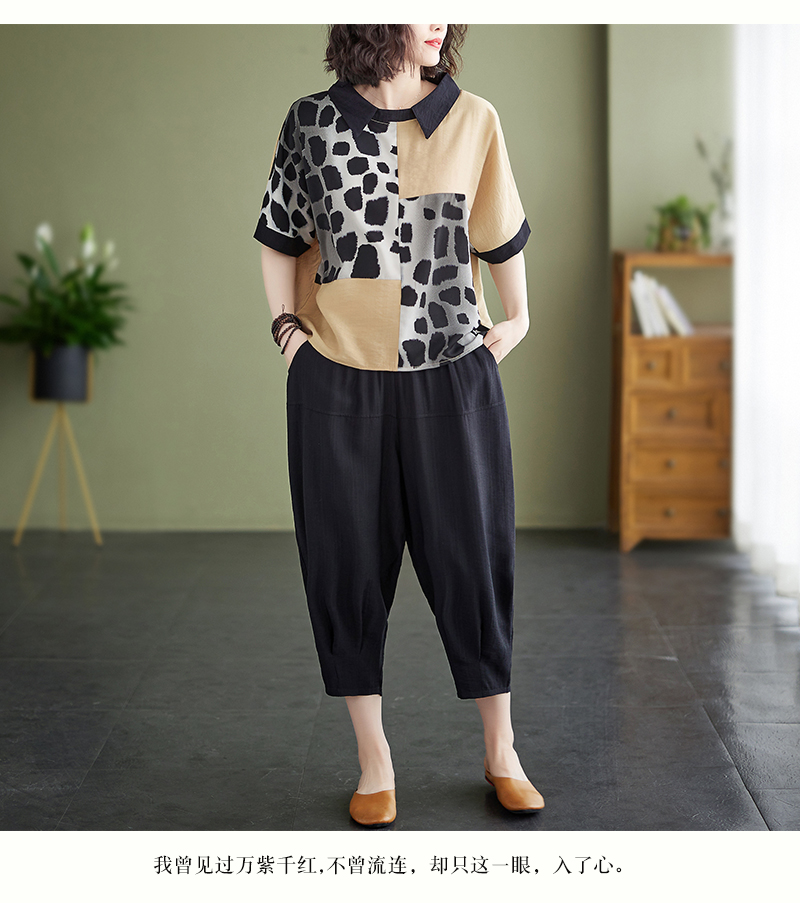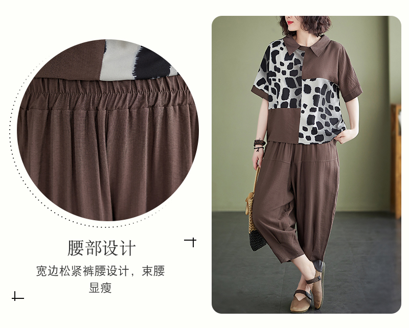 RY230# 实拍夏季新款文艺棉麻拼接宽松大码上衣+松紧腰阔腿裤两件套