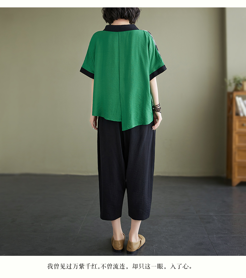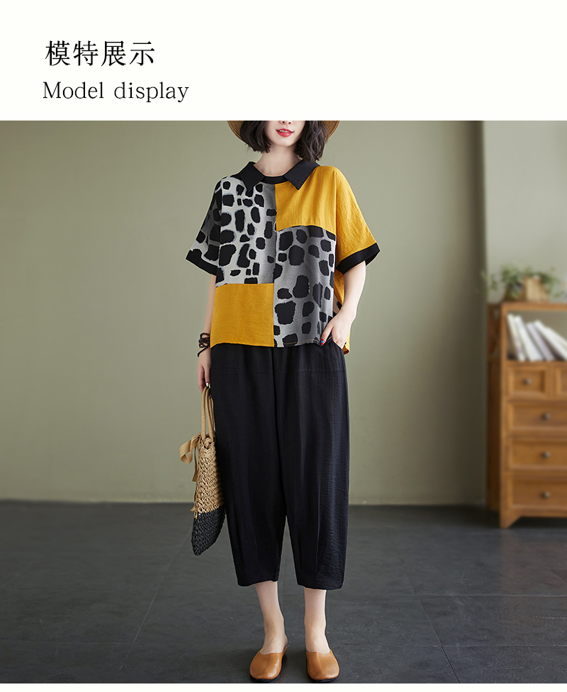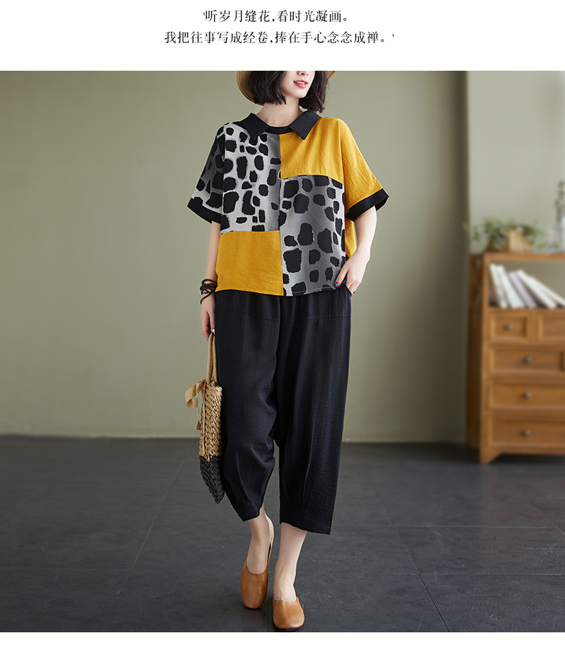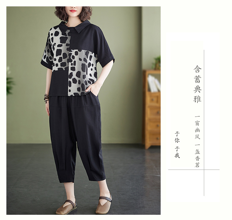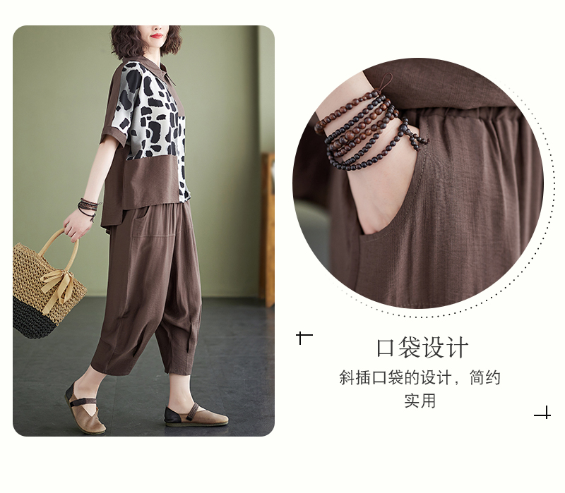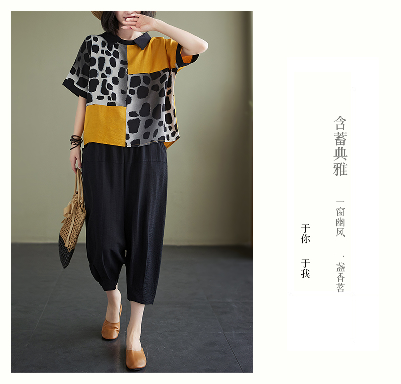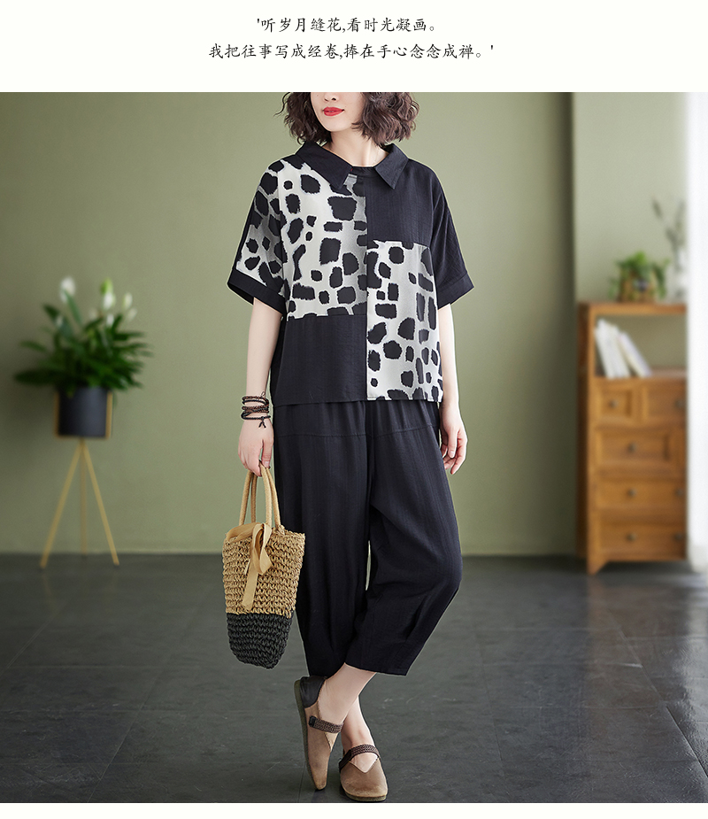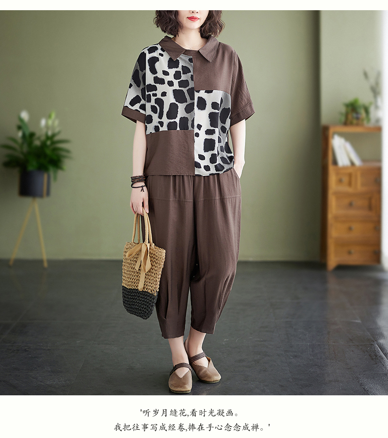 RY230# 实拍夏季新款文艺棉麻拼接宽松大码上衣+松紧腰阔腿裤两件套