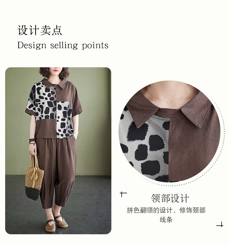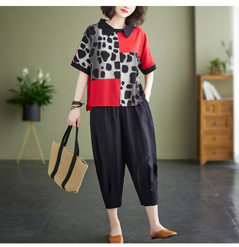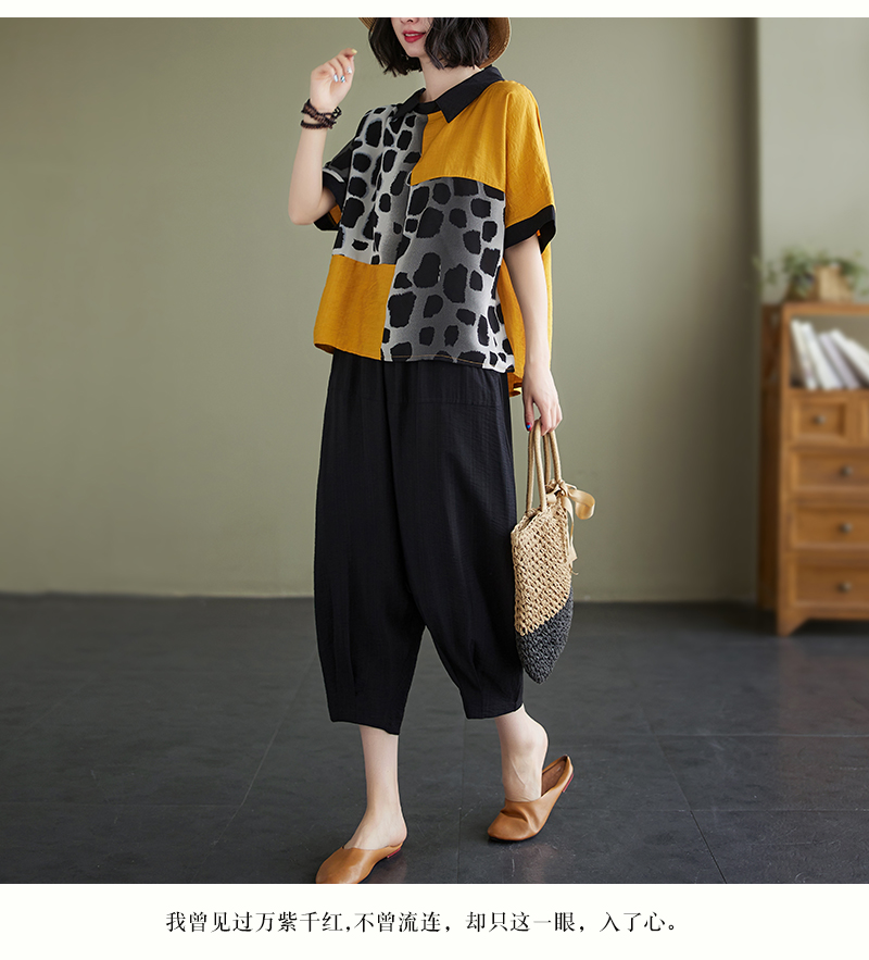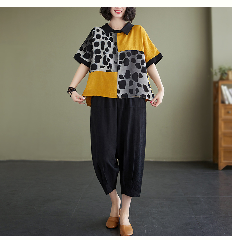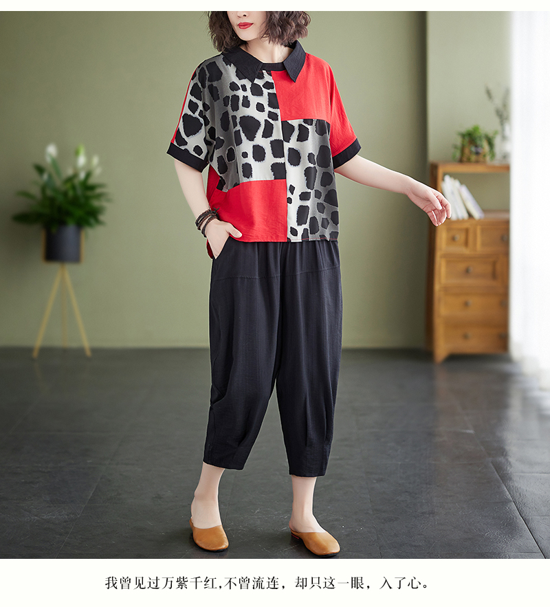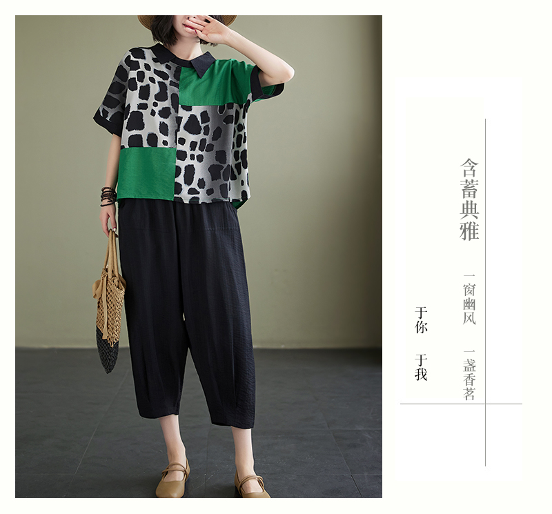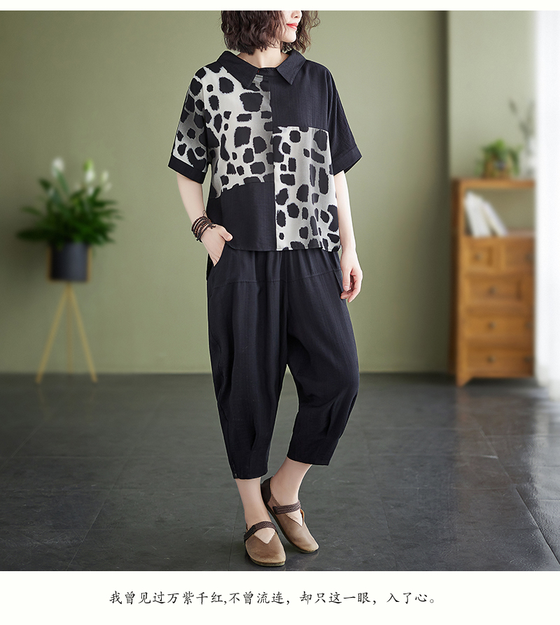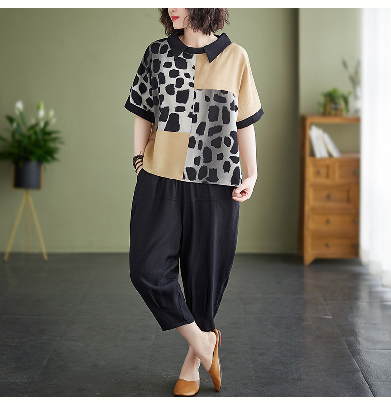 RY230# 实拍夏季新款文艺棉麻拼接宽松大码上衣+松紧腰阔腿裤两件套