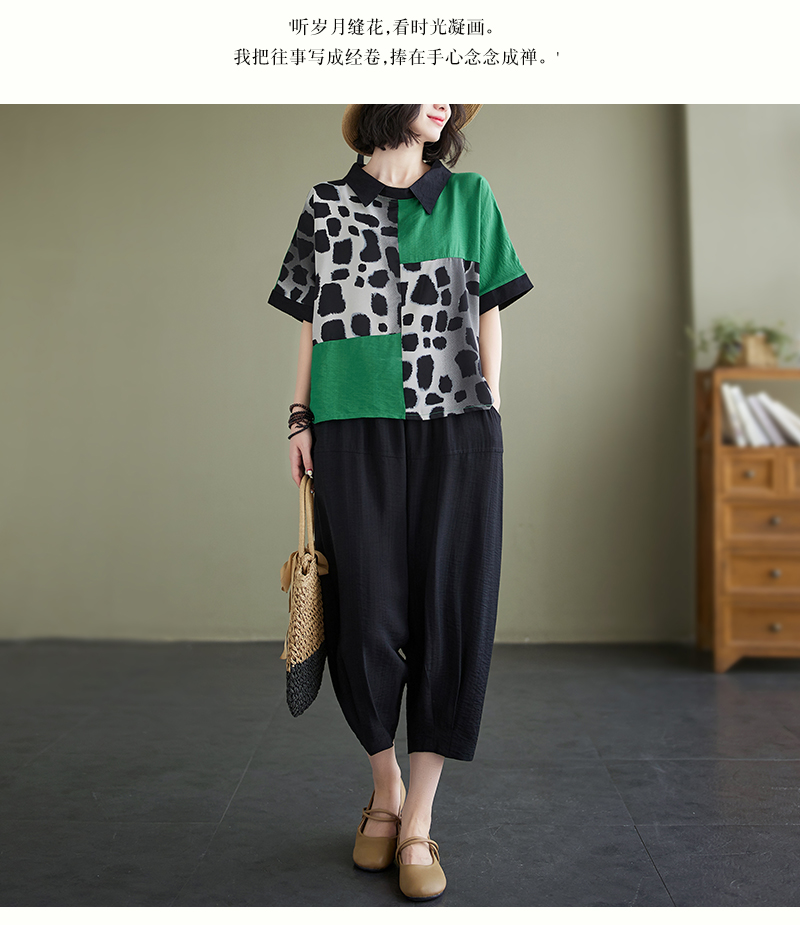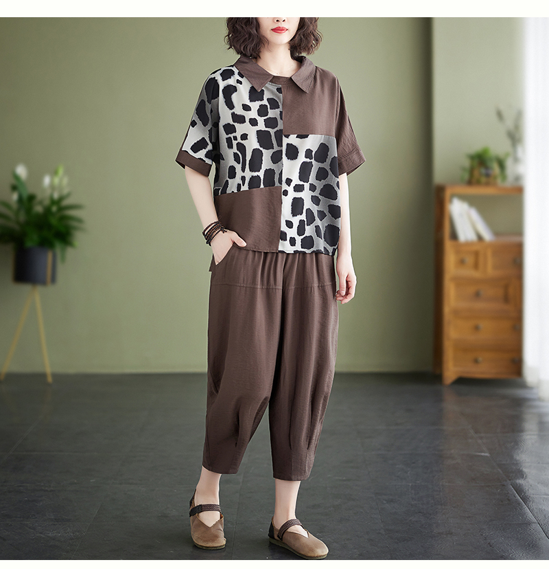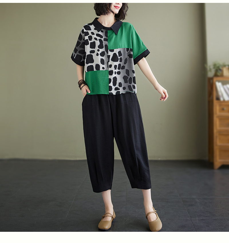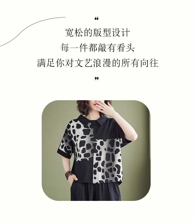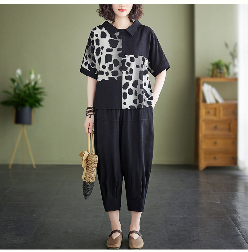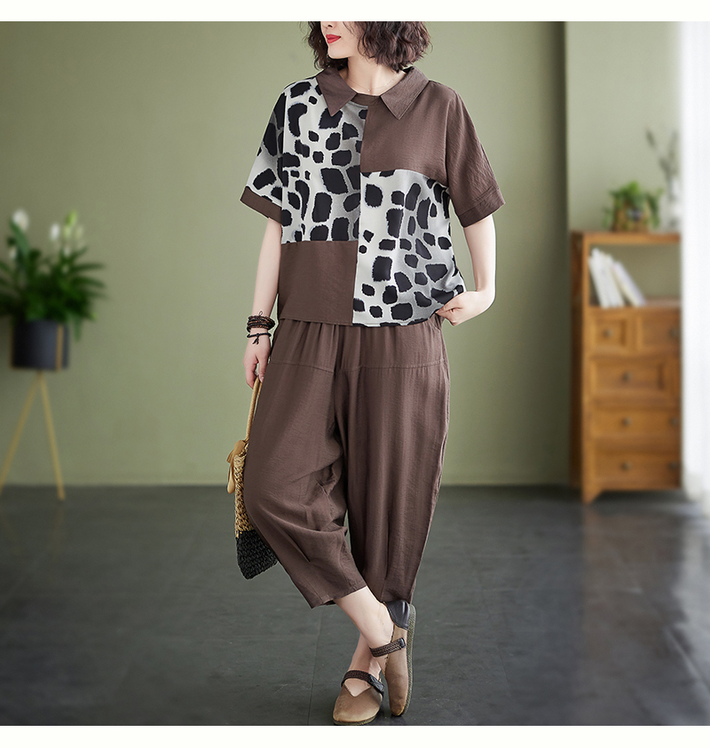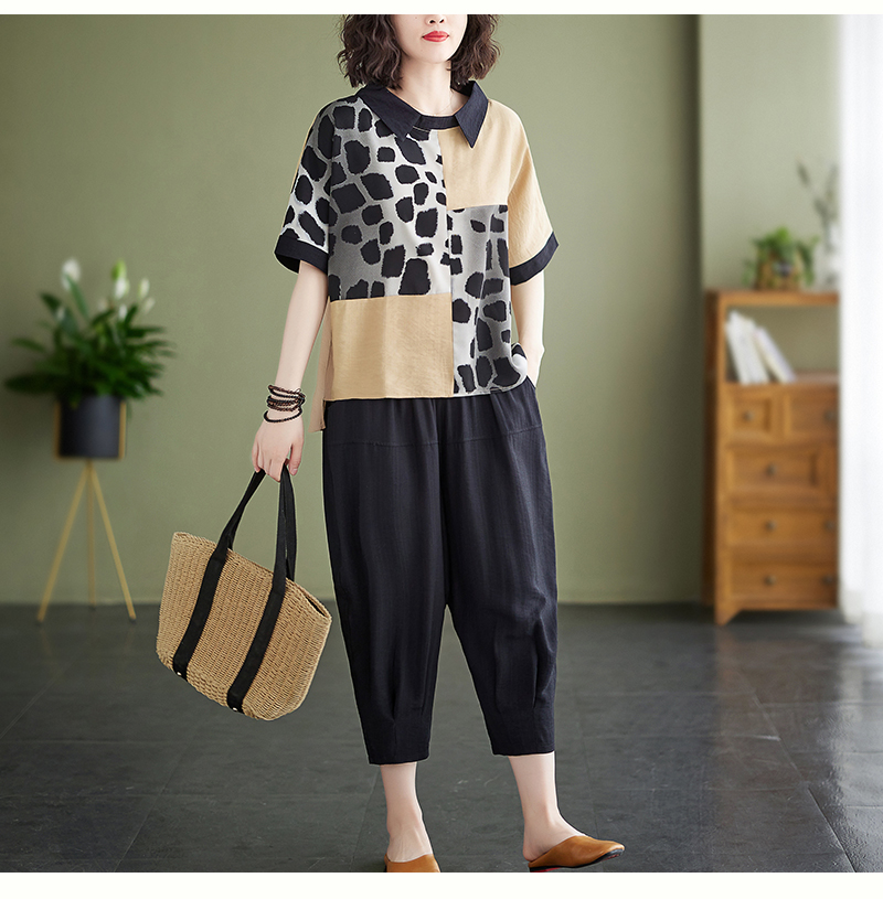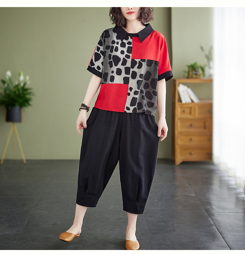 RY230# 实拍夏季新款文艺棉麻拼接宽松大码上衣+松紧腰阔腿裤两件套
