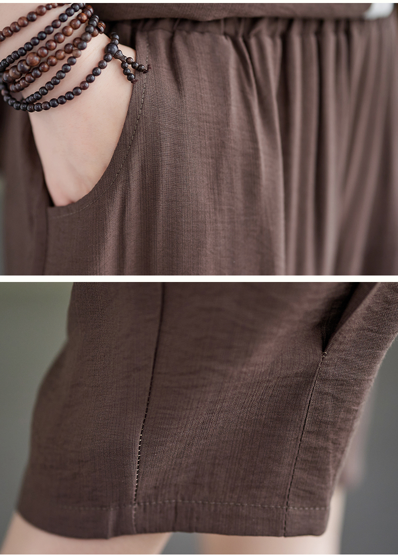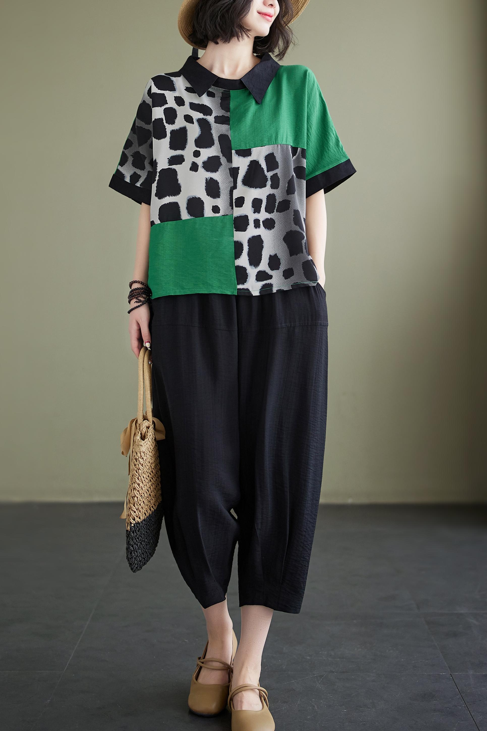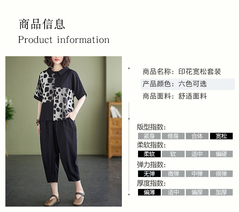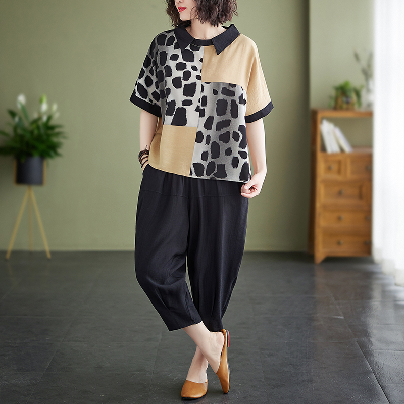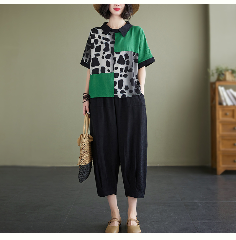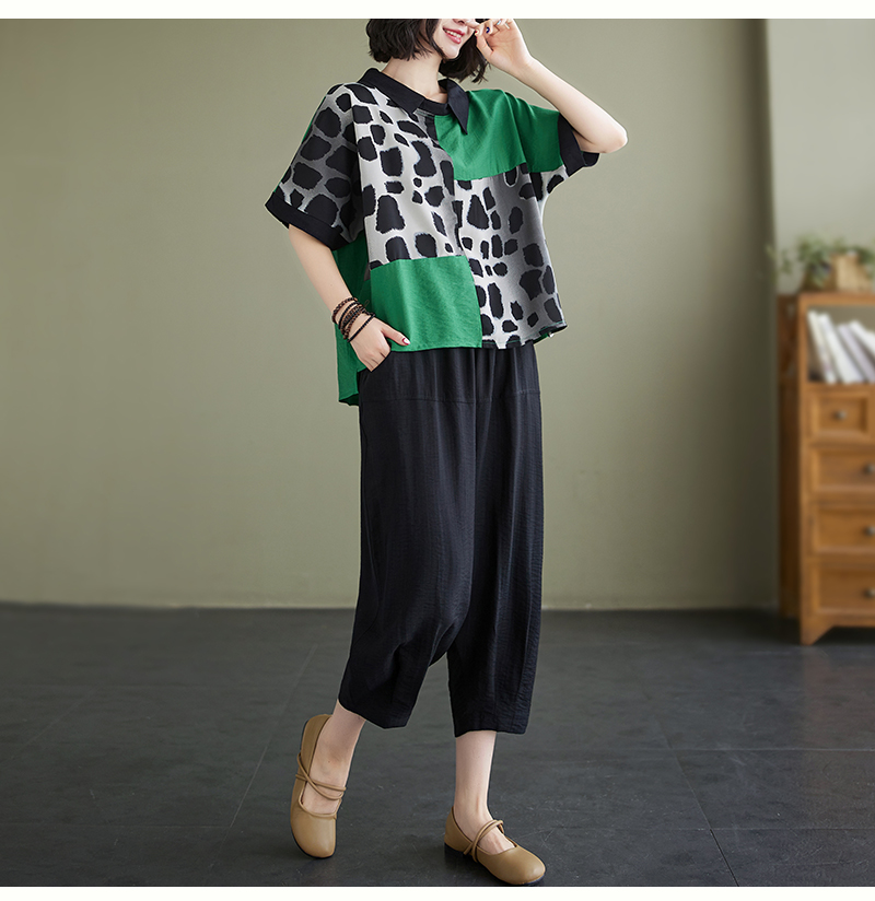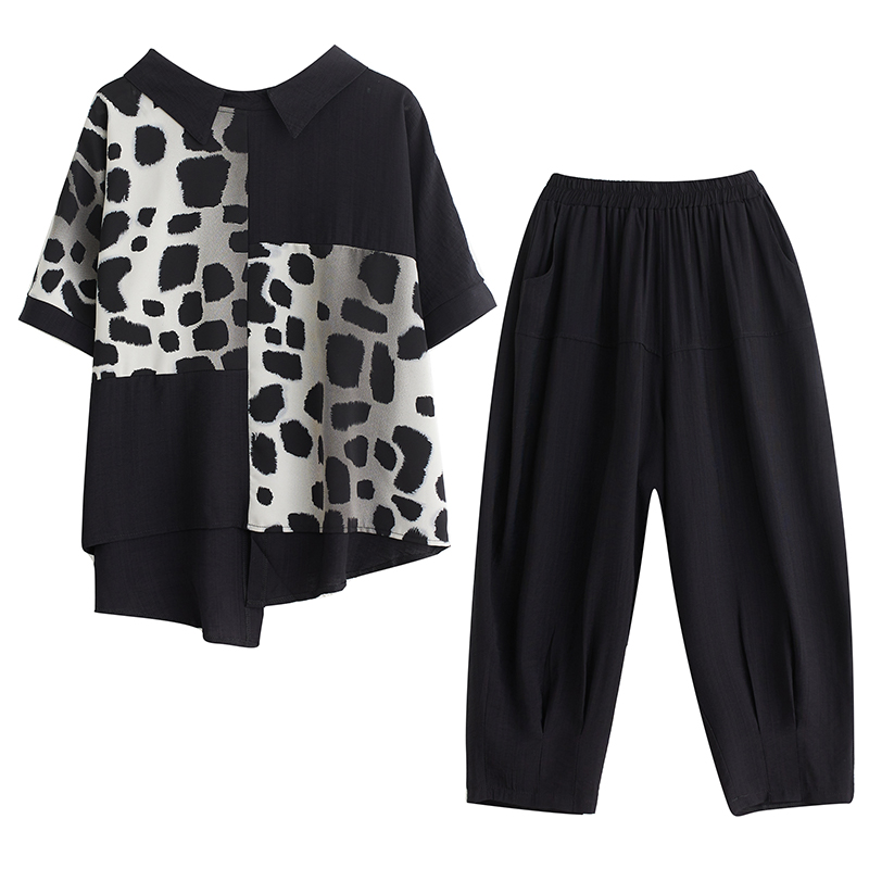 RY230# 实拍夏季新款文艺棉麻拼接宽松大码上衣+松紧腰阔腿裤两件套