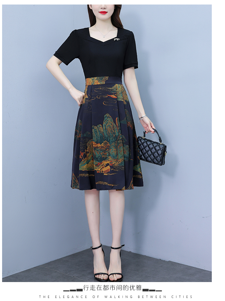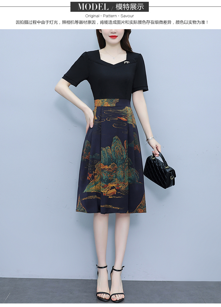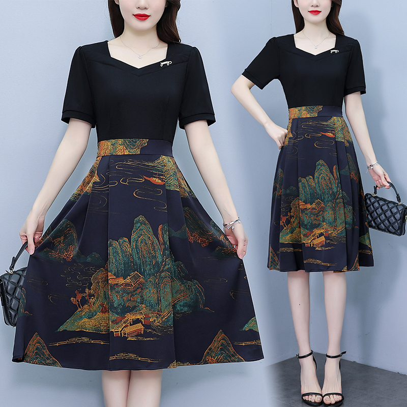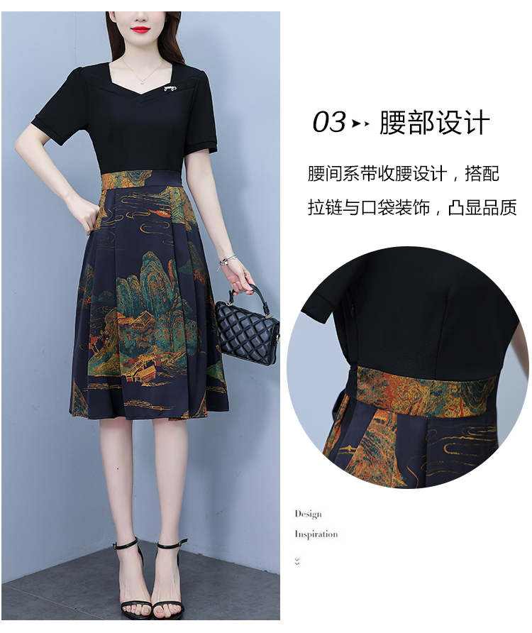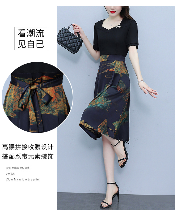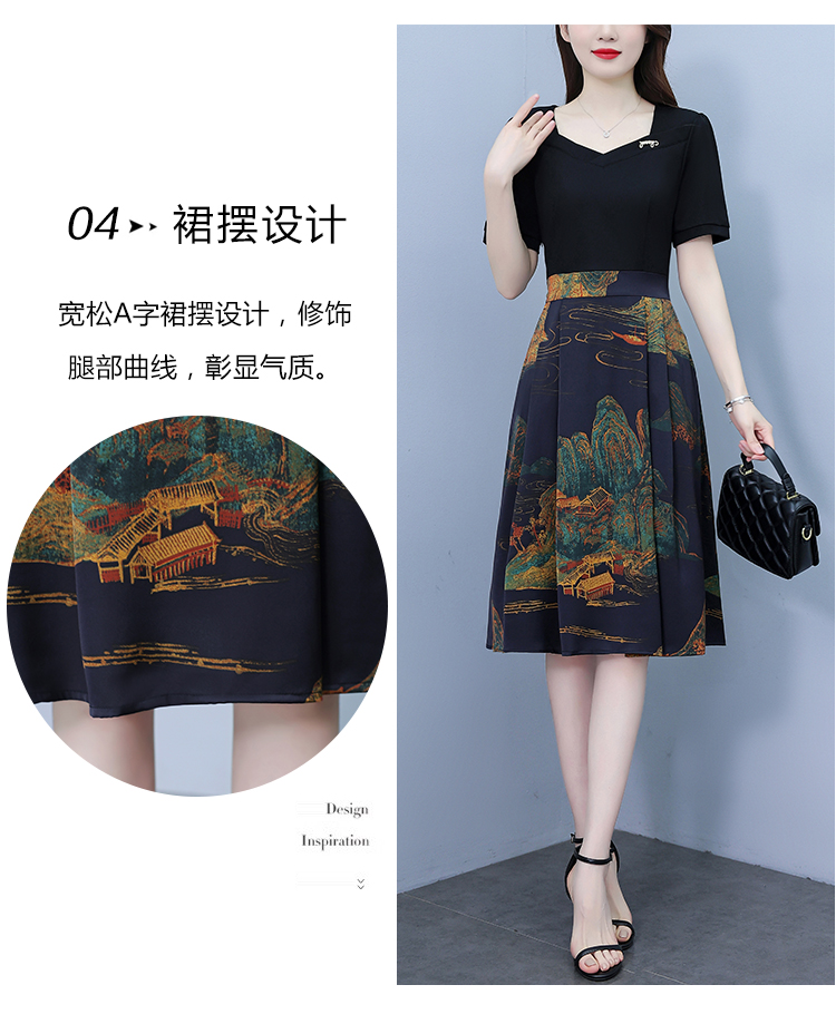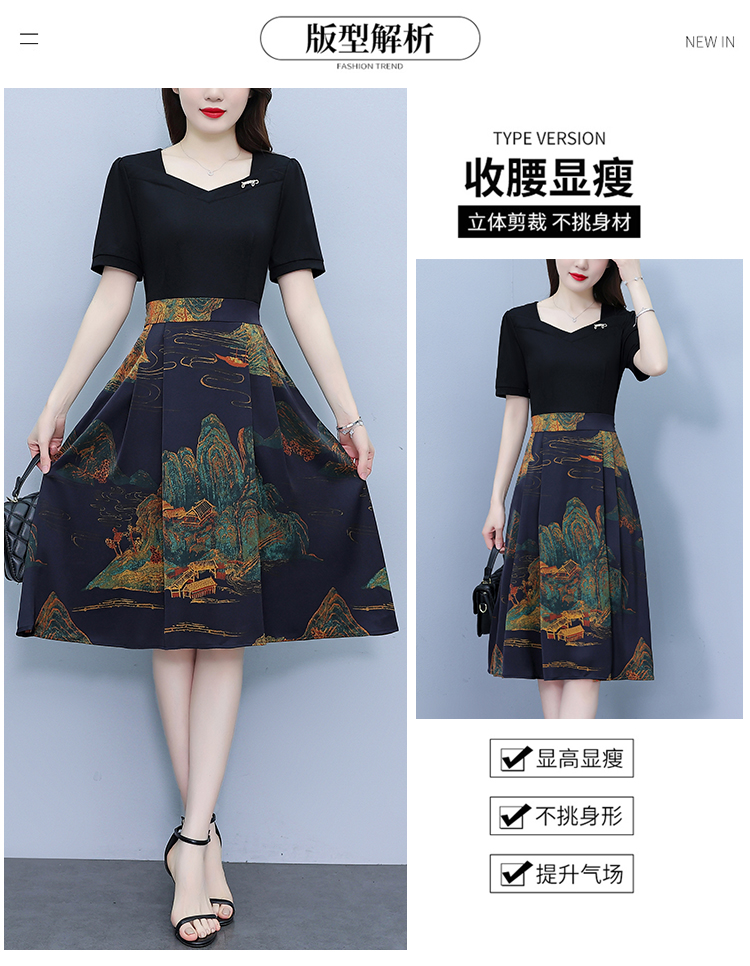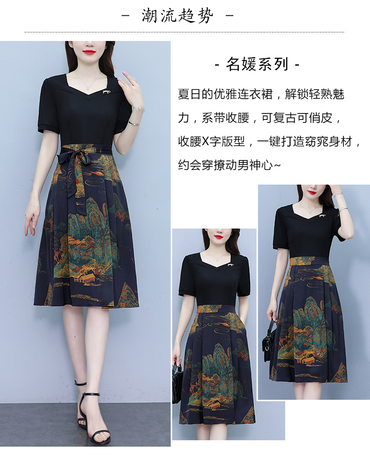 RY263#连衣裙女短袖2026夏装新款收腰显瘦时尚A字裙假两件拼接中长裙子