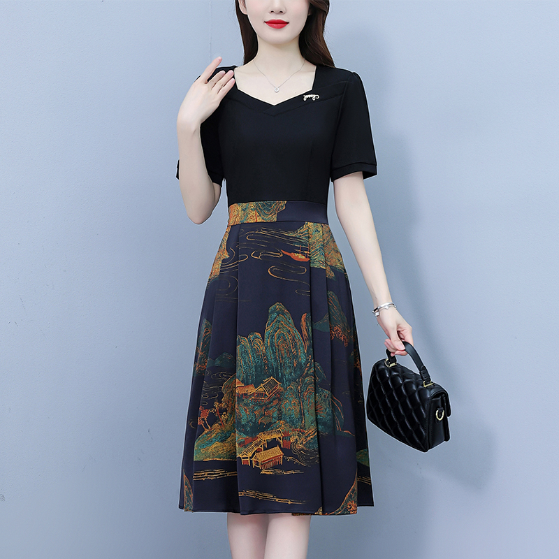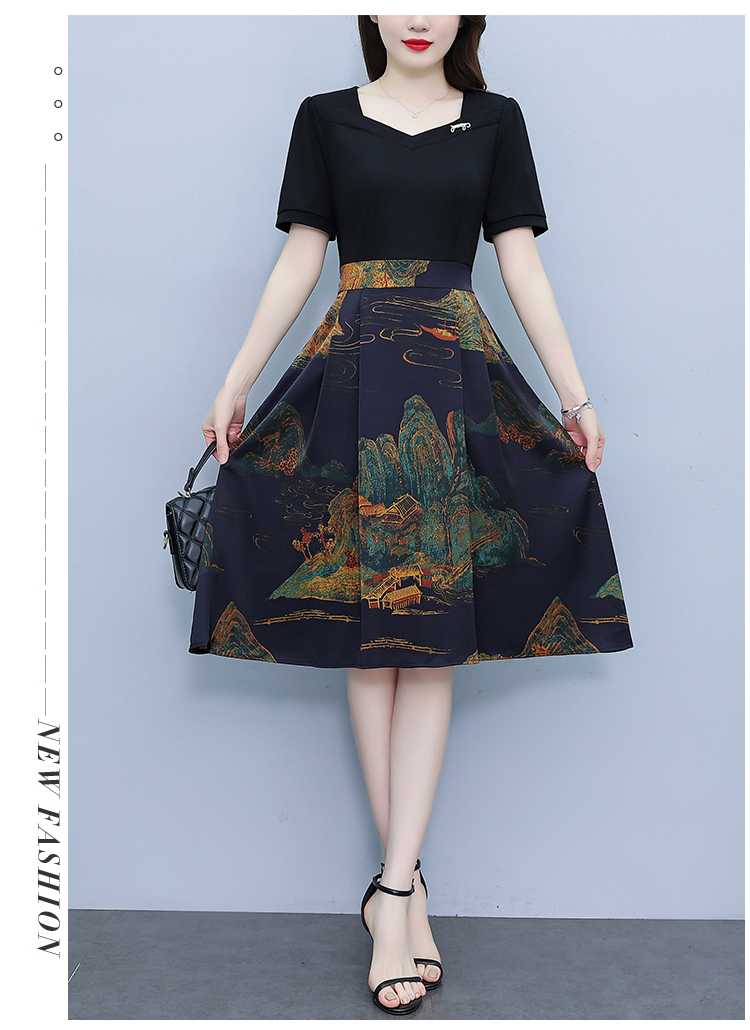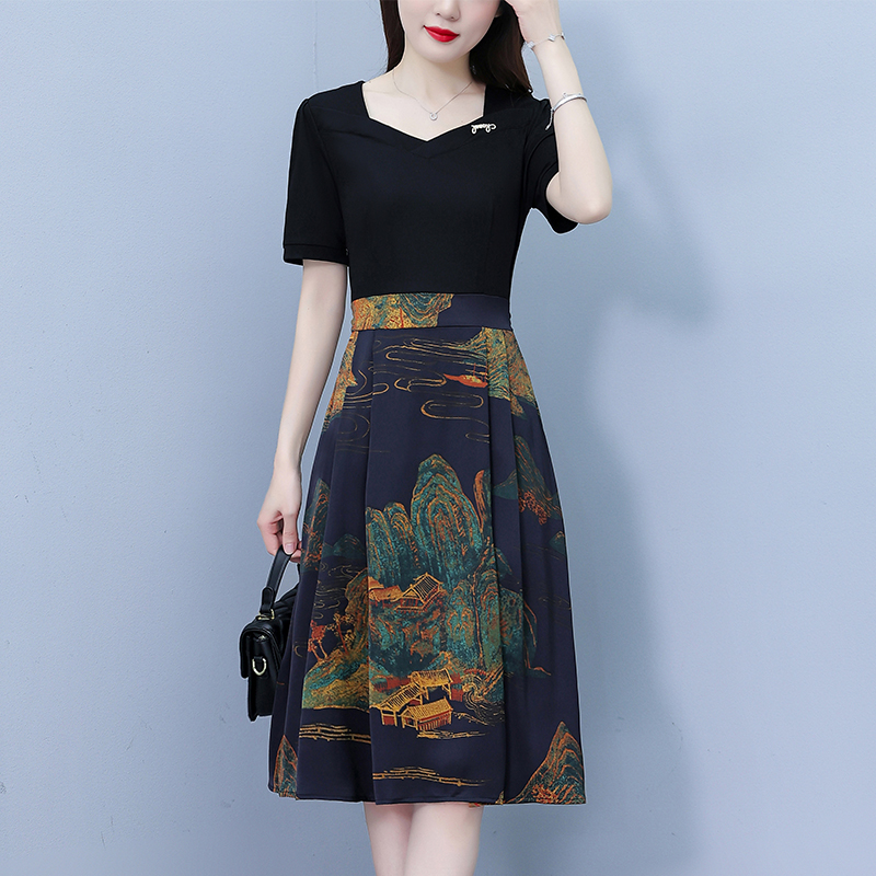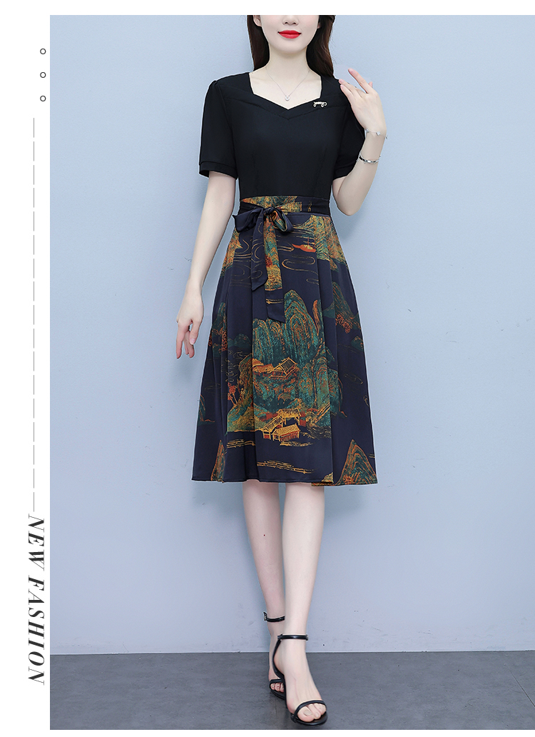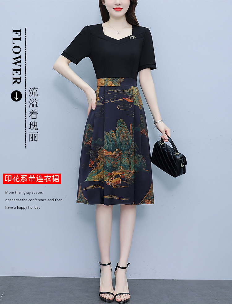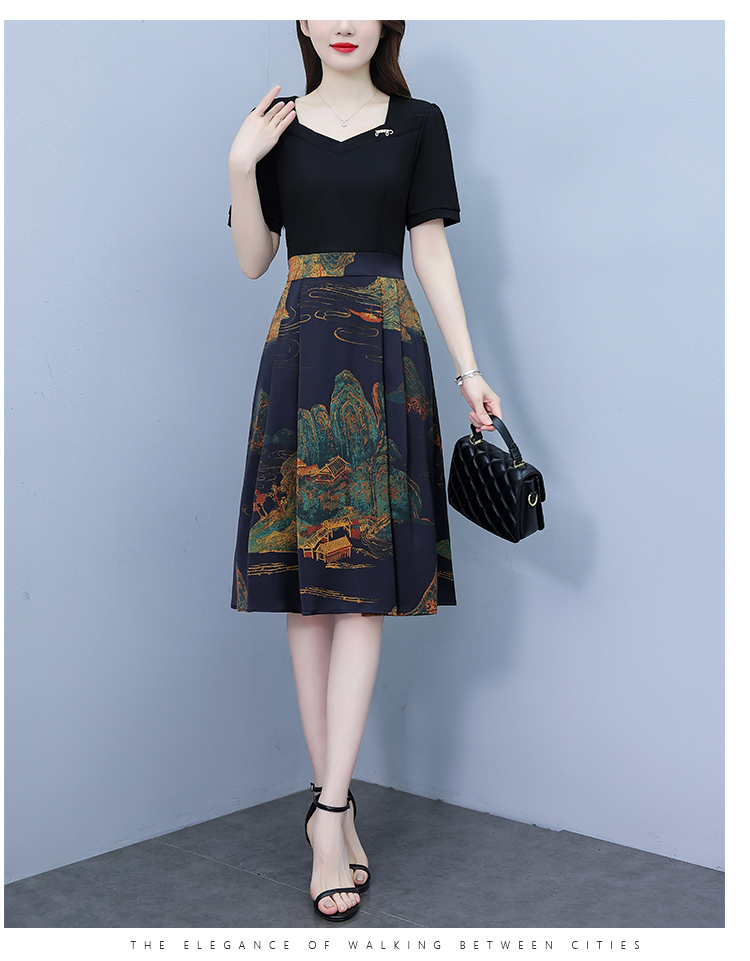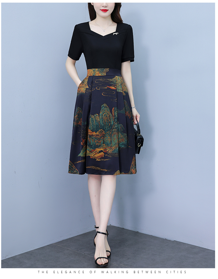 RY263#连衣裙女短袖2026夏装新款收腰显瘦时尚A字裙假两件拼接中长裙子