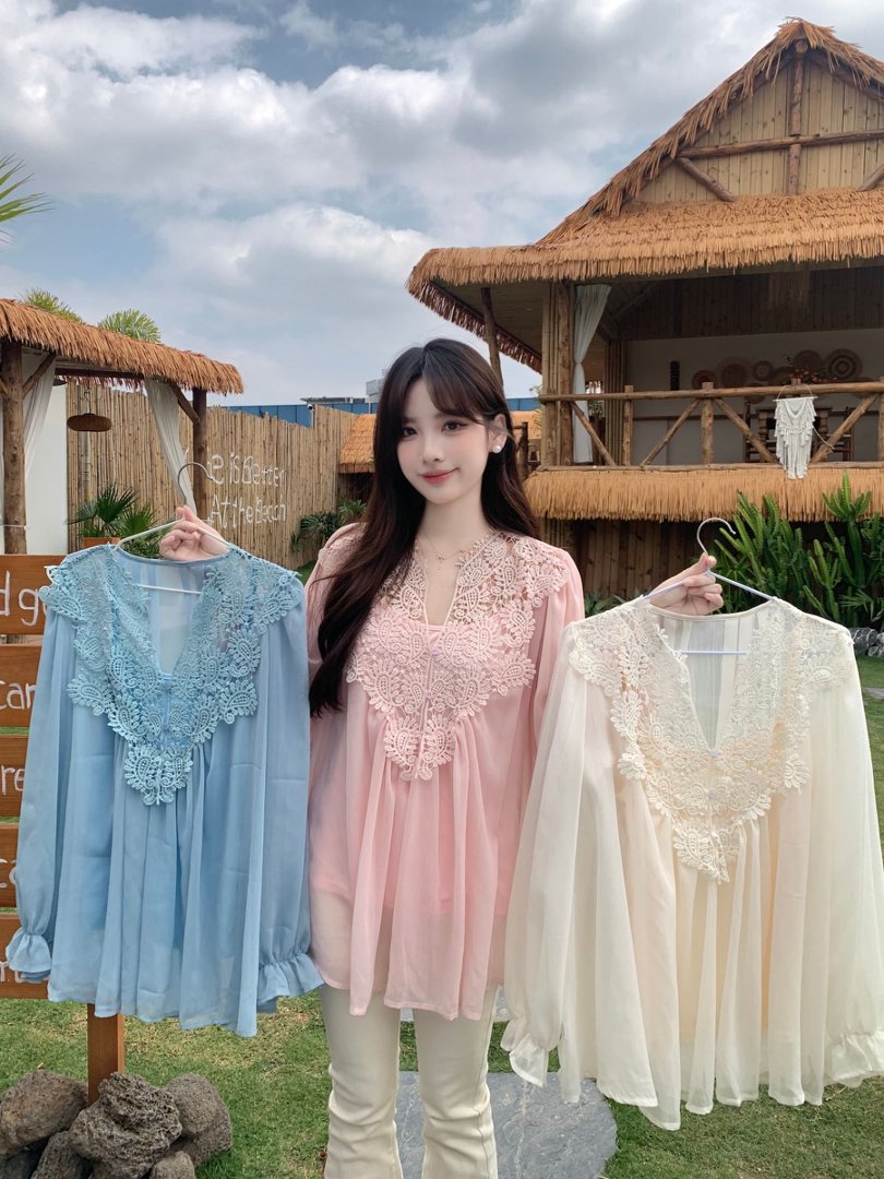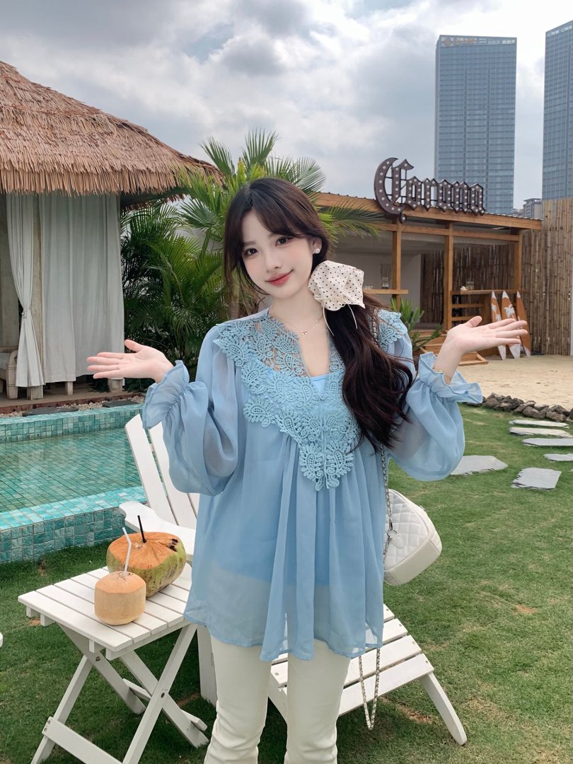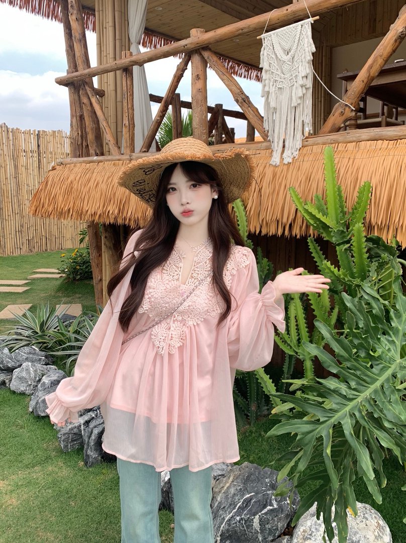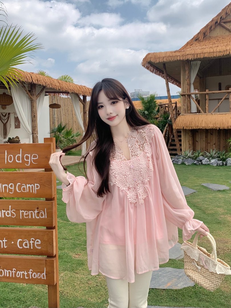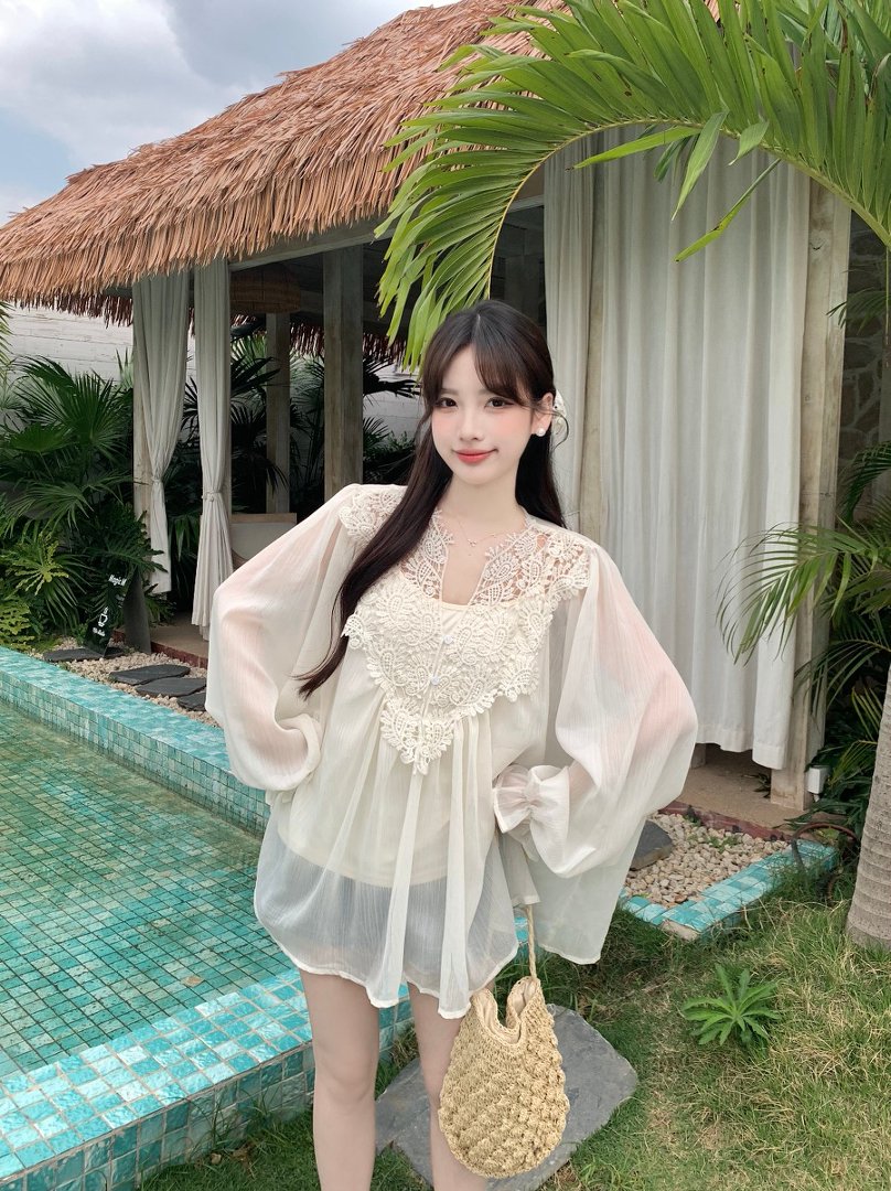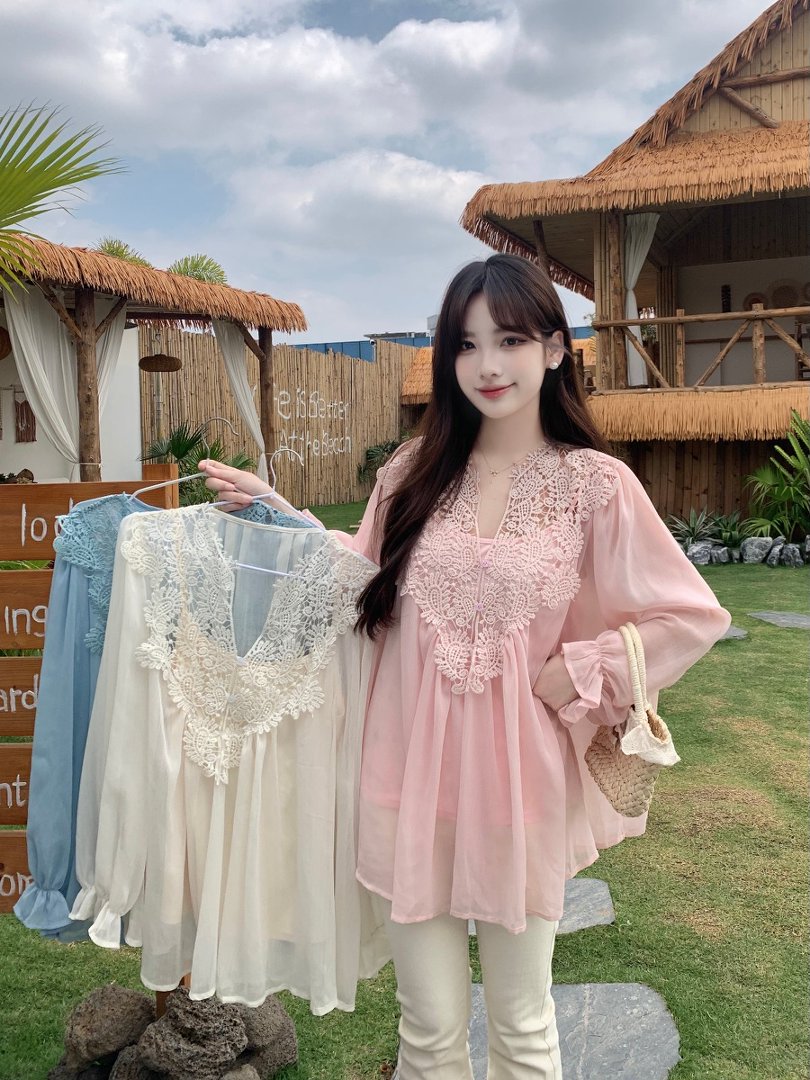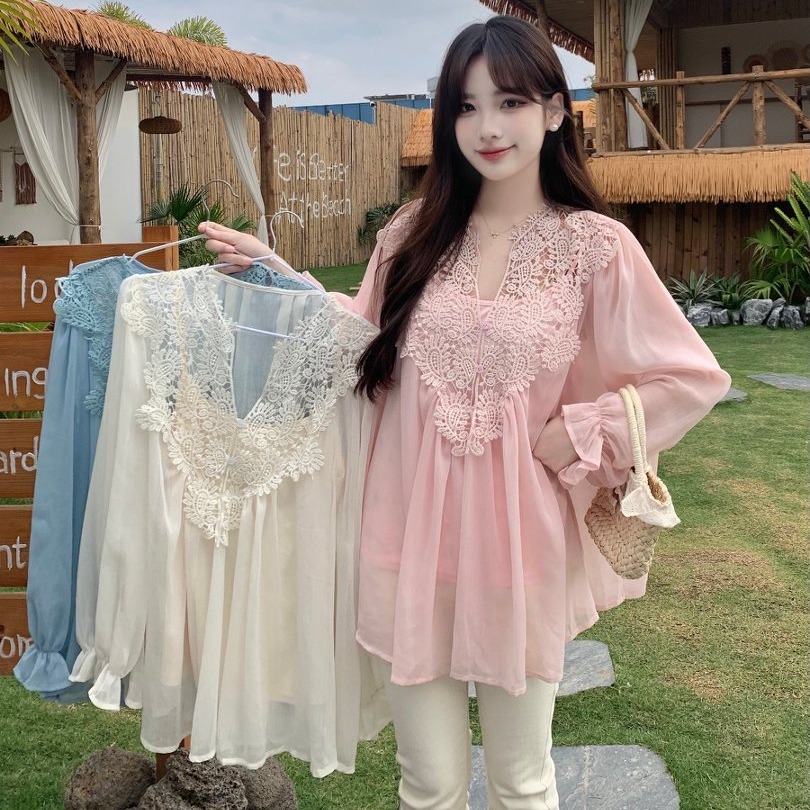 RY2047# 大码复古优雅立体钩花蕾丝拼接雪纺衫小衫吊带背心套装女宽松上衣